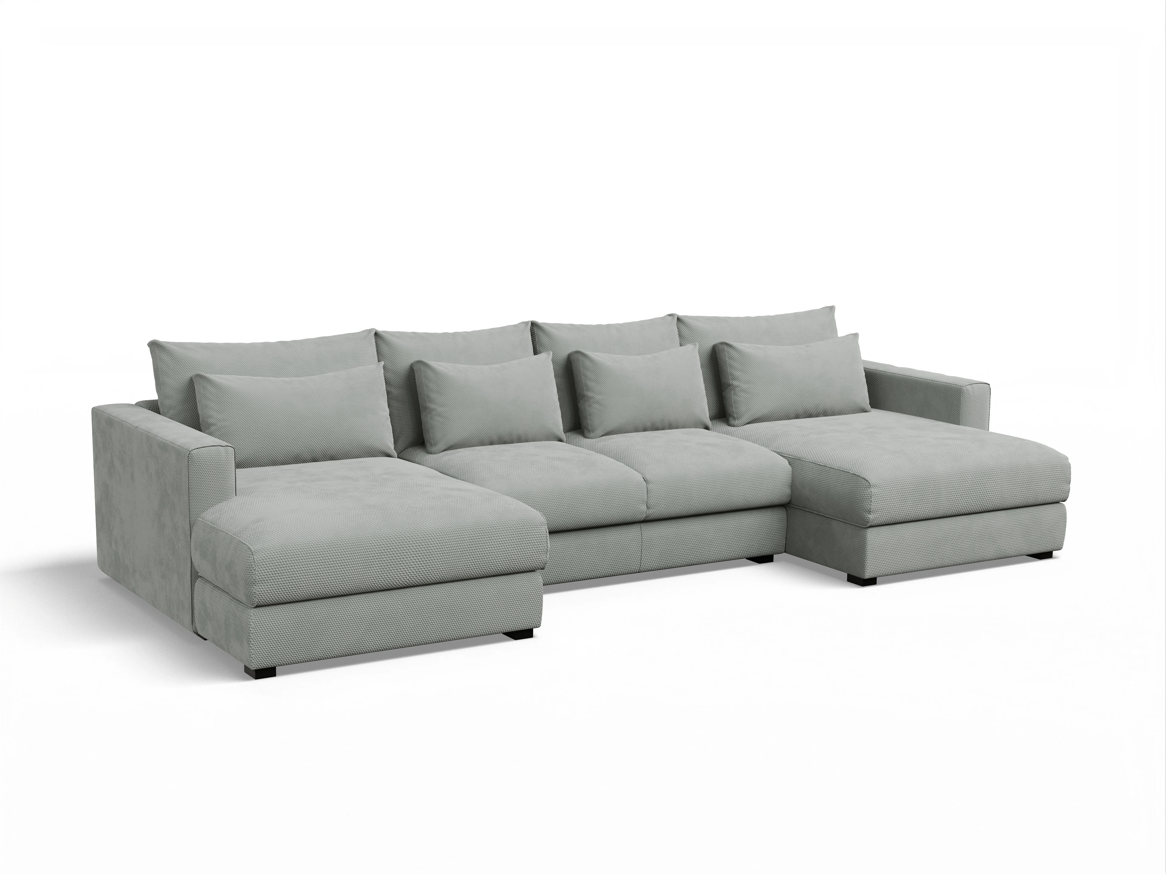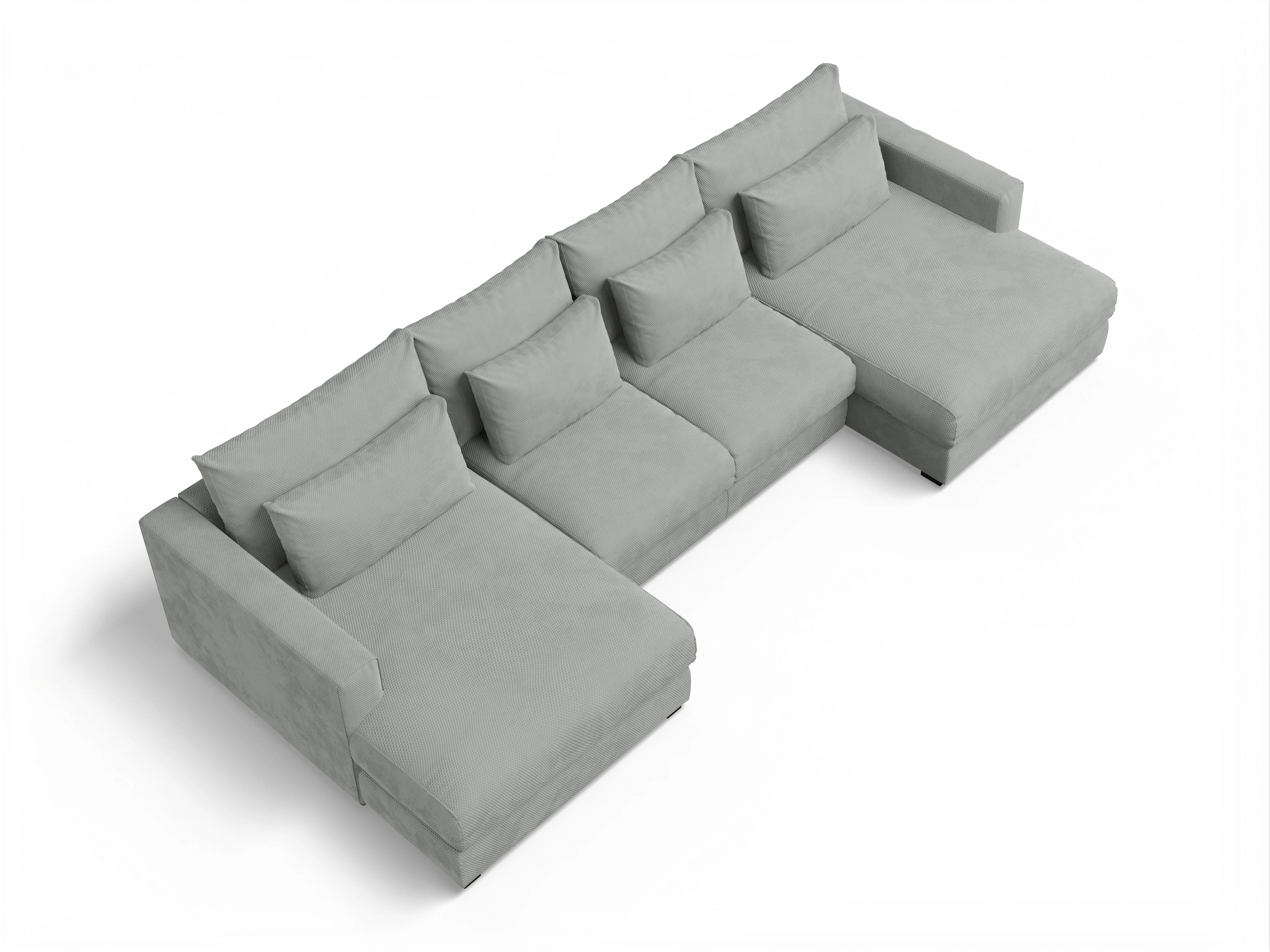 Die Butler Wohnlandschaft besteht aus einem Divan mit Armlehne links, einem 2-Sitzer mittig und einem Divan mit Armlehne rechts. Der 2-Sitzer kommt mit zwei Rücken- und Nierenkissen und die Divane mit je einem Rücken- und Nierenkissen.