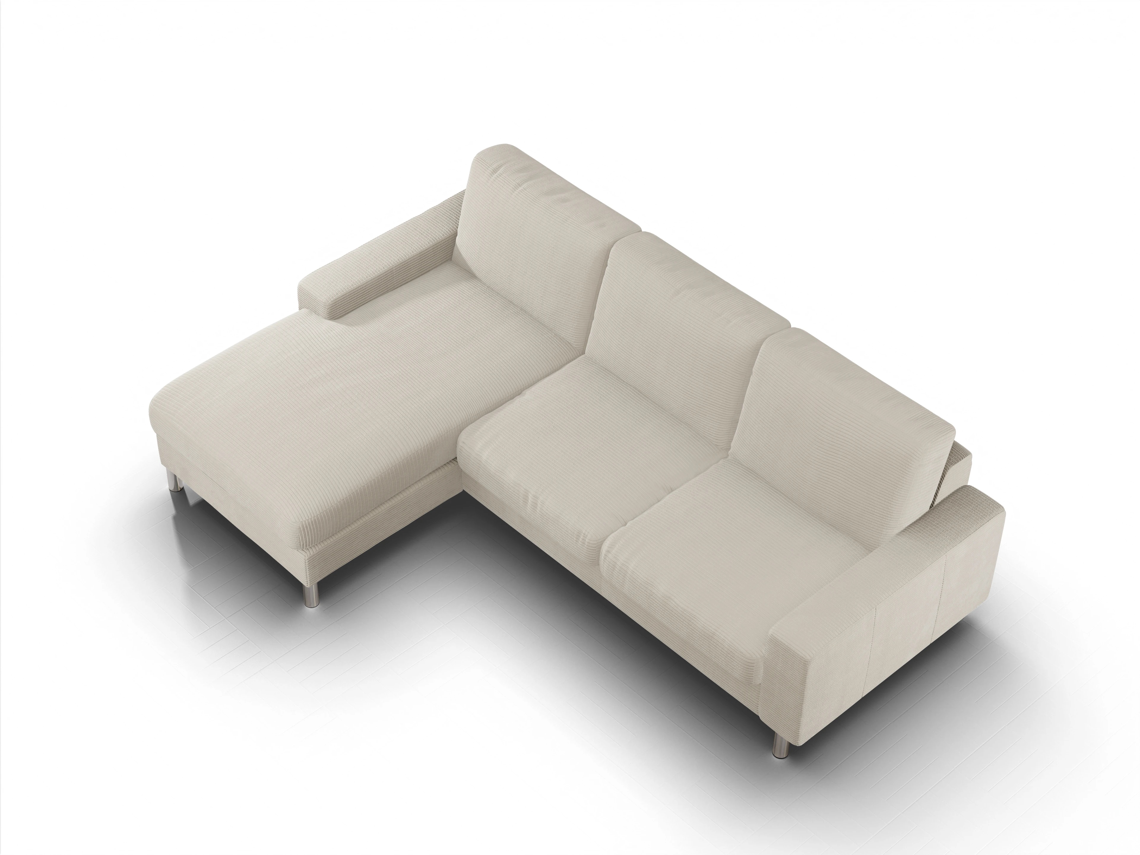 Das Campo Ecksofa setzt sich aus einem Longchair mit Armlehne links und einem 2-Sitzer mit Armlehne rechts zusammen.