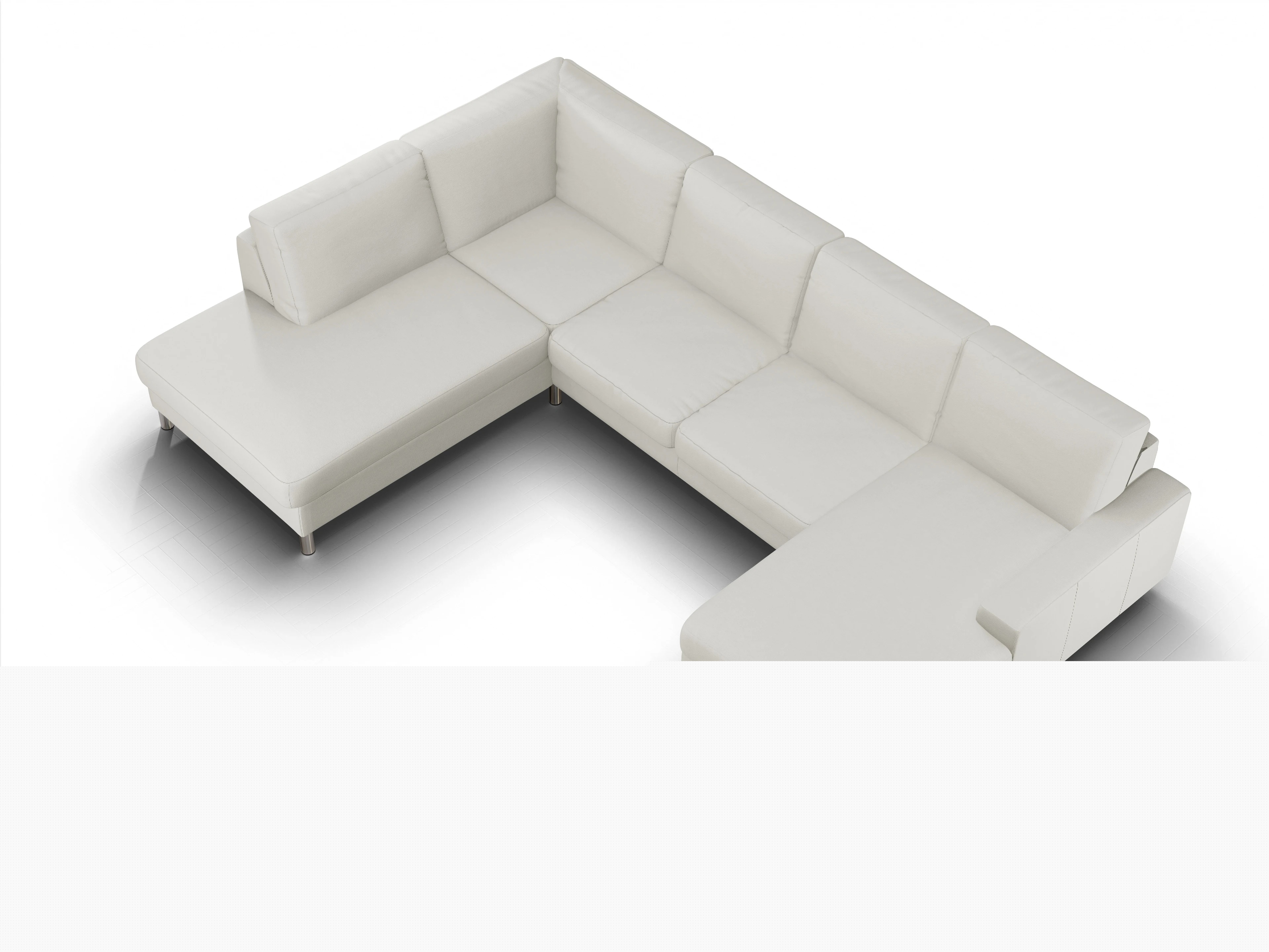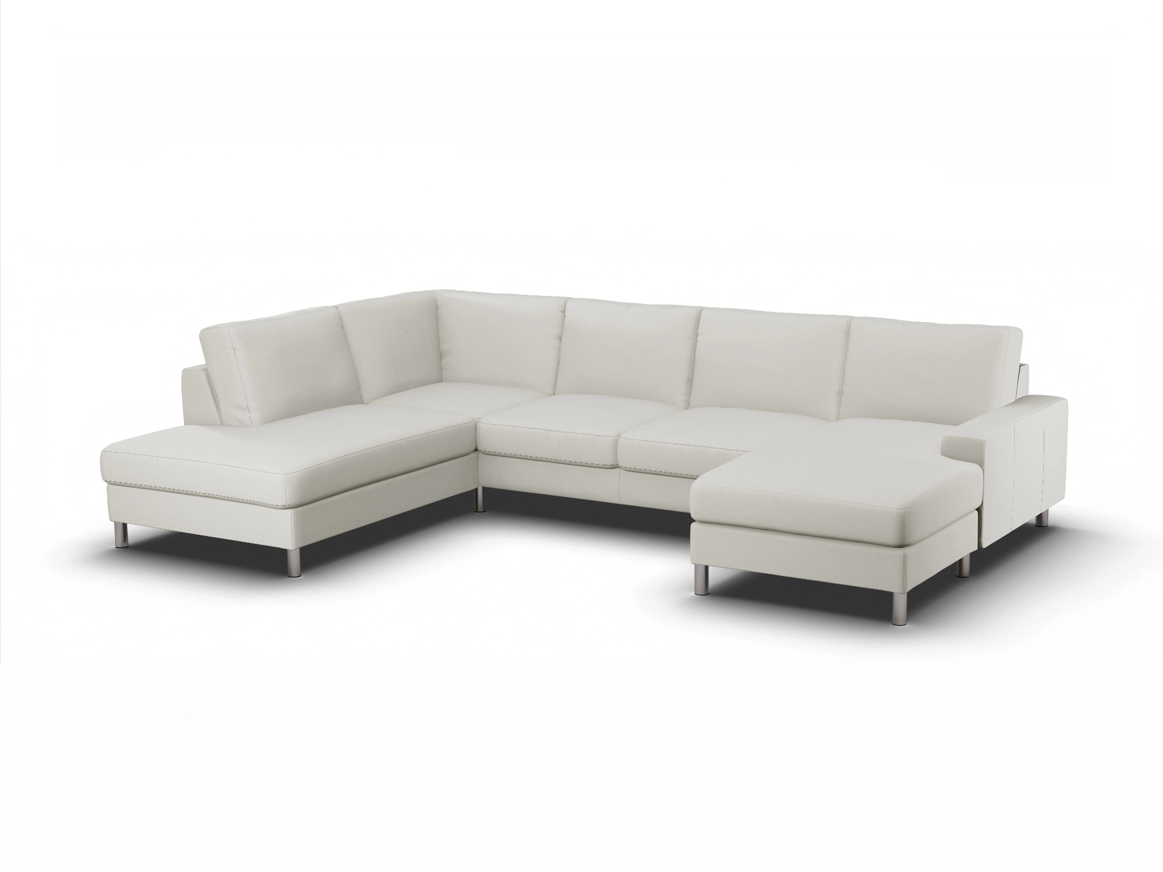Die Campo Wohnlandschaft besteht aus einer Umbauecke links, einem 2-Sitzer ohne Armlehne mittig sowie einem Longchair mit Armlehne rechts.