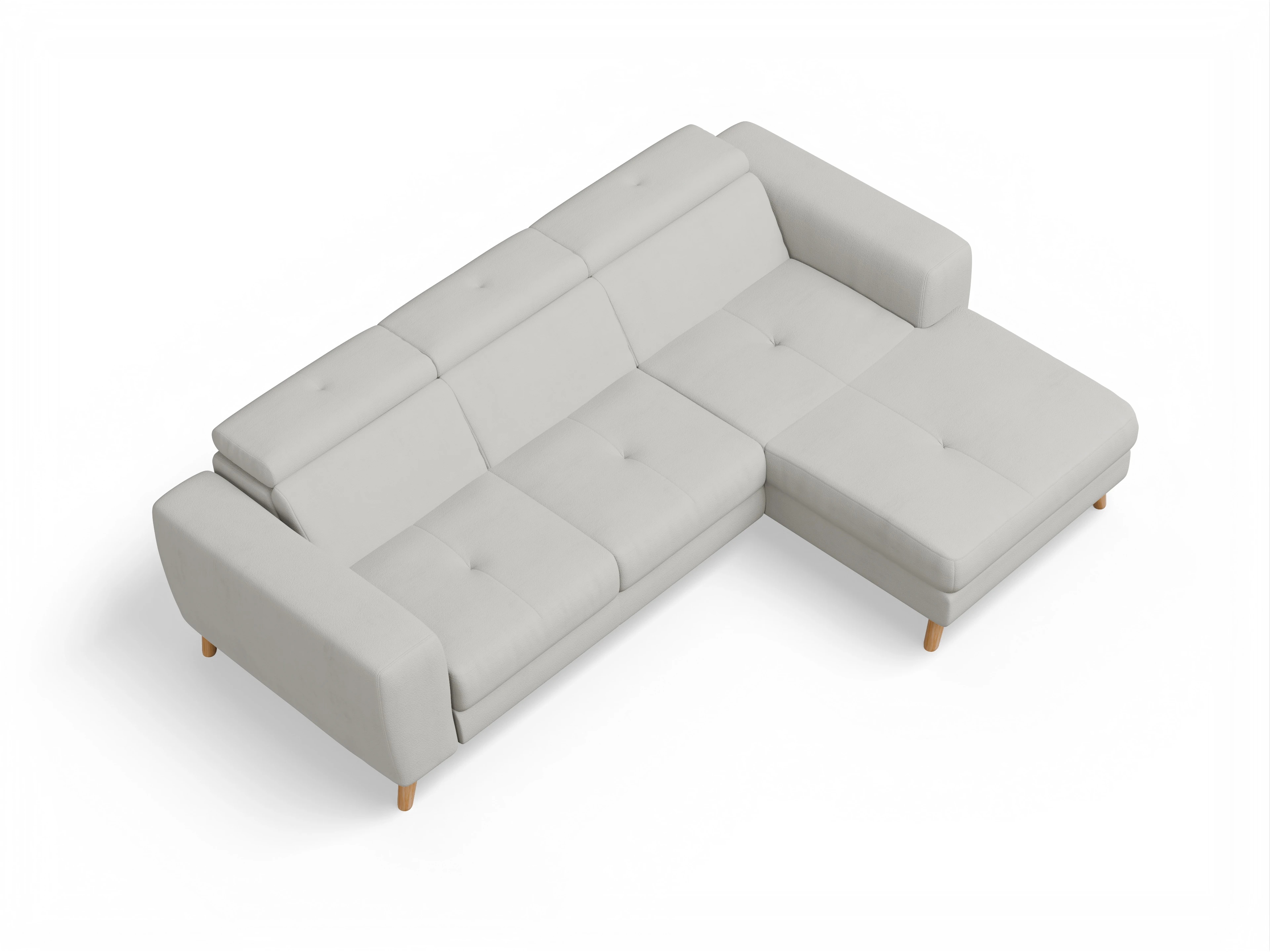 Das Ecksofa besteht aus einem 2-Sitzer mit Armlehne links und einem Longchair mit Armlehne rechts. Das Sofa kommt inklusive 3x Kopfteilverstellung.