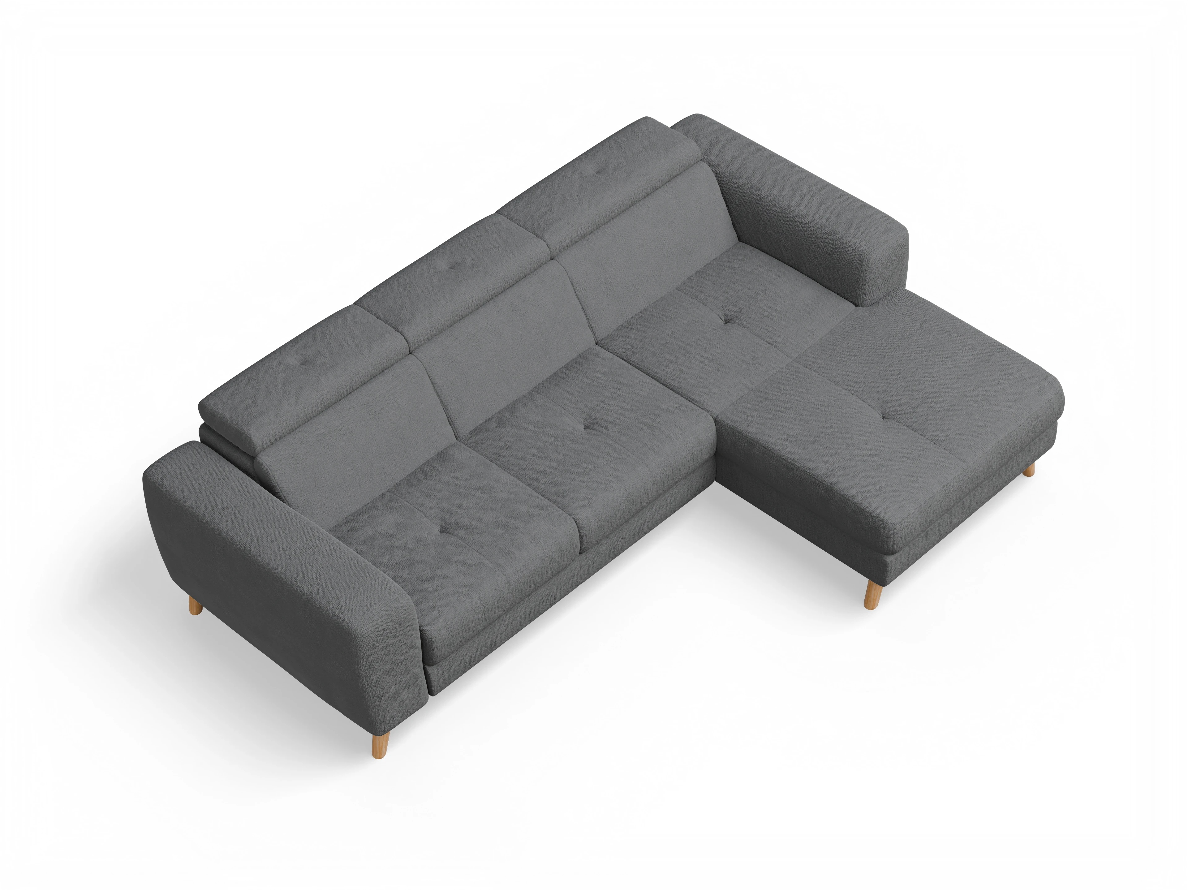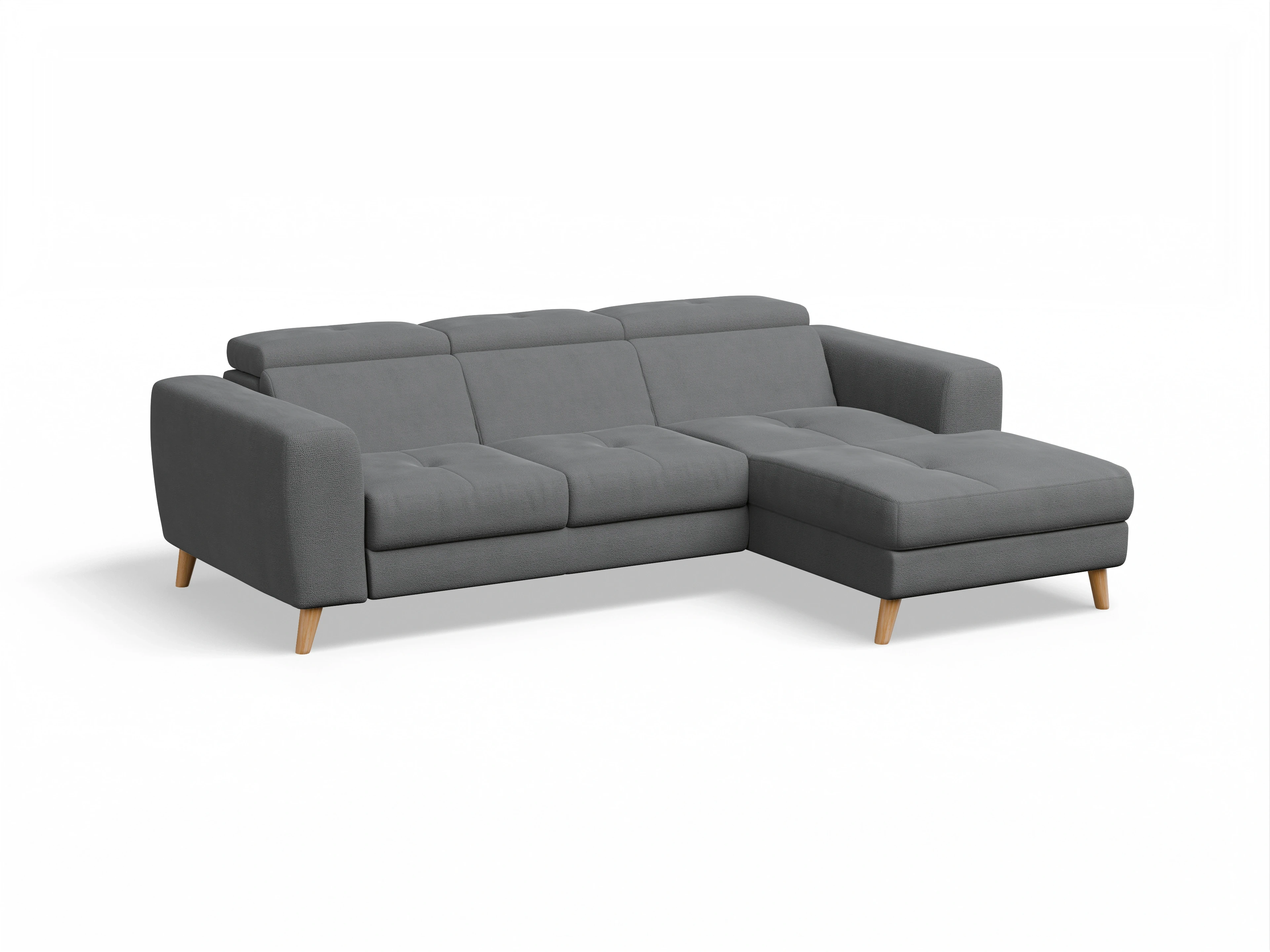 Das Ecksofa besteht aus einem 2-Sitzer mit Armlehne links und einem Longchair mit Armlehne rechts. Das Sofa kommt inklusive 3x Kopfteilverstellung.