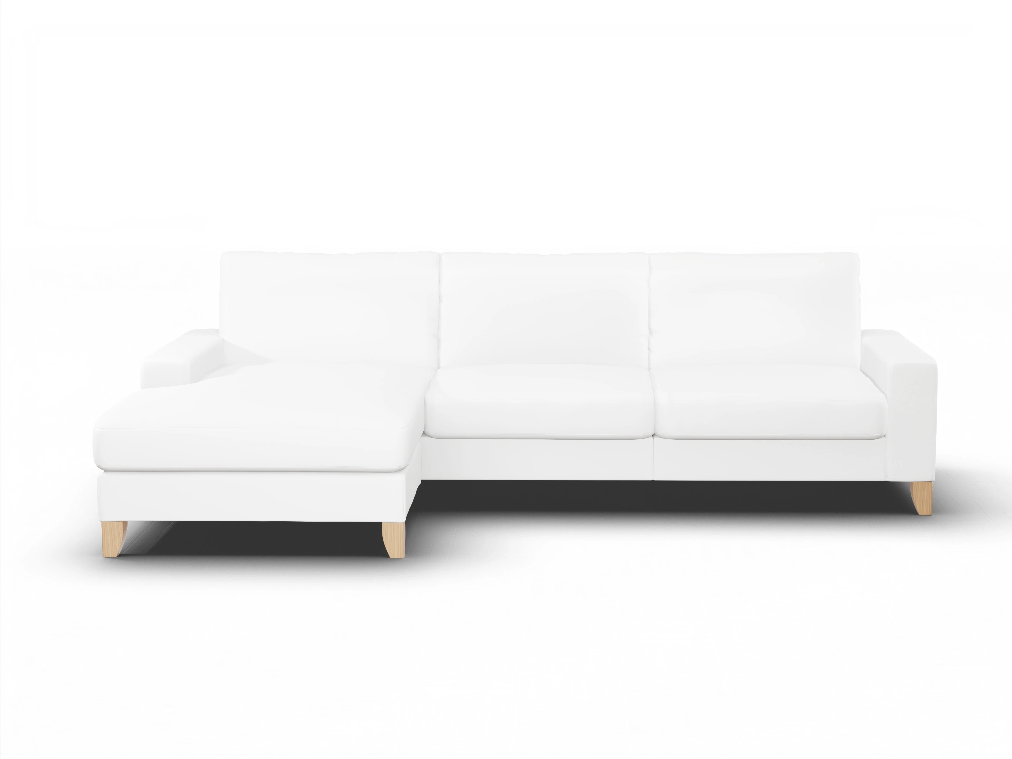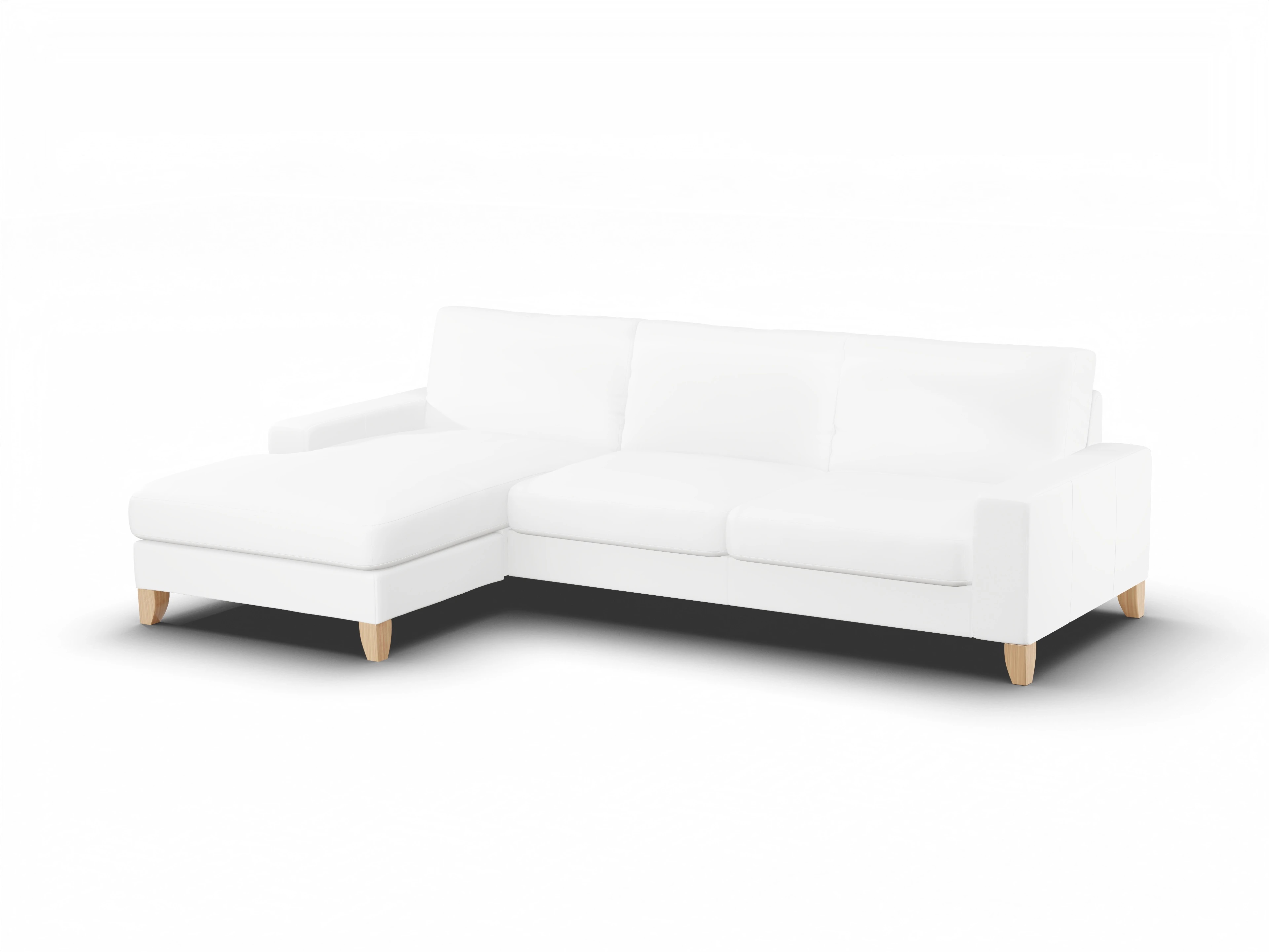 Das Casco Ecksofa besteht aus einem Longchair mit Armlehne links und einem 3-Sitzer mit Armlehne rechts.