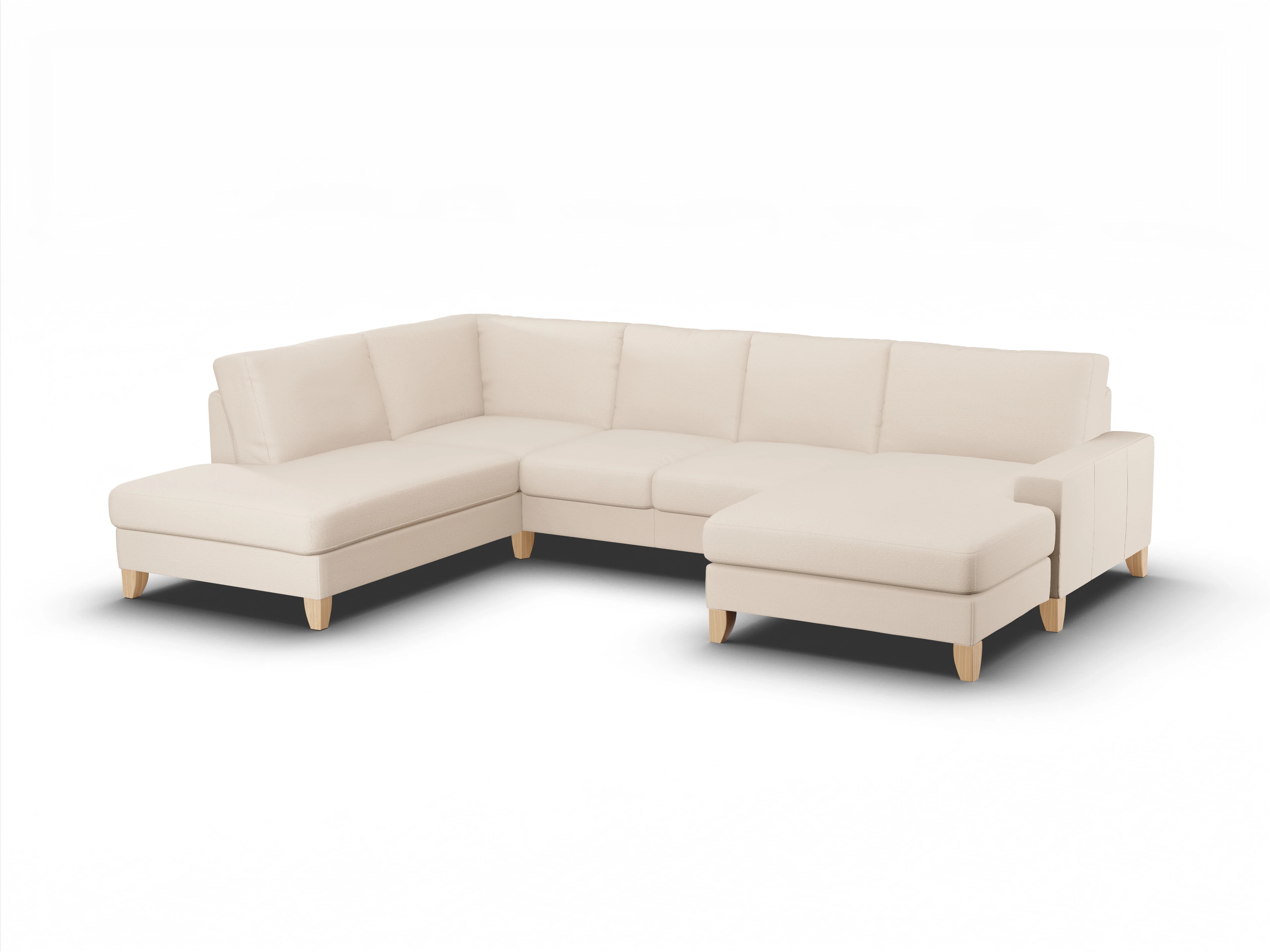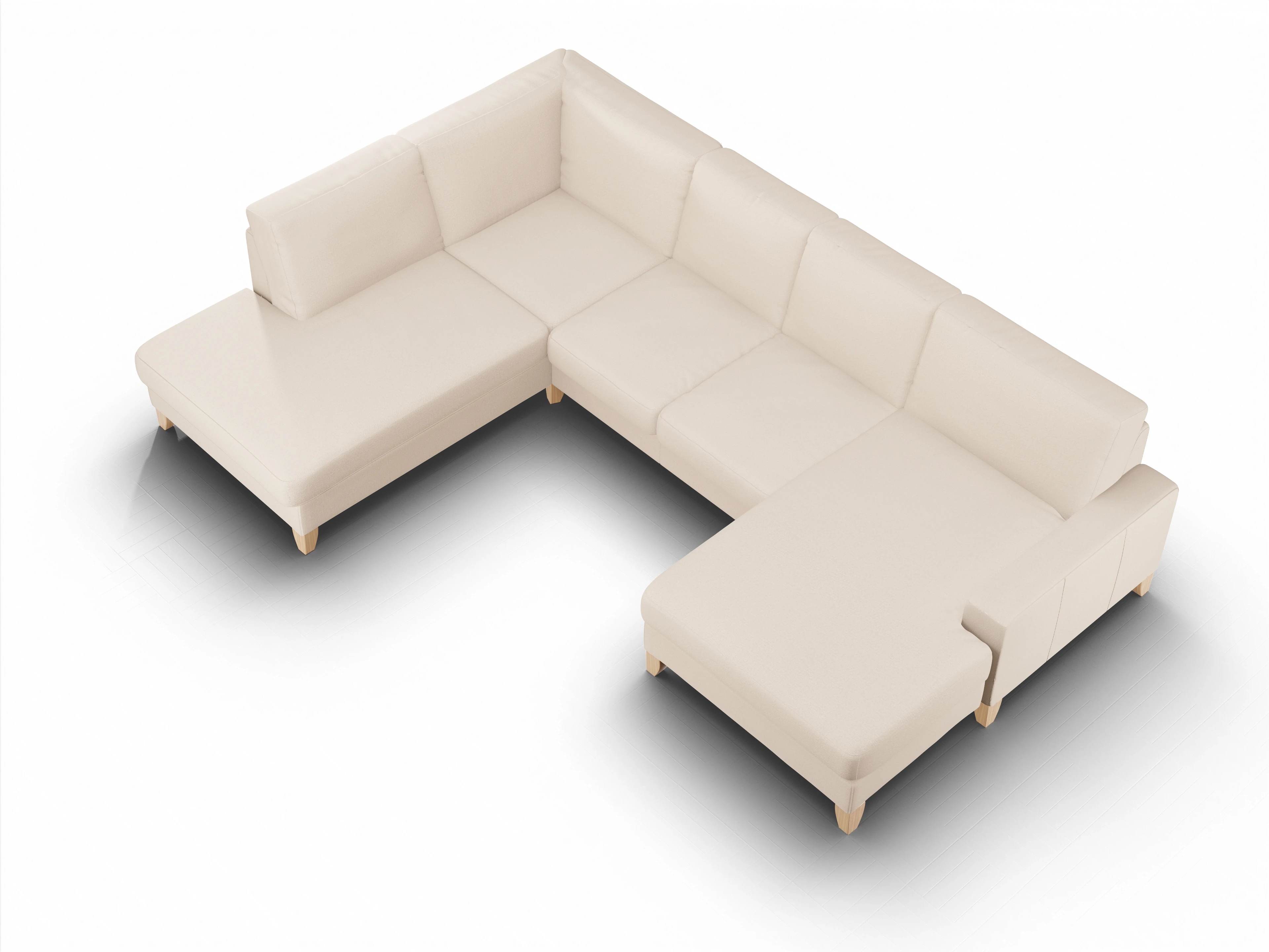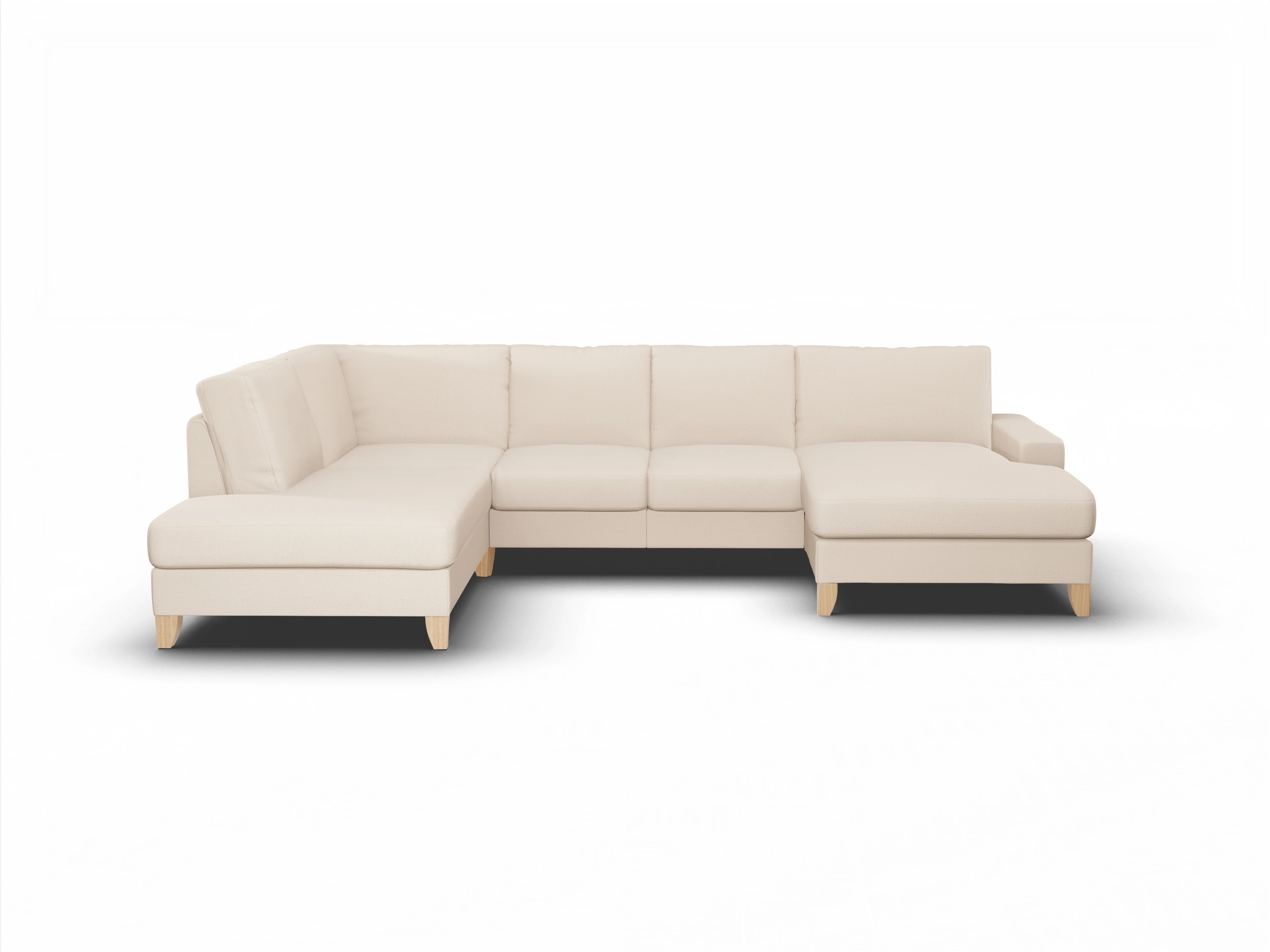 Die Casco Wohnlandschaft besteht aus einer Umbauecke links, einem 2-Sitzer ohne Armlehne mittig und einem Longchair mit Armlehne rechts.