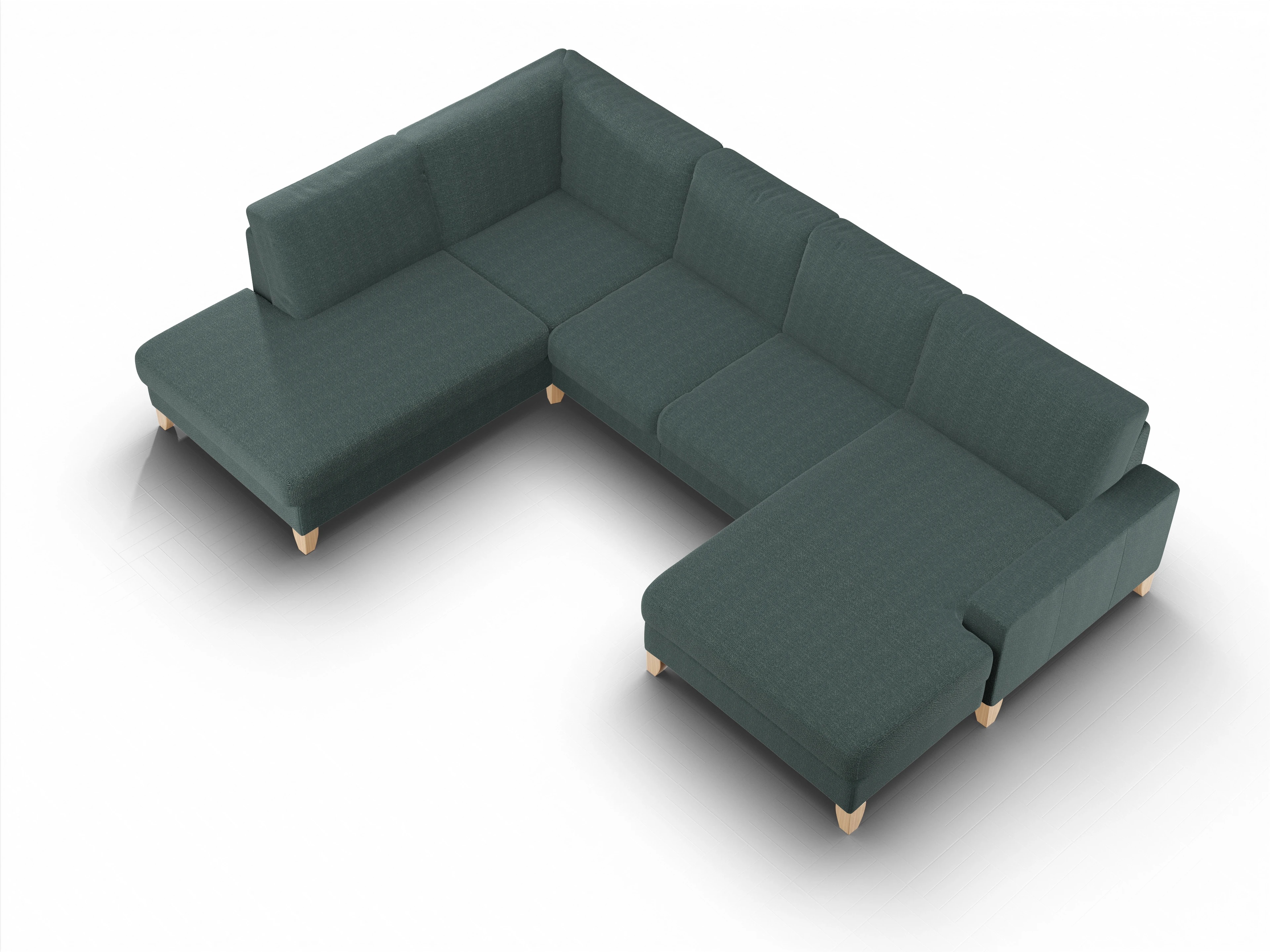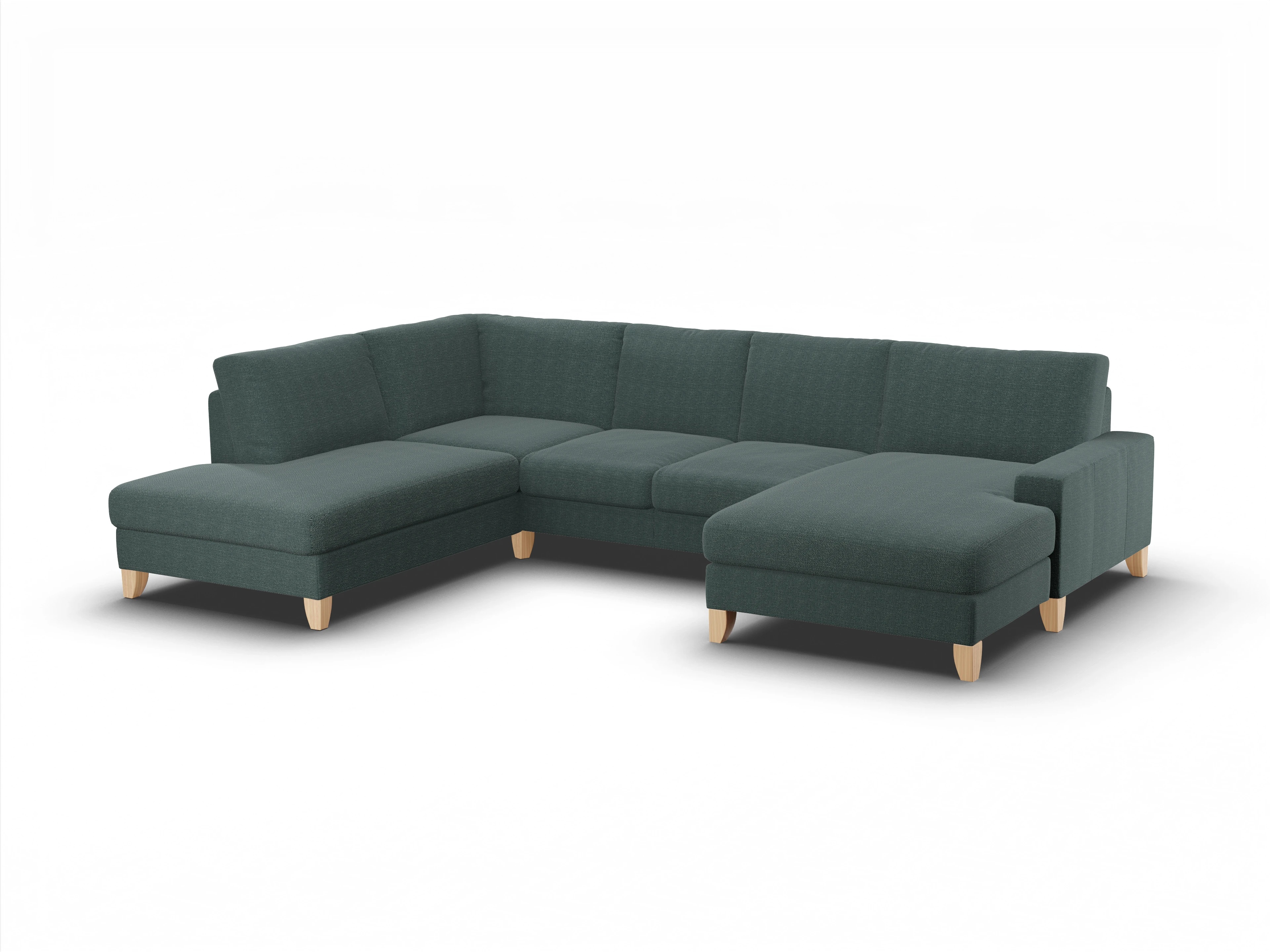 Die Casco Wohnlandschaft besteht aus einer Umbauecke links, einem 2-Sitzer ohne Armlehne mittig und einem Longchair mit Armlehne rechts.