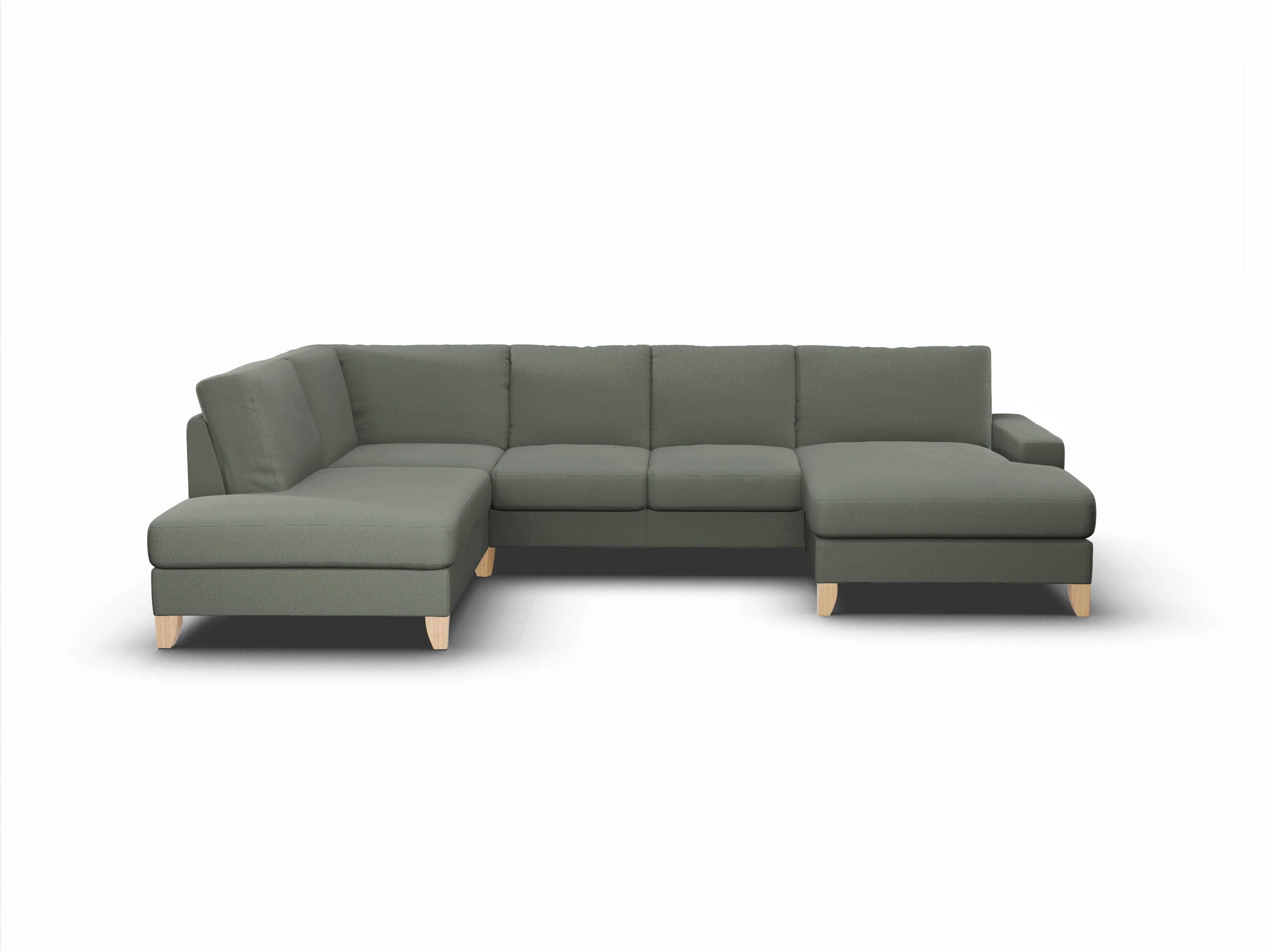 Die Casco Wohnlandschaft besteht aus einer Umbauecke links, einem 2-Sitzer ohne Armlehne mittig und einem Longchair mit Armlehne rechts.