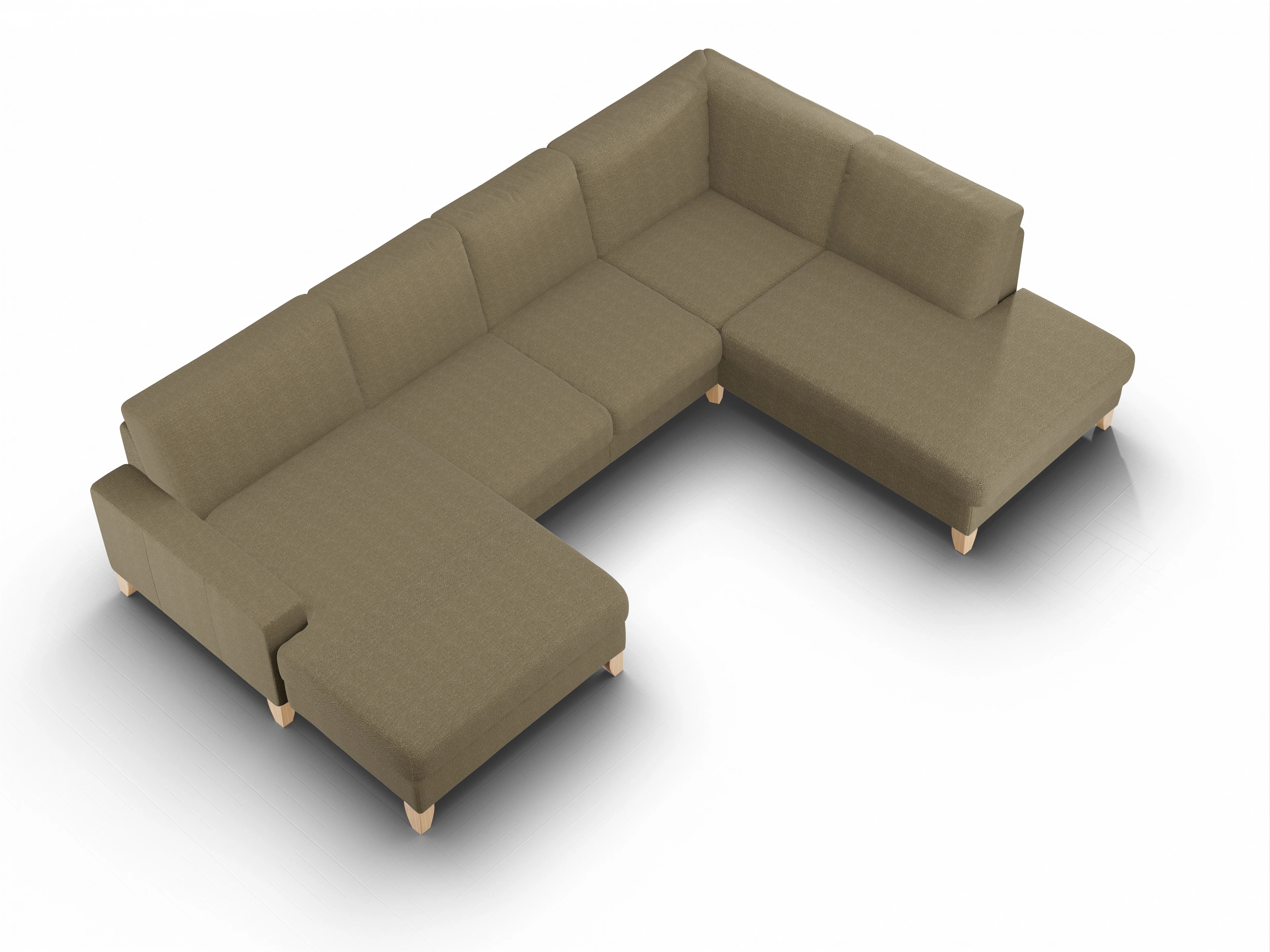 Die Casco Wohnlandschaft besteht aus einem Longchair mit Armlehne links, einem 2-Sitzer ohne Armlehne mittig und einer Umbauecke rechts.