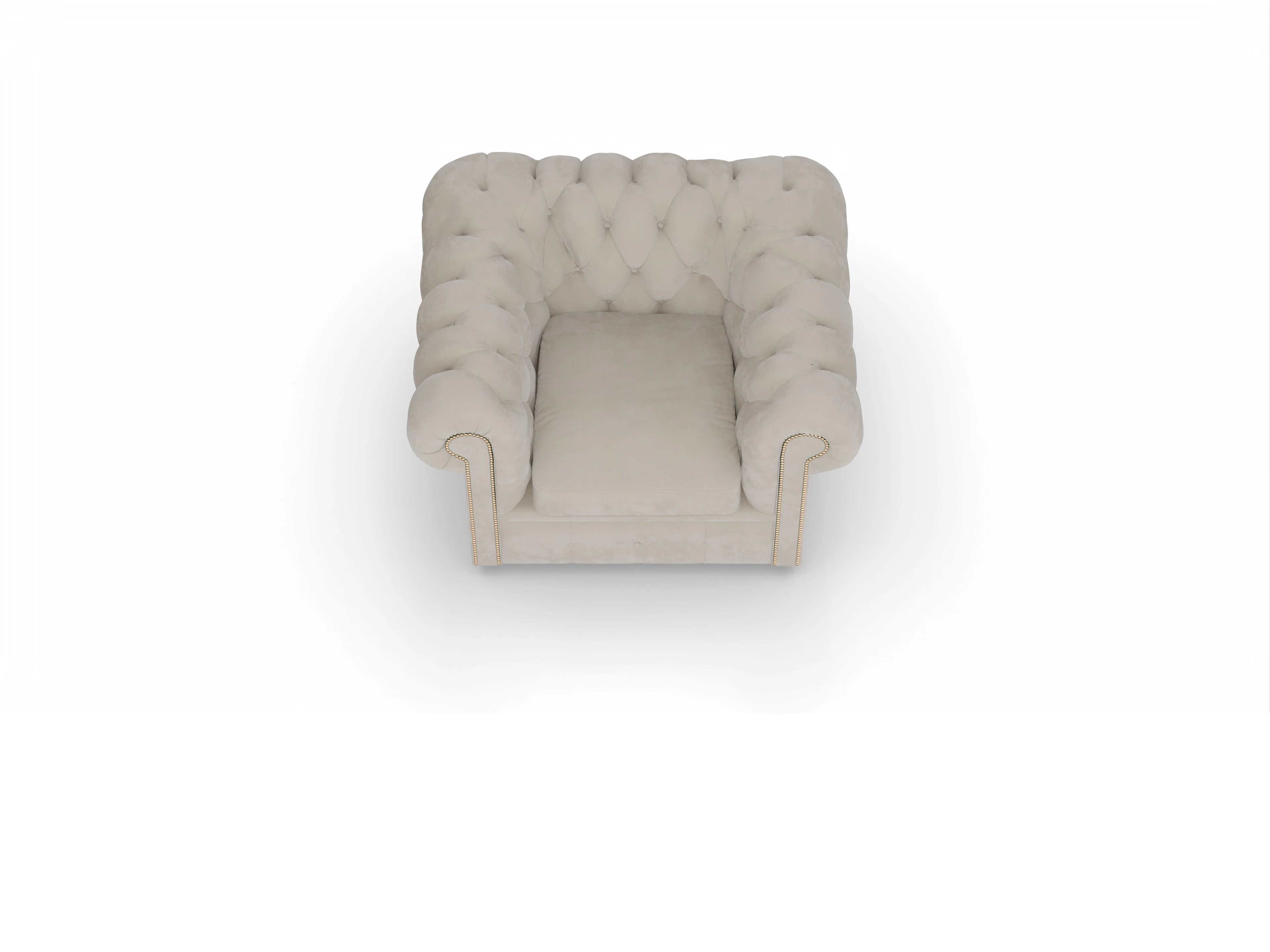 Die Rückenlehne ist mit strapazierfähigen Nosag-Federn ausgestattet, die in Kombination mit hochwertigem Schaumstoff für optimalen Halt und langanhaltenden Sitzkomfort sorgen. Die handgefertigte Kapitonierung verleiht dem Möbelstück seine charakteristische Chesterfield-Optik und unterstreicht die aufwendige Handwerkskunst.