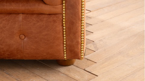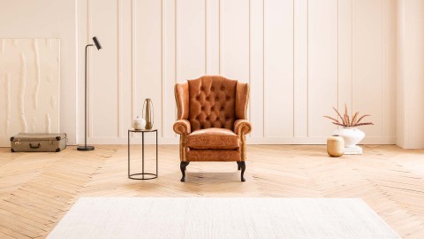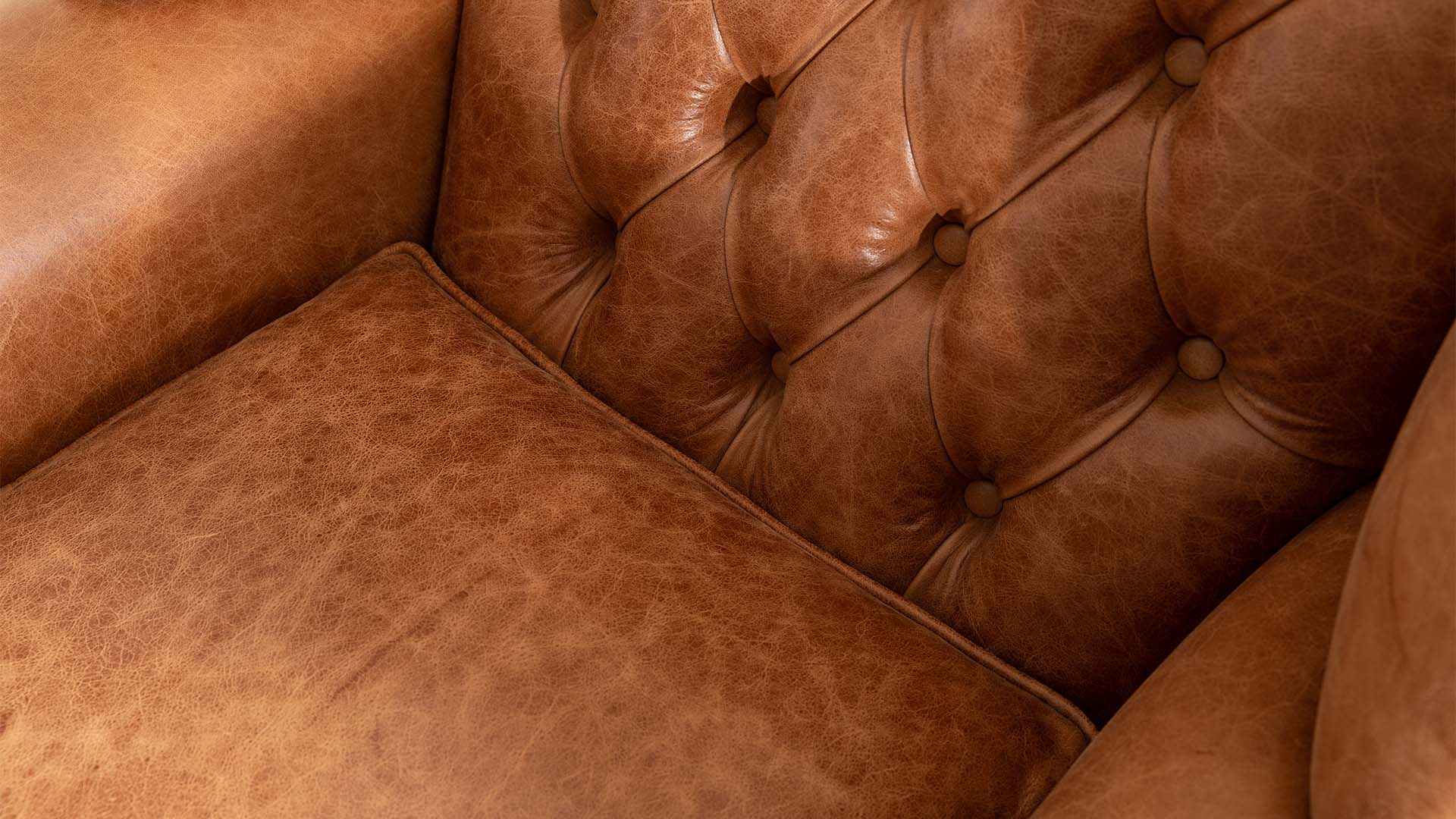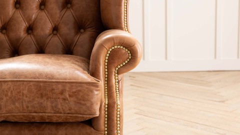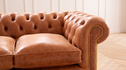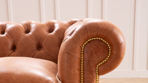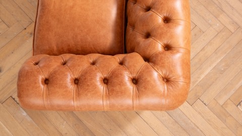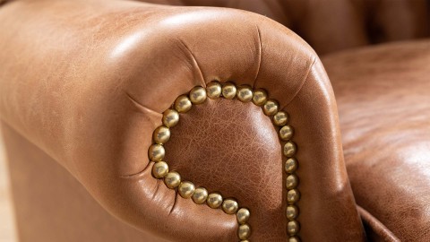 Die Rückenlehne ist mit strapazierfähigen Nosag-Federn ausgestattet, die in Kombination mit hochwertigem Schaumstoff für optimalen Halt und langanhaltenden Sitzkomfort sorgen. Die handgefertigte Kapitonierung verleiht dem Möbelstück seine charakteristische Chesterfield-Optik und unterstreicht die aufwendige Handwerkskunst.