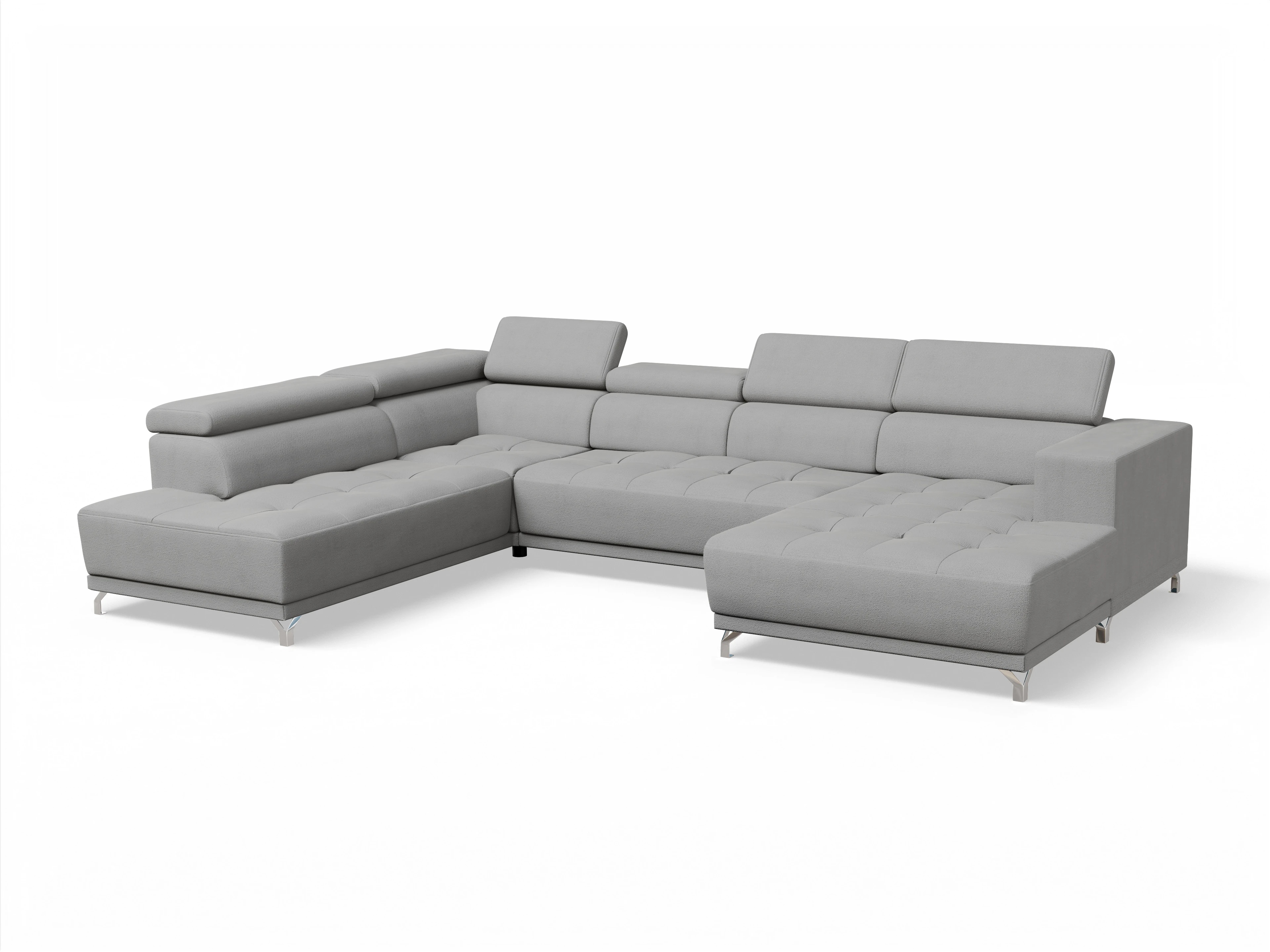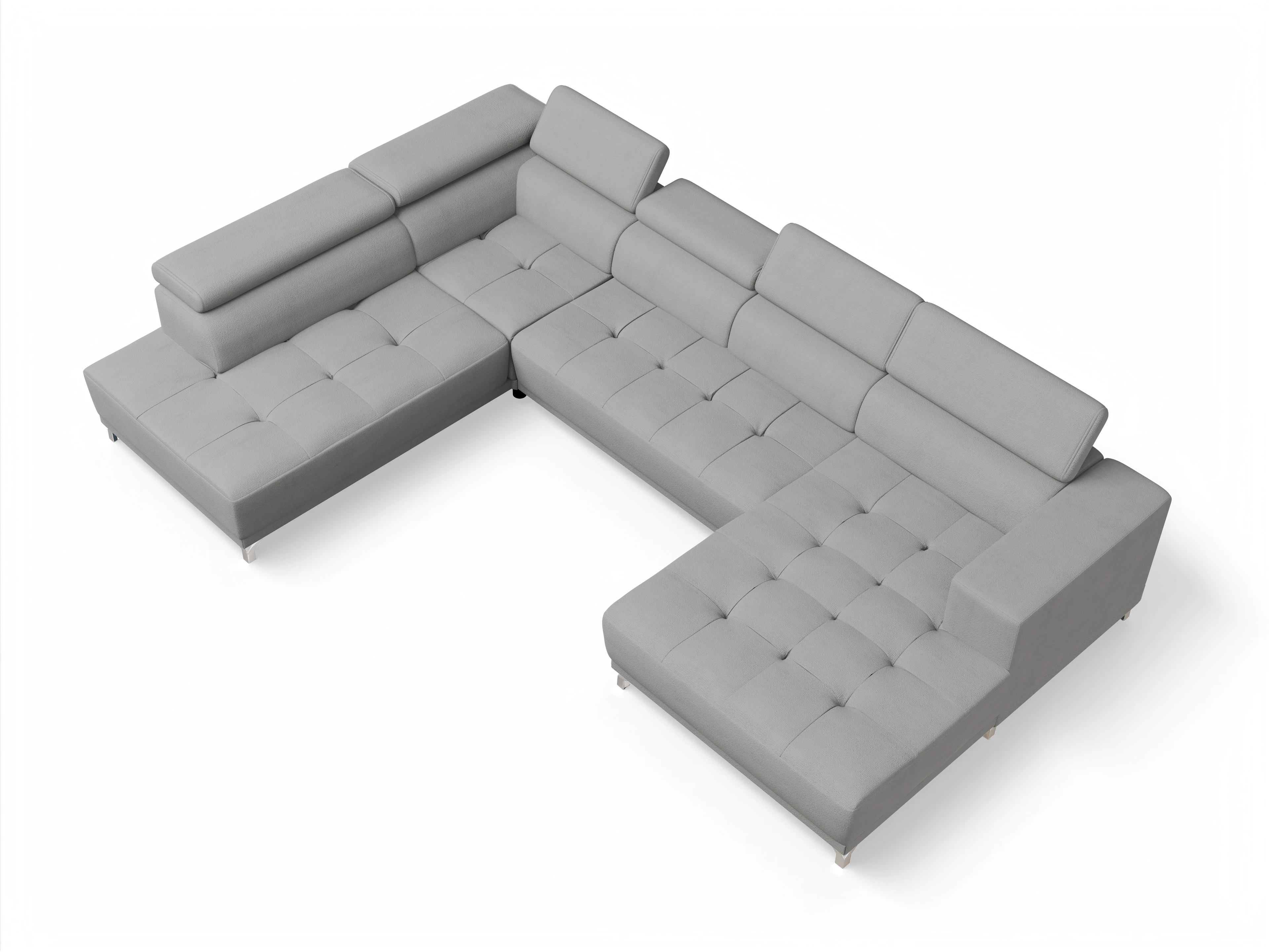 Die Wohnlandschaft besteht aus einem Abschlussteil links, einer Winkelecke klein, einem 2-Sitzer ohne Armlehne sowie einem Longchair mit Armlehne rechts. Das Sofa kommt inklusive 6x Kopfteilverstellung.