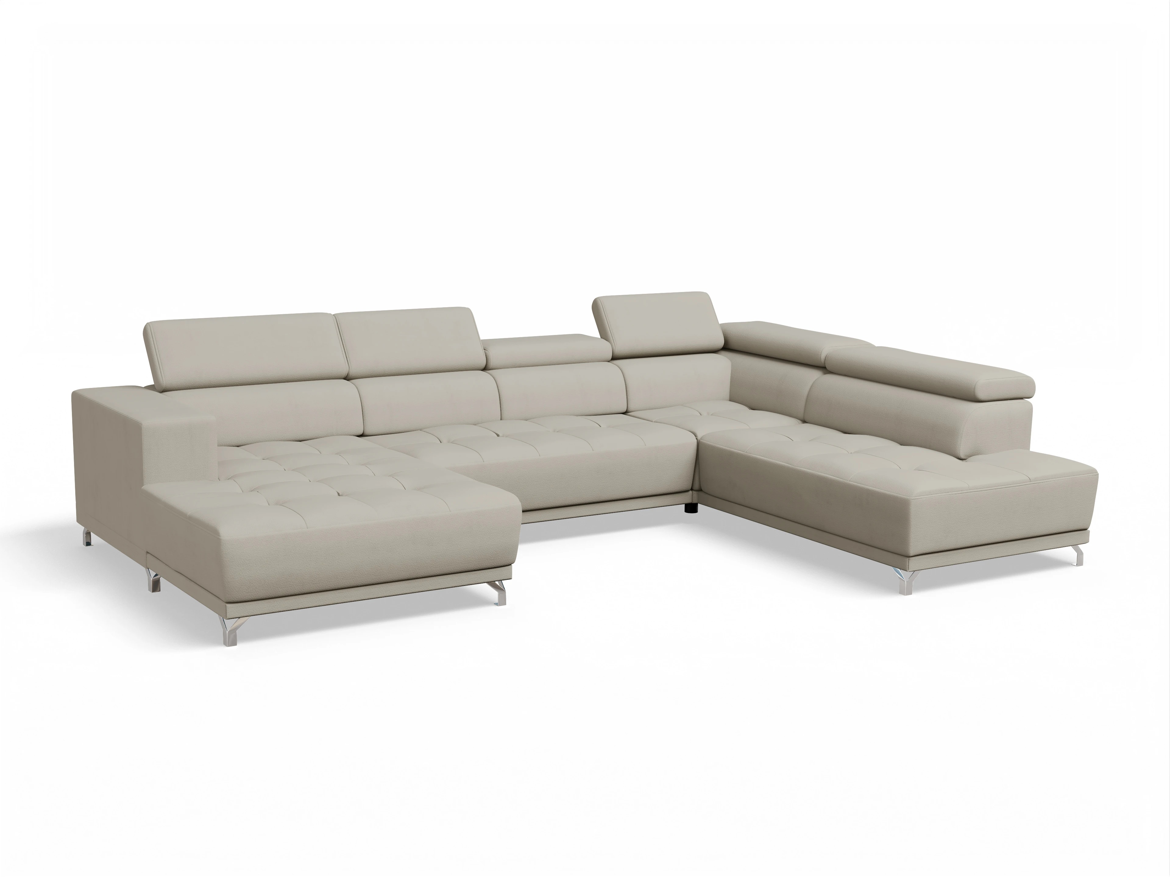 Die Wohnlandschaft besteht aus einem Longchair mit Armlehne links, einem 2-Sitzer ohne Armlehne, einer Winkelecke klein sowie einem Abschlussteil rechts. Das Sofa kommt inklusive 6x Kopfteilverstellung.
