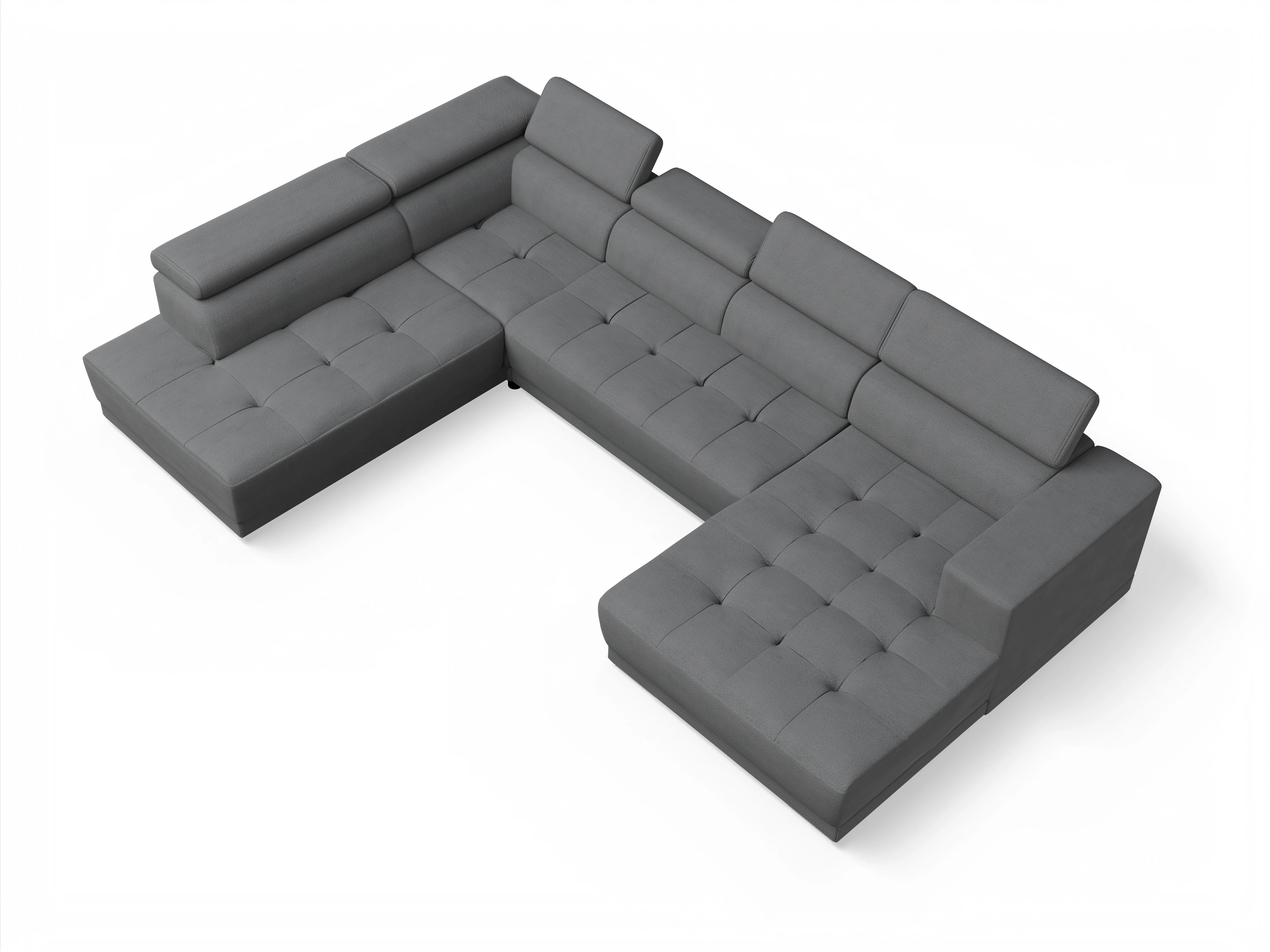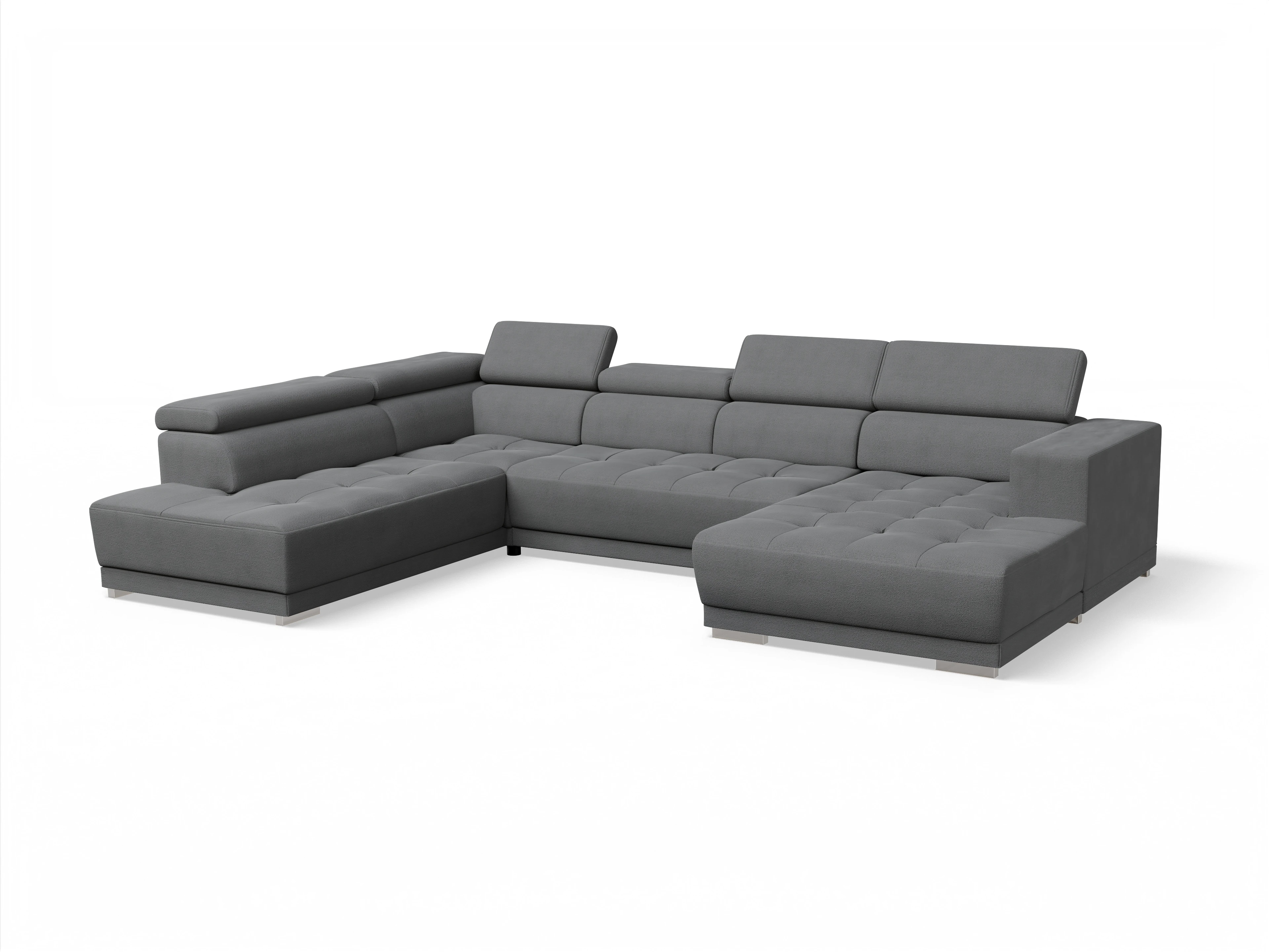 Die Wohnlandschaft besteht aus einem Abschlussteil links, einer Winkelecke klein, einem 2-Sitzer ohne Armlehne sowie einem Longchair mit Armlehne rechts. Das Sofa kommt inklusive 6x Kopfteilverstellung.