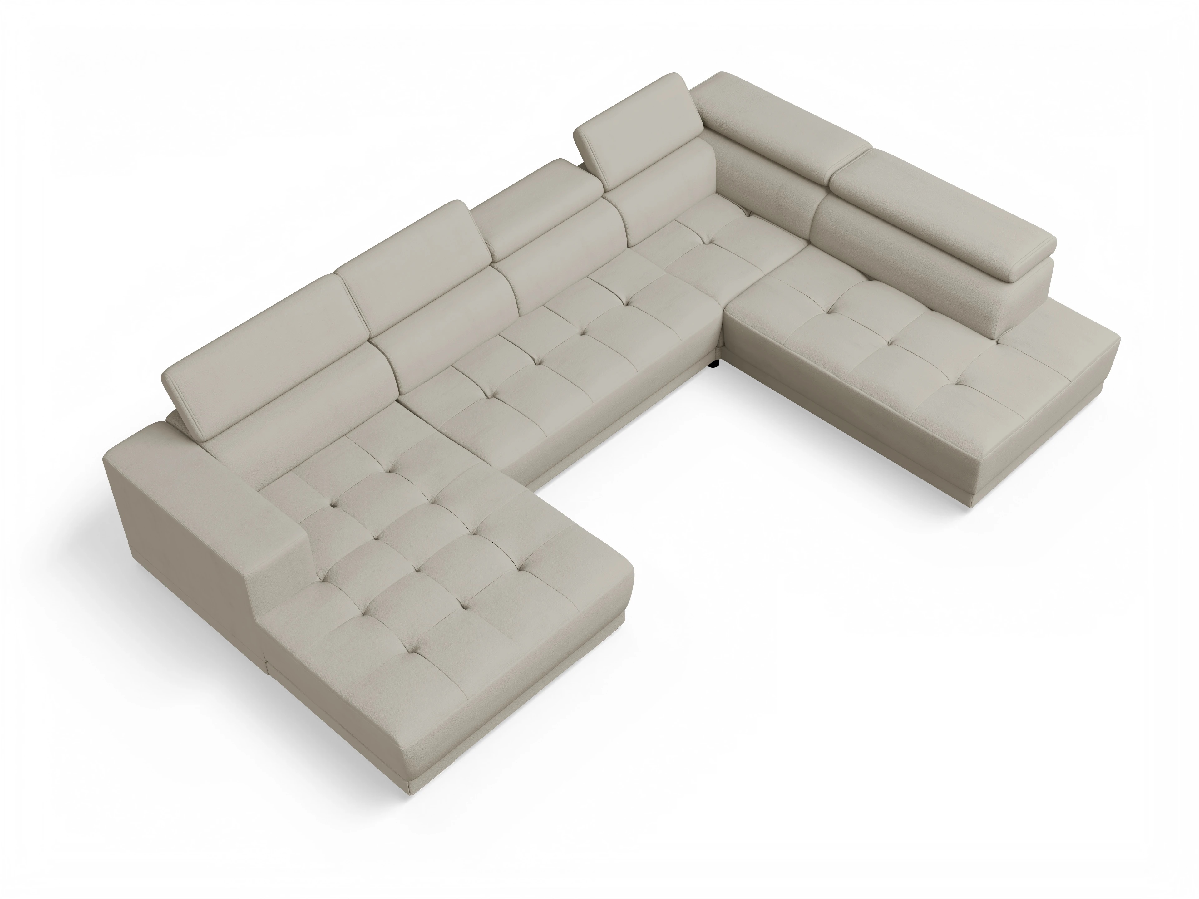 Die Wohnlandschaft besteht aus einem Longchair mit Armlehne links, einem 2-Sitzer ohne Armlehne, einer Winkelecke klein sowie einem Abschlussteil rechts. Das Sofa kommt inklusive 6x Kopfteilverstellung.