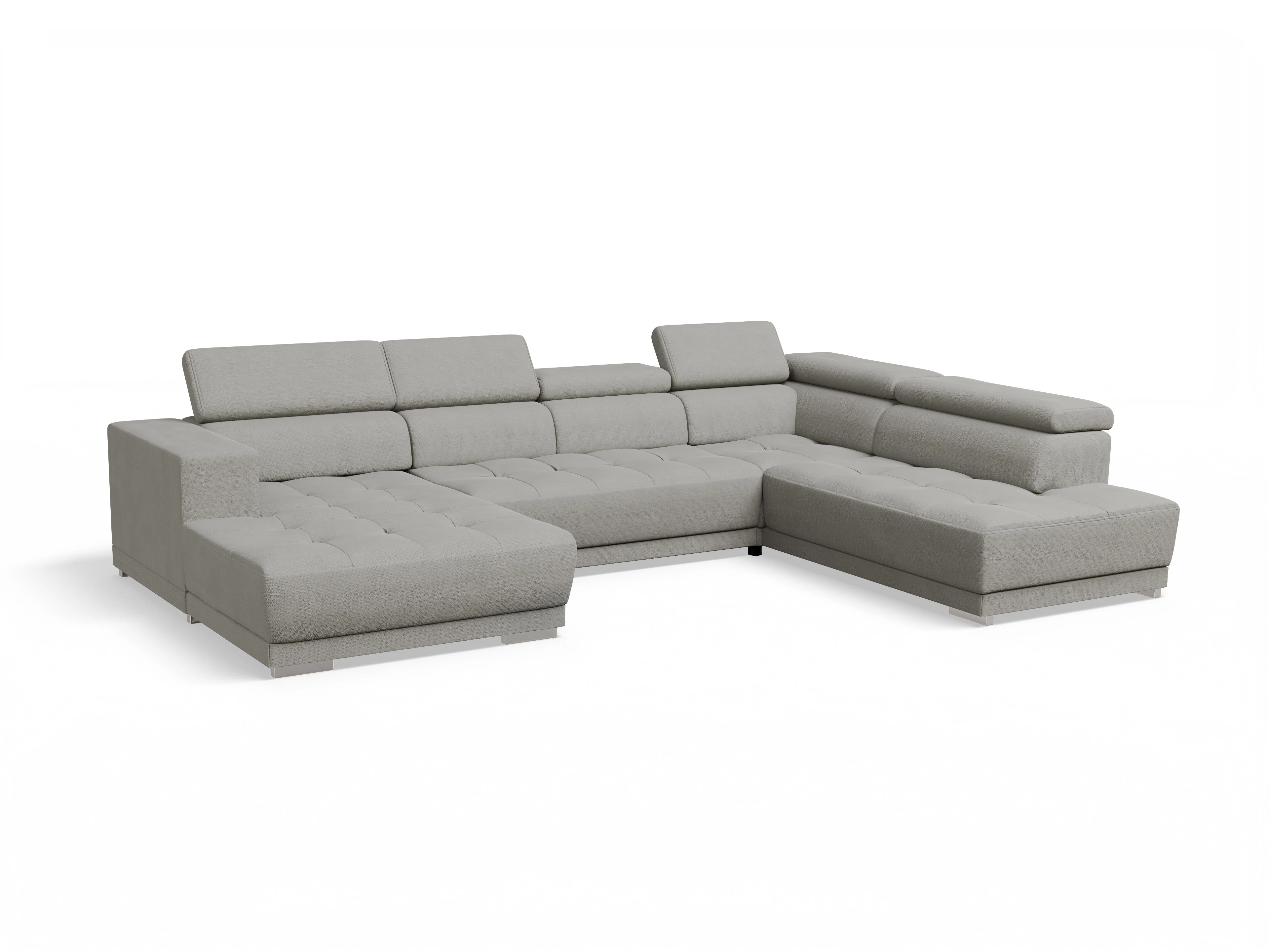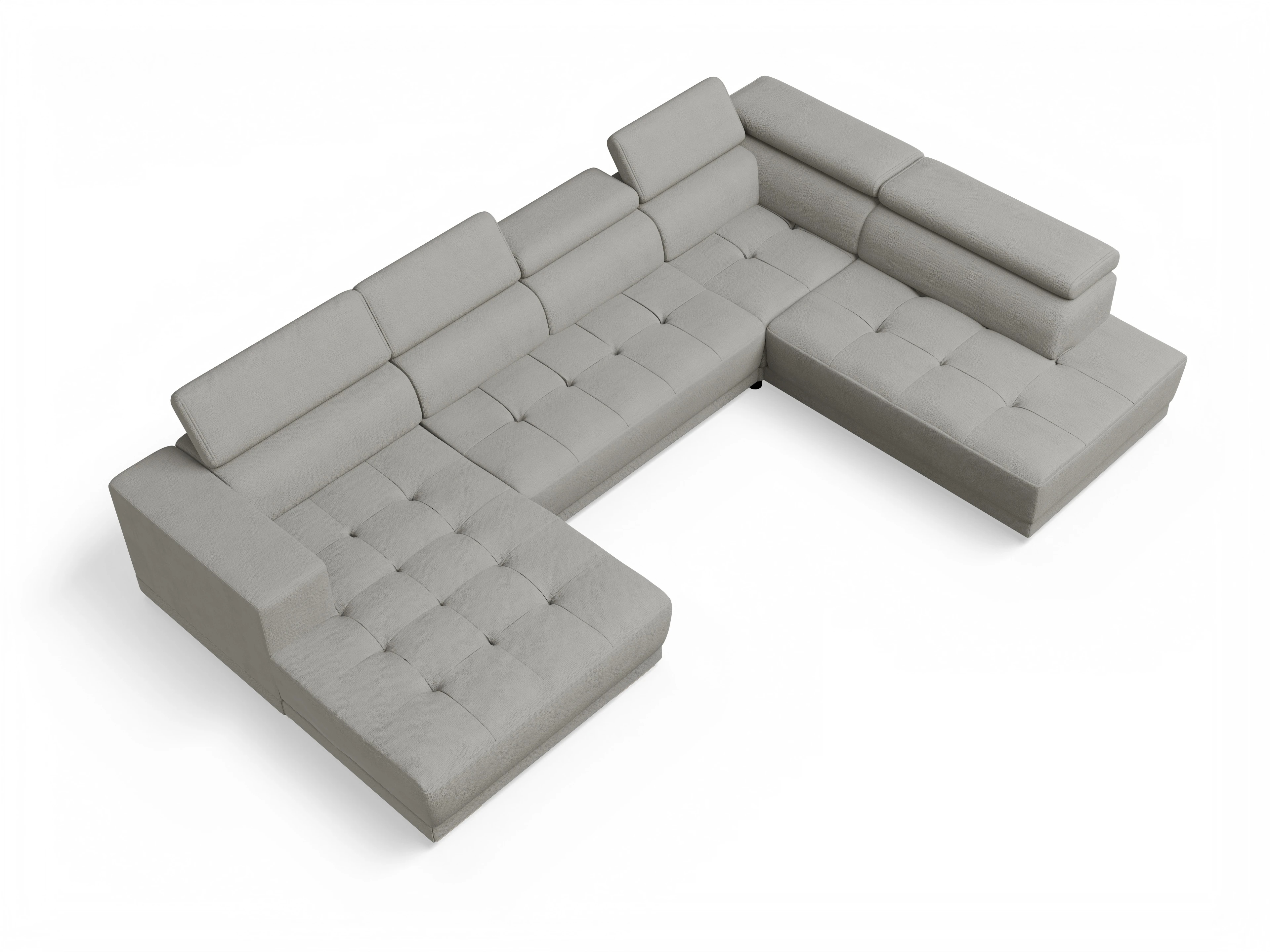 Die Wohnlandschaft besteht aus einem Longchair mit Armlehne links, einem 2-Sitzer ohne Armlehne, einer Winkelecke klein sowie einem Abschlussteil rechts. Das Sofa kommt inklusive 6x Kopfteilverstellung.
