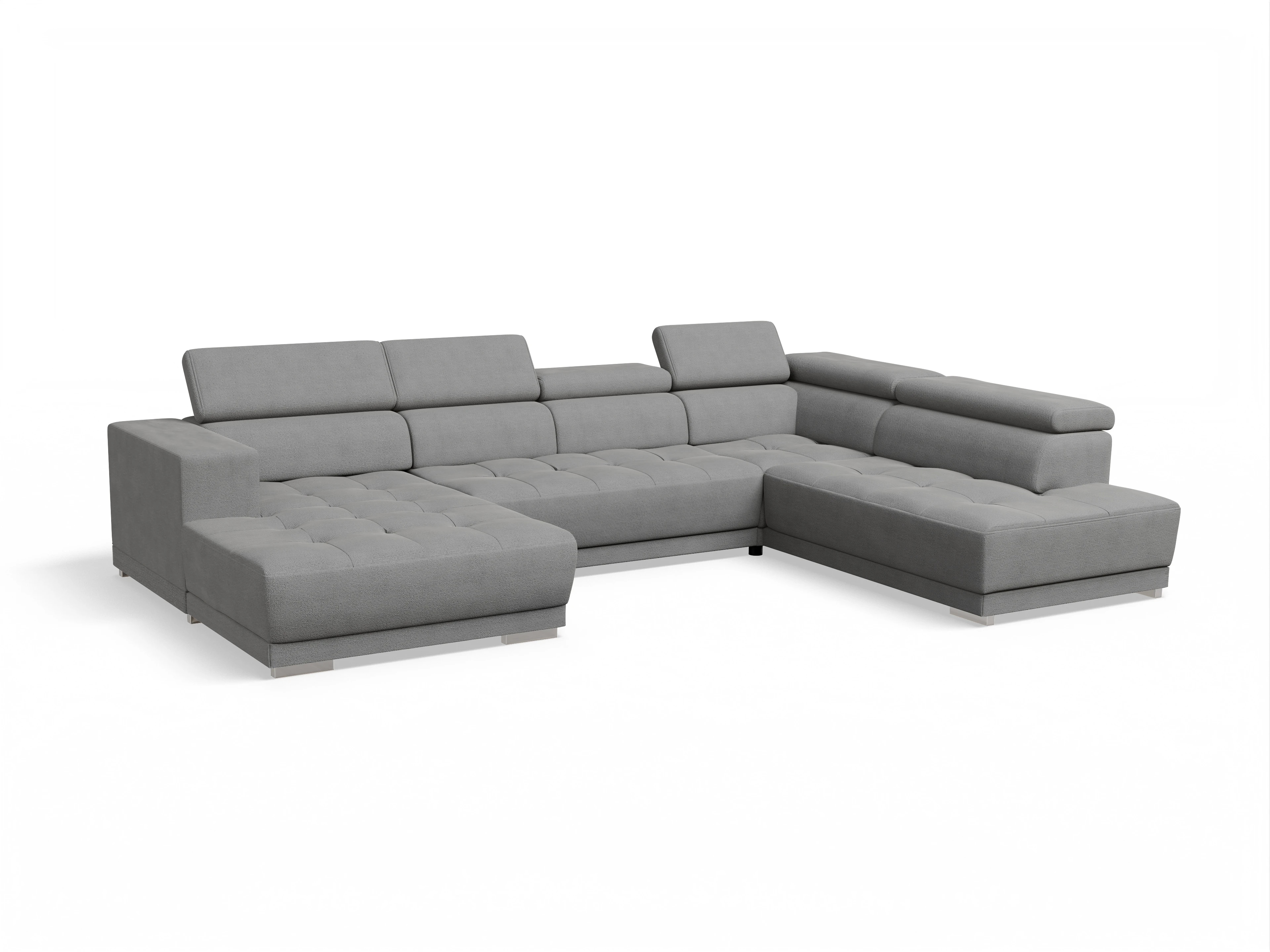 Die Wohnlandschaft besteht aus einem Longchair mit Armlehne links, einem 2-Sitzer ohne Armlehne, einer Winkelecke klein sowie einem Abschlussteil rechts. Das Sofa kommt inklusive 6x Kopfteilverstellung.