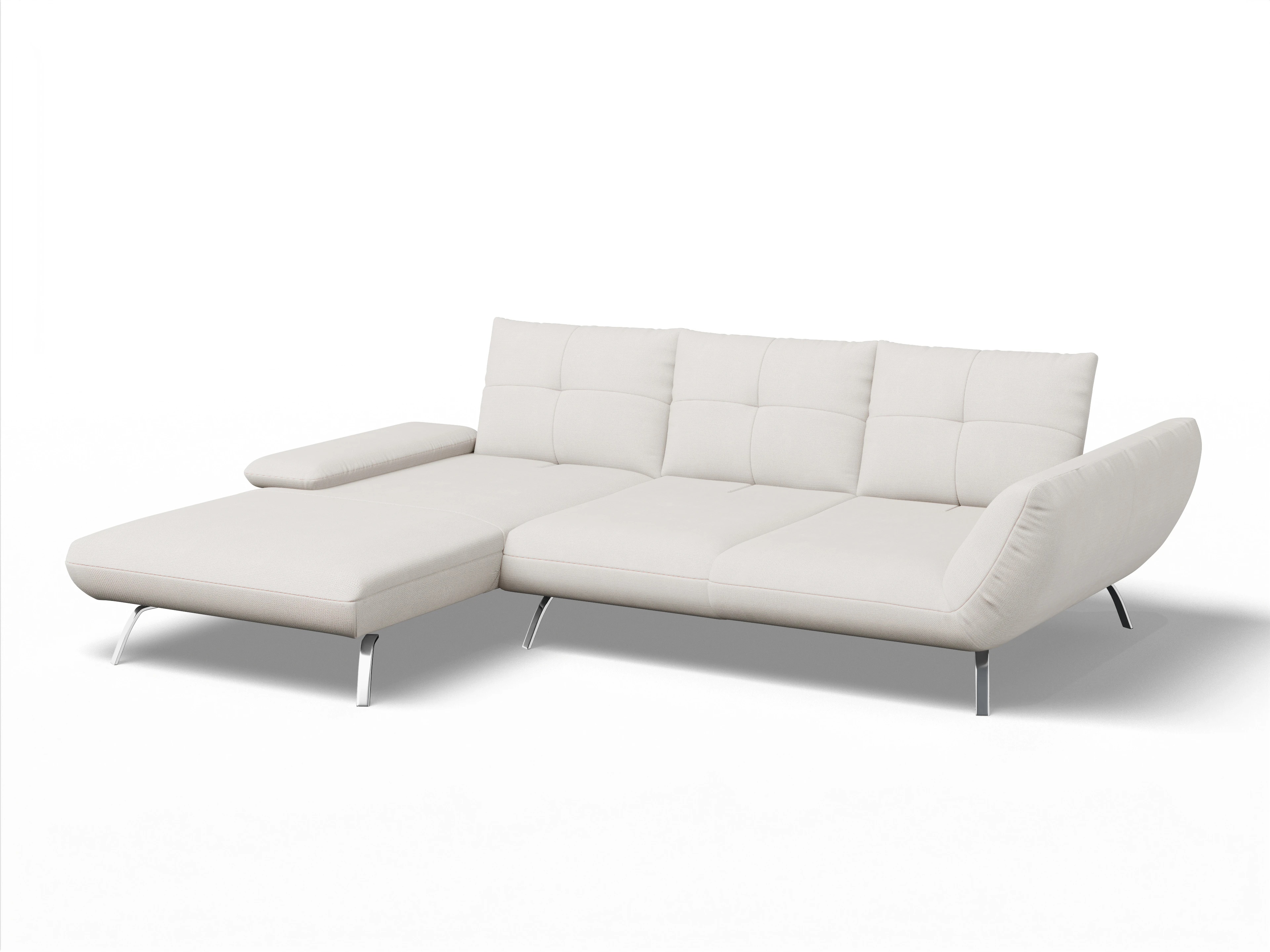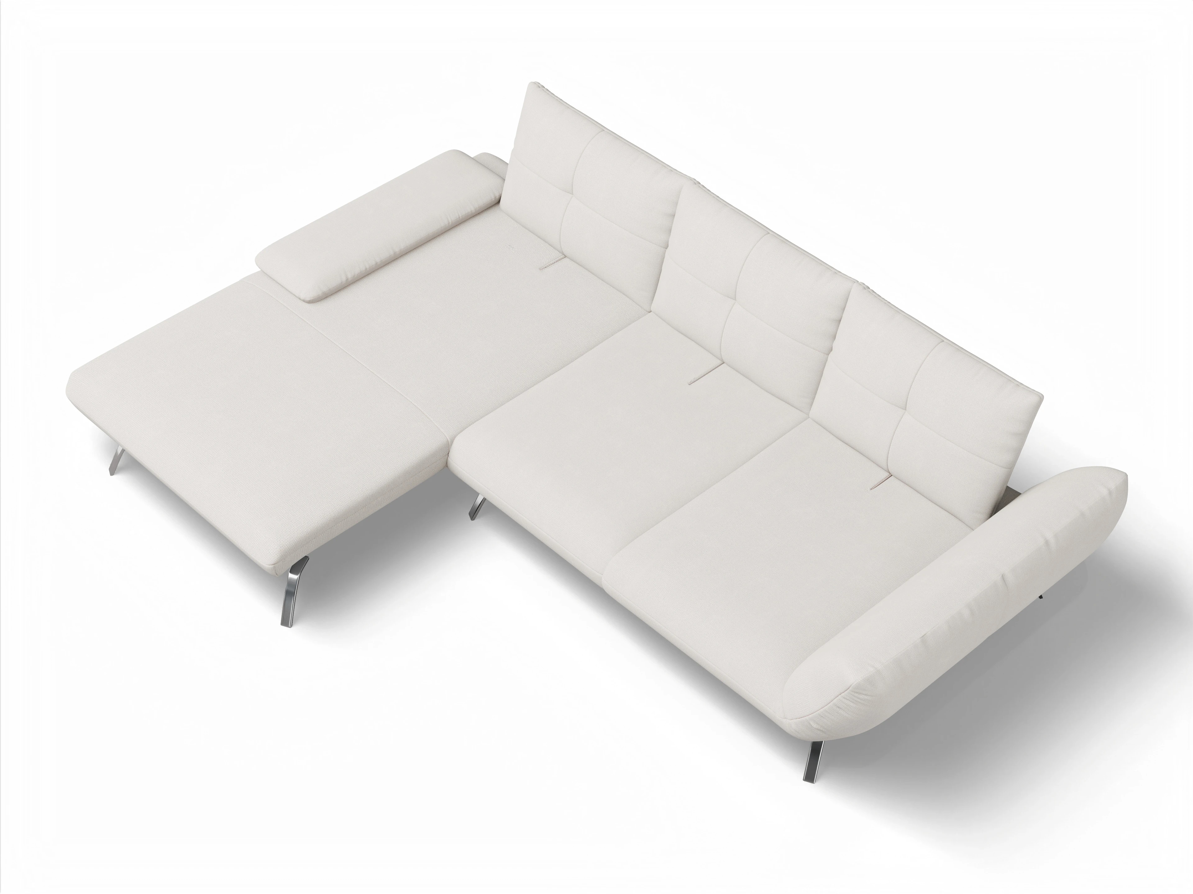 Das moderne und schwungvolle Modell Dubai, präsentiert sich auf filigranen Metallfüßen fast schwebend und verleiht Ihrem Wohnraum eine wunderbare Leichtigkeit. Für gesellige Runden mit Freunden oder Familienversammlungen bietet das Sofa ausreichend Platz, um alle bequem unterzubringen. Designliebhaber werden die vielfältigen Möglichkeiten der Stoffkombinationen für Sitzfläche und Korpus schätzen. Die gesteppten Rückenkissen und die Nierenkissen runden das Sofa gelungen ab. Egal ob als Megasofa, Ecksofa, Wohnlandschaft oder Loveseat – das Sofa lässt sich individuell konfigurieren und passt perfekt in jedes Wohnzimmer. Das besondere Highlight sind die inklusive Schwenkrücken, und mit der optionalen Rückenneigungsfunktion und Armlehnenverstellung können Sie den Komfort noch optimieren.