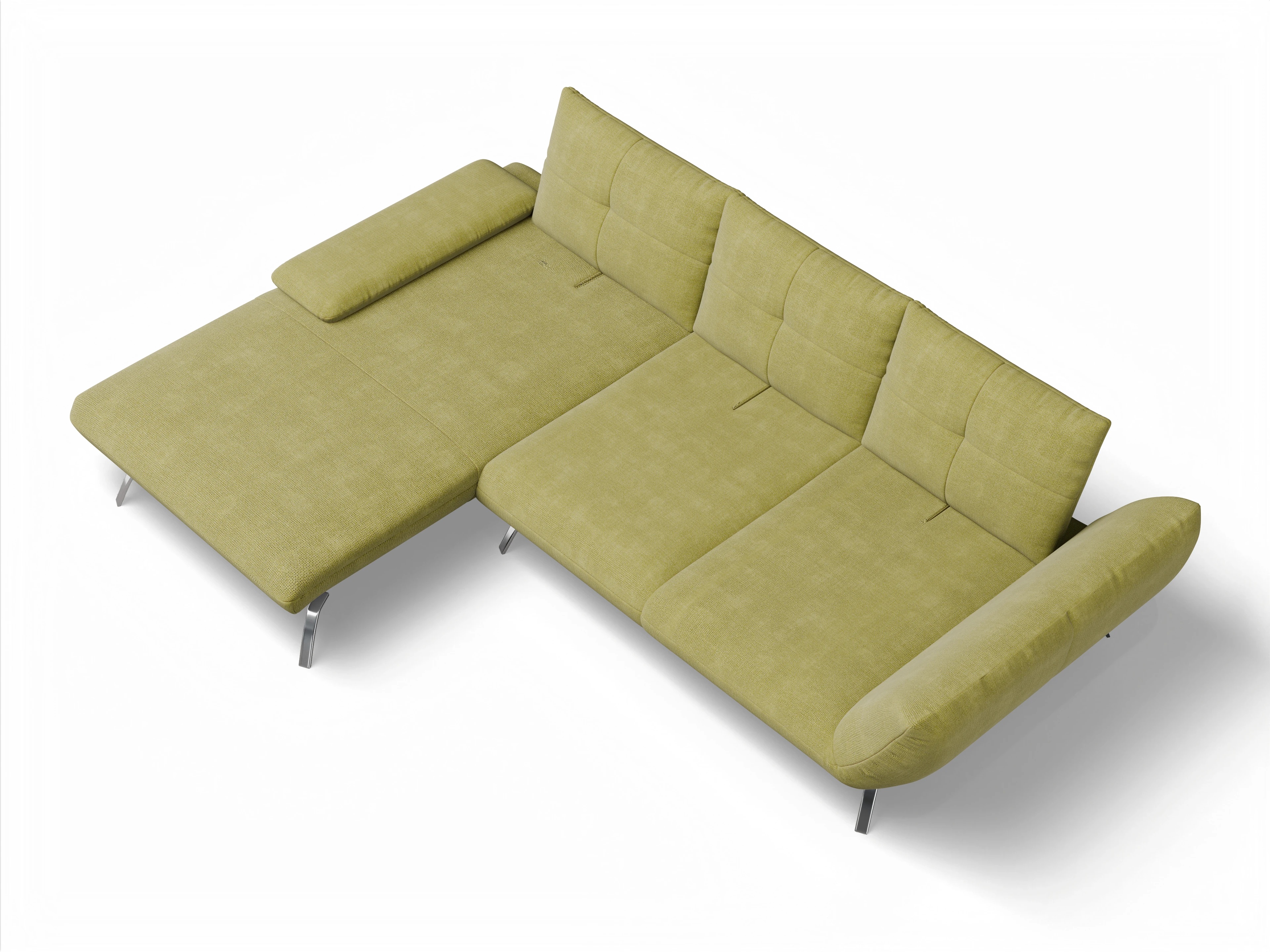 Das moderne und schwungvolle Modell Dubai, präsentiert sich auf filigranen Metallfüßen fast schwebend und verleiht Ihrem Wohnraum eine wunderbare Leichtigkeit. Für gesellige Runden mit Freunden oder Familienversammlungen bietet das Sofa ausreichend Platz, um alle bequem unterzubringen. Designliebhaber werden die vielfältigen Möglichkeiten der Stoffkombinationen für Sitzfläche und Korpus schätzen. Die gesteppten Rückenkissen und die Nierenkissen runden das Sofa gelungen ab. Egal ob als Megasofa, Ecksofa, Wohnlandschaft oder Loveseat – das Sofa lässt sich individuell konfigurieren und passt perfekt in jedes Wohnzimmer. Das besondere Highlight sind die inklusive Schwenkrücken, und mit der optionalen Rückenneigungsfunktion und Armlehnenverstellung können Sie den Komfort noch optimieren.