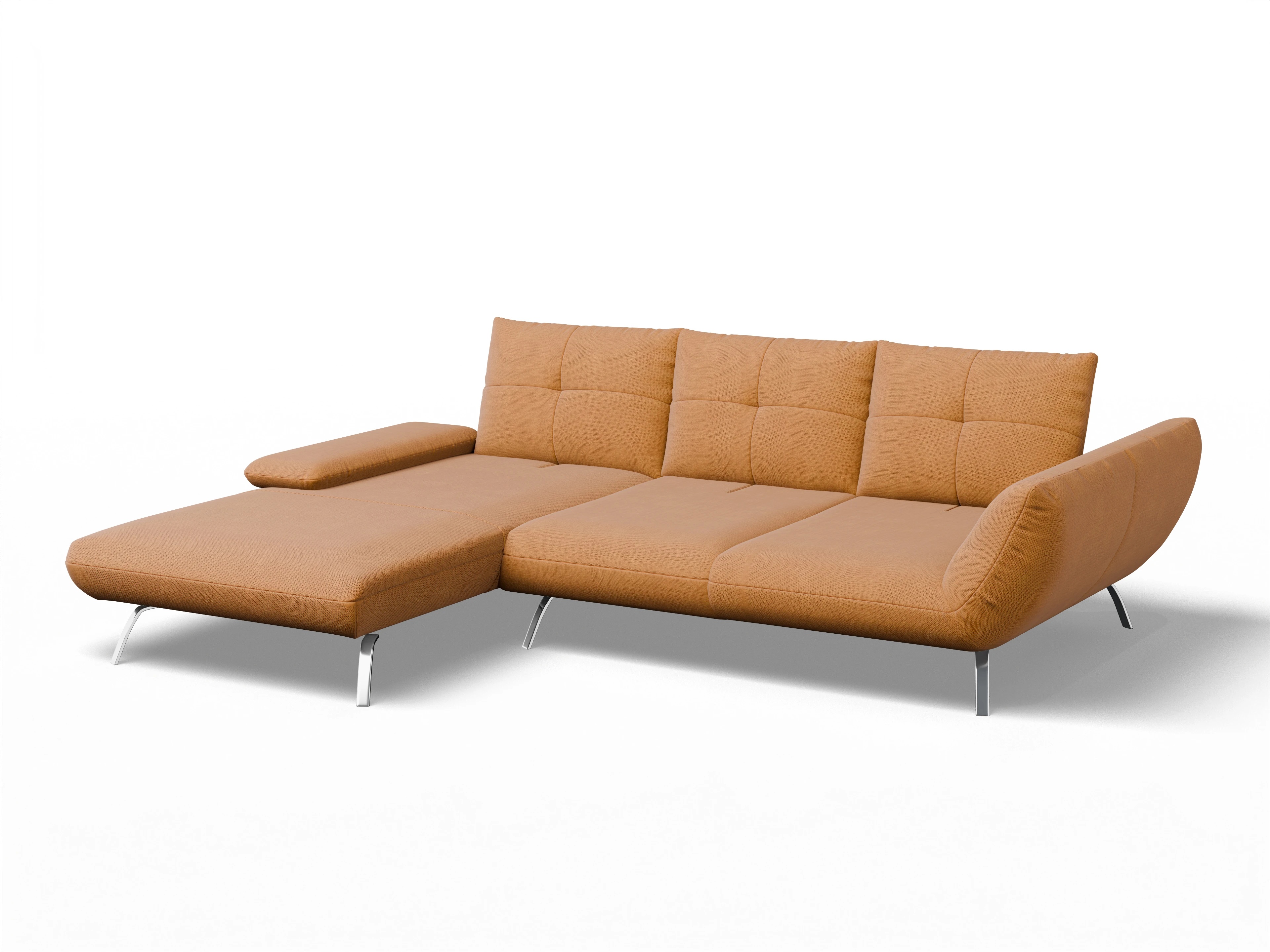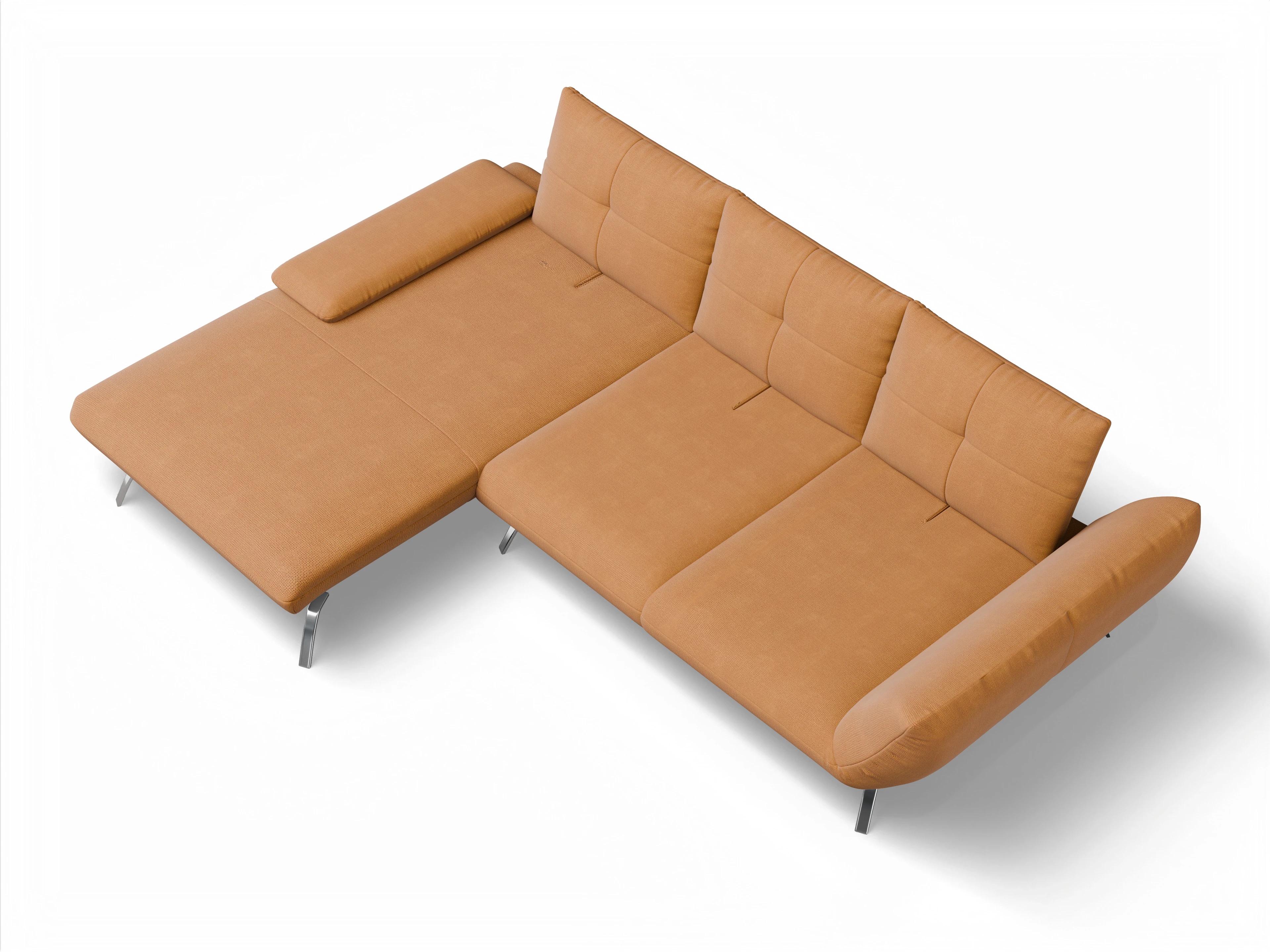 Das moderne und schwungvolle Modell Dubai, präsentiert sich auf filigranen Metallfüßen fast schwebend und verleiht Ihrem Wohnraum eine wunderbare Leichtigkeit. Für gesellige Runden mit Freunden oder Familienversammlungen bietet das Sofa ausreichend Platz, um alle bequem unterzubringen. Designliebhaber werden die vielfältigen Möglichkeiten der Stoffkombinationen für Sitzfläche und Korpus schätzen. Die gesteppten Rückenkissen und die Nierenkissen runden das Sofa gelungen ab. Egal ob als Megasofa, Ecksofa, Wohnlandschaft oder Loveseat – das Sofa lässt sich individuell konfigurieren und passt perfekt in jedes Wohnzimmer. Das besondere Highlight sind die inklusive Schwenkrücken, und mit der optionalen Rückenneigungsfunktion und Armlehnenverstellung können Sie den Komfort noch optimieren.