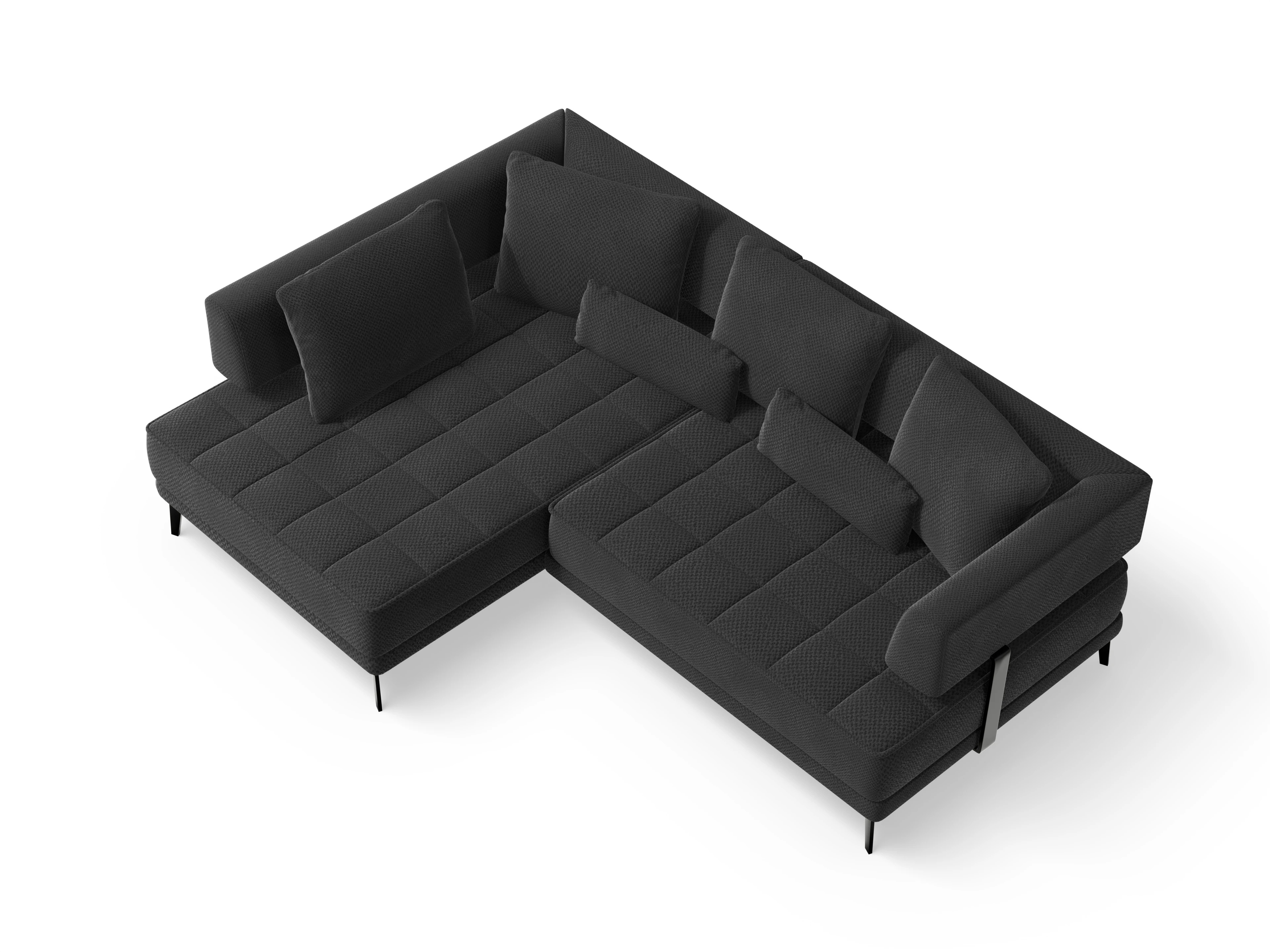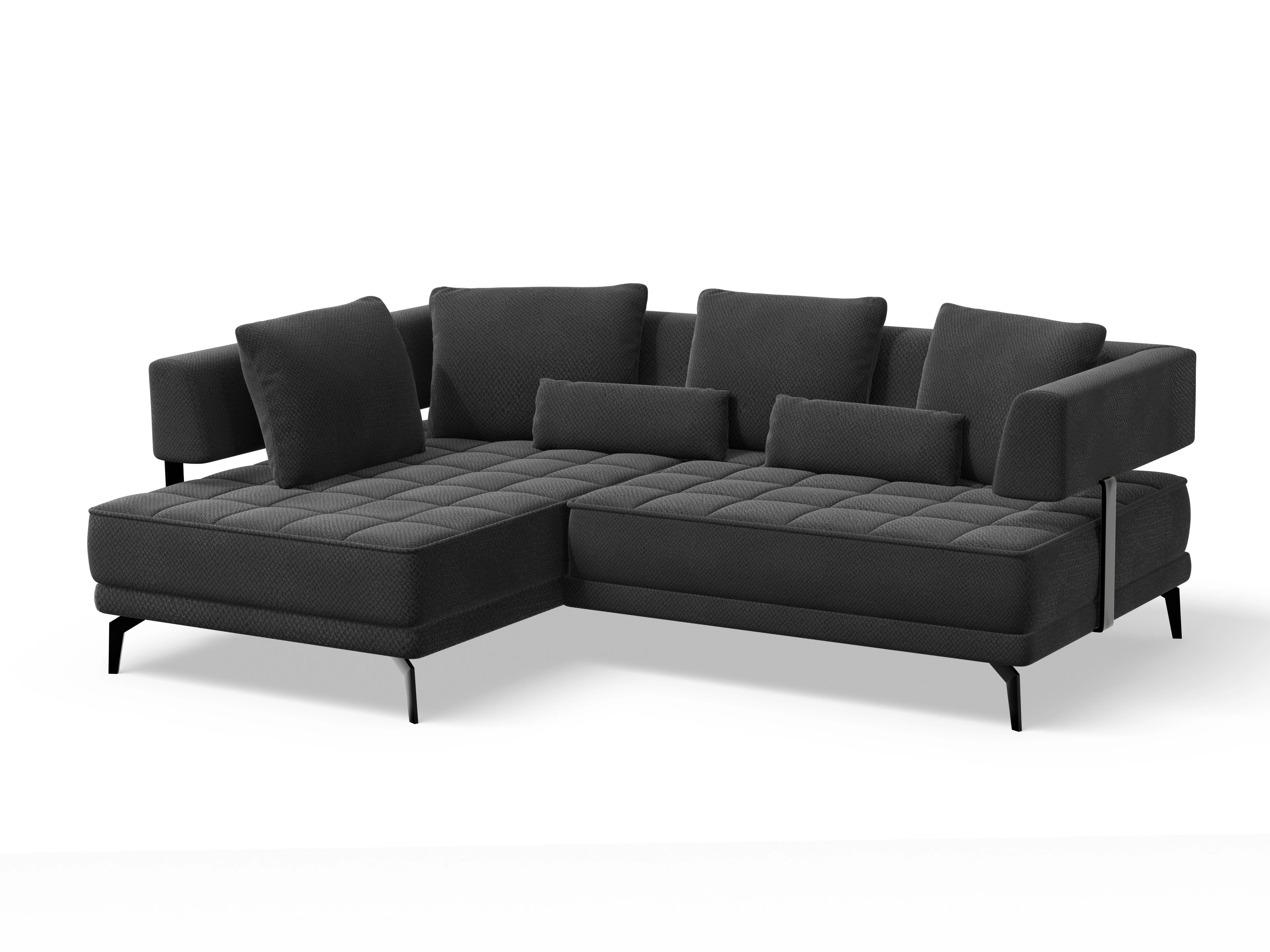 Entdecken Sie Genua – das moderne Ecksofa, das Eleganz und Komfort neu definiert. Auf wirkungsvollen, stilvollen Beinen präsentiert es sich als dominantes Zentrum Ihres Wohnraums und besticht durch ein klassisch zeitloses Design. Die klare Formensprache wird durch die umlaufende, gepolsterte Reling betont, die bequeme Rückenkissen souverän trägt. Die seitlichen Metallbügel dienen nicht nur der Konstruktion, sondern verleihen dem Modell sein markantes Erscheinungsbild.