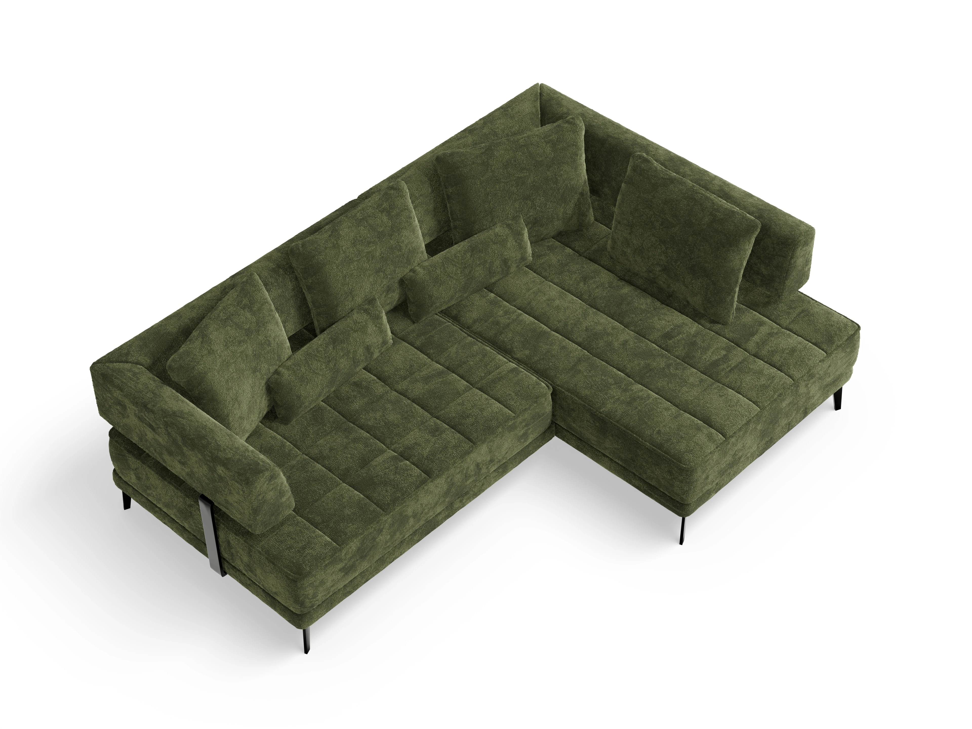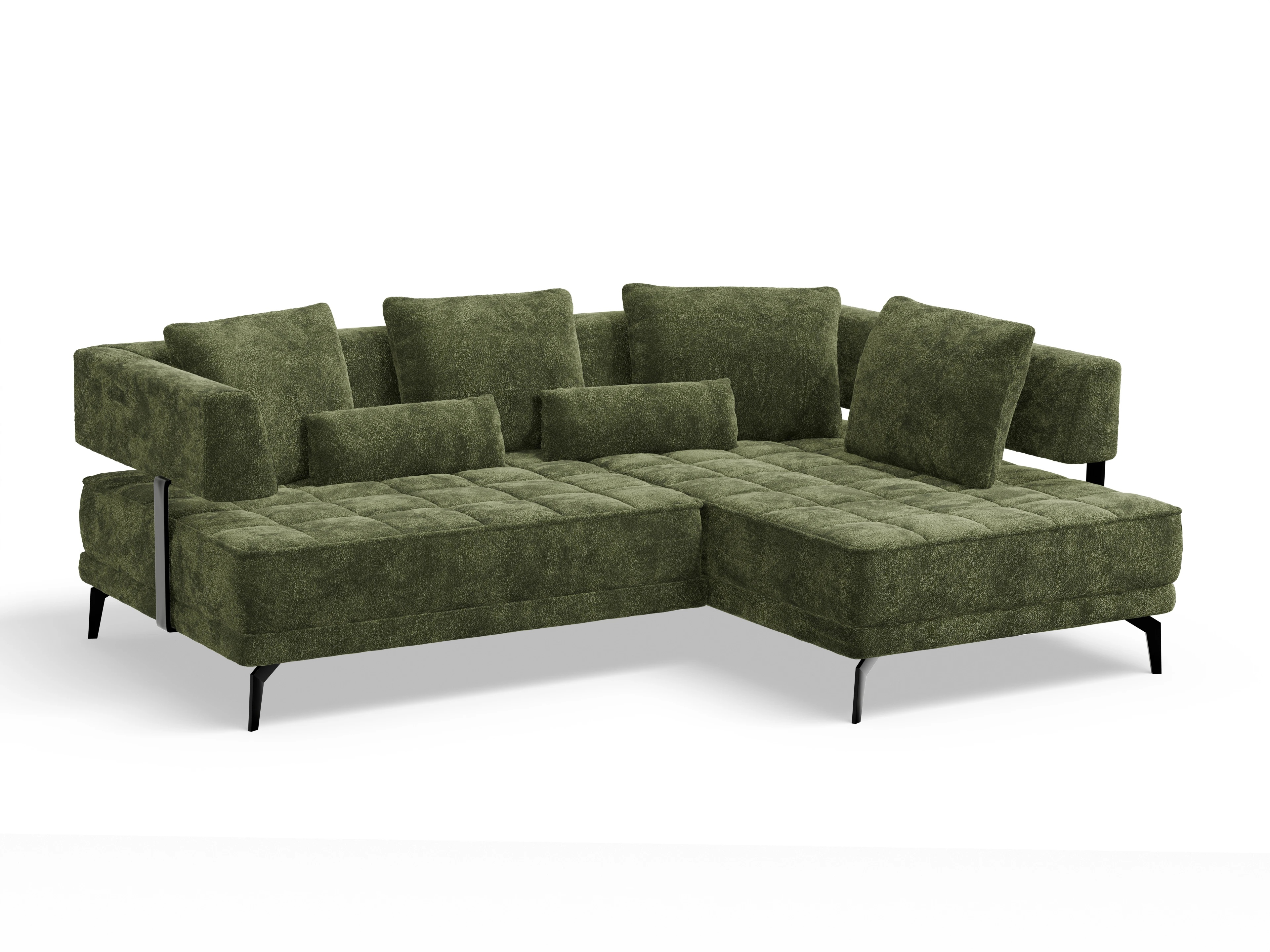 Entdecken Sie Genua – das moderne Ecksofa, das Eleganz und Komfort neu definiert. Auf wirkungsvollen, stilvollen Beinen präsentiert es sich als dominantes Zentrum Ihres Wohnraums und besticht durch ein klassisch zeitloses Design. Die klare Formensprache wird durch die umlaufende, gepolsterte Reling betont, die bequeme Rückenkissen souverän trägt. Die seitlichen Metallbügel dienen nicht nur der Konstruktion, sondern verleihen dem Modell sein markantes Erscheinungsbild.