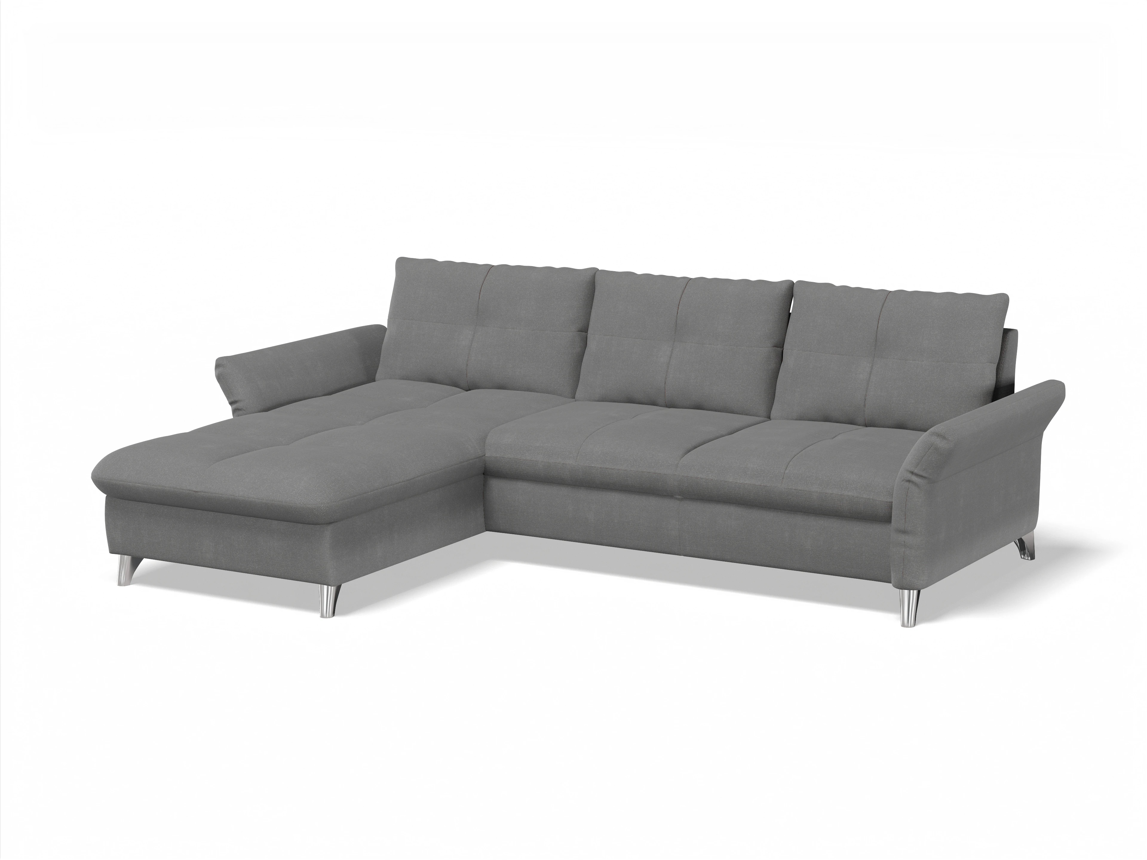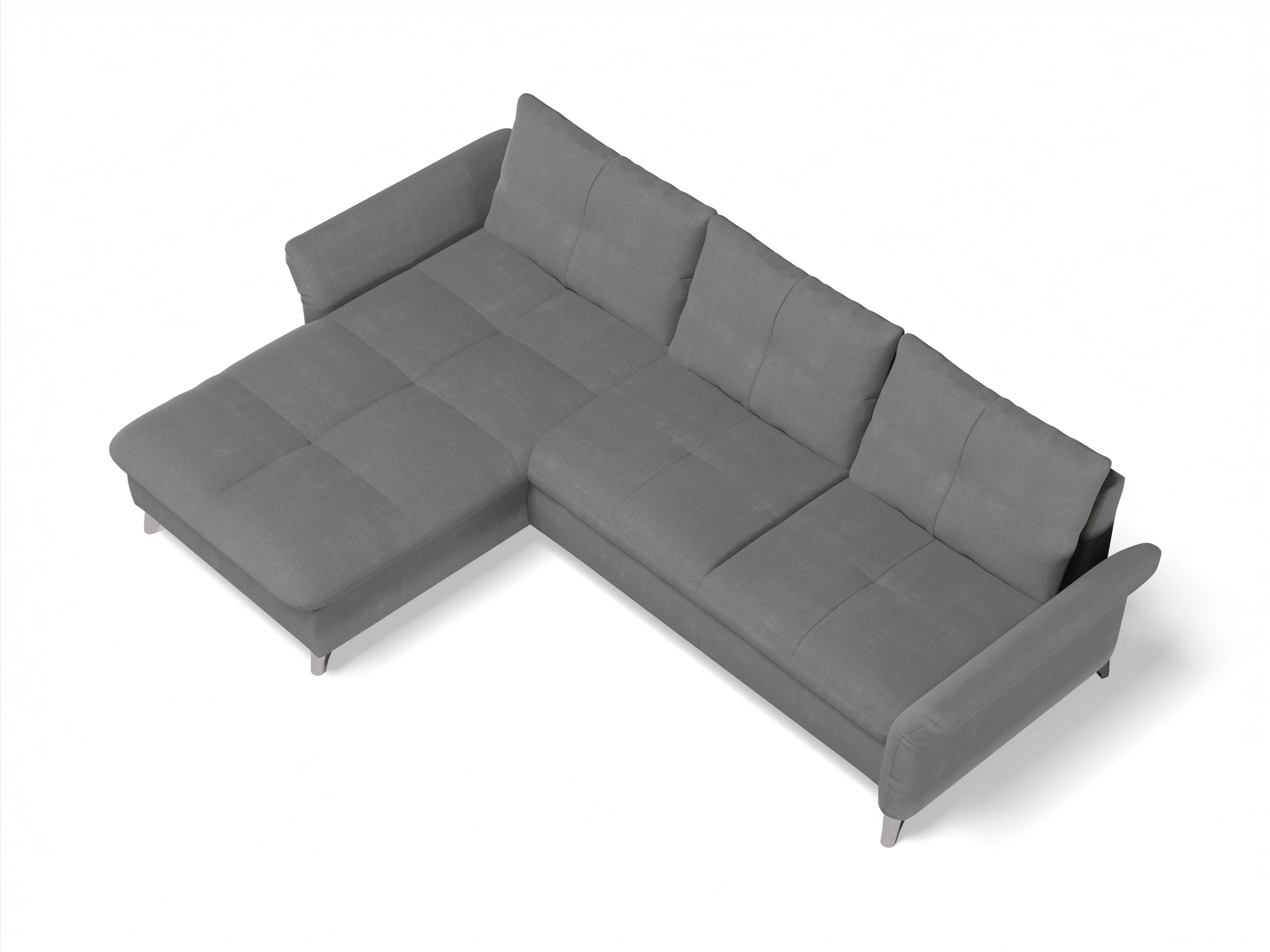 Das Ecksofa besteht aus einem Longchair mit Armlehne links und einem 2,5-Sitzer mit Armlehne rechts.