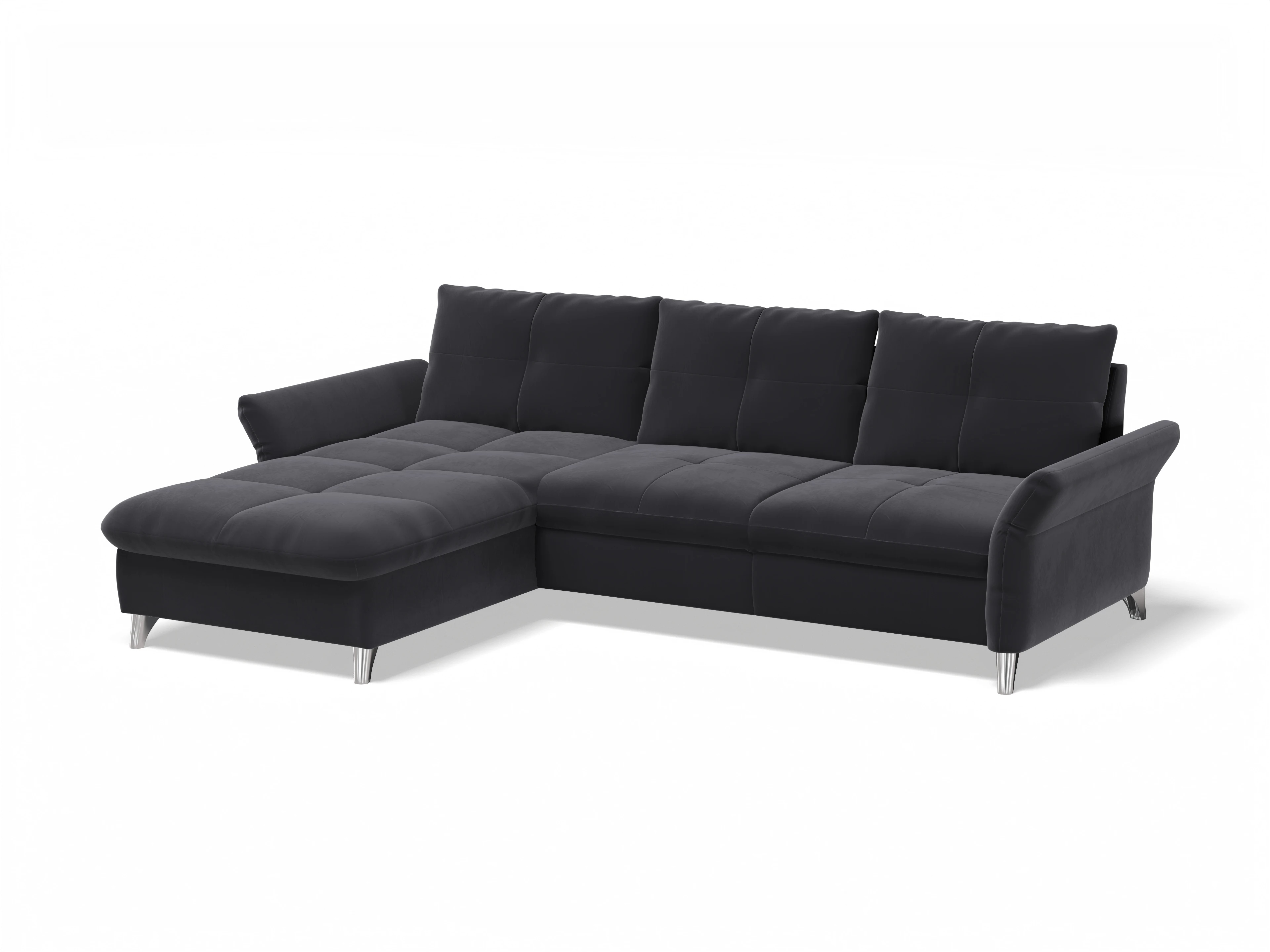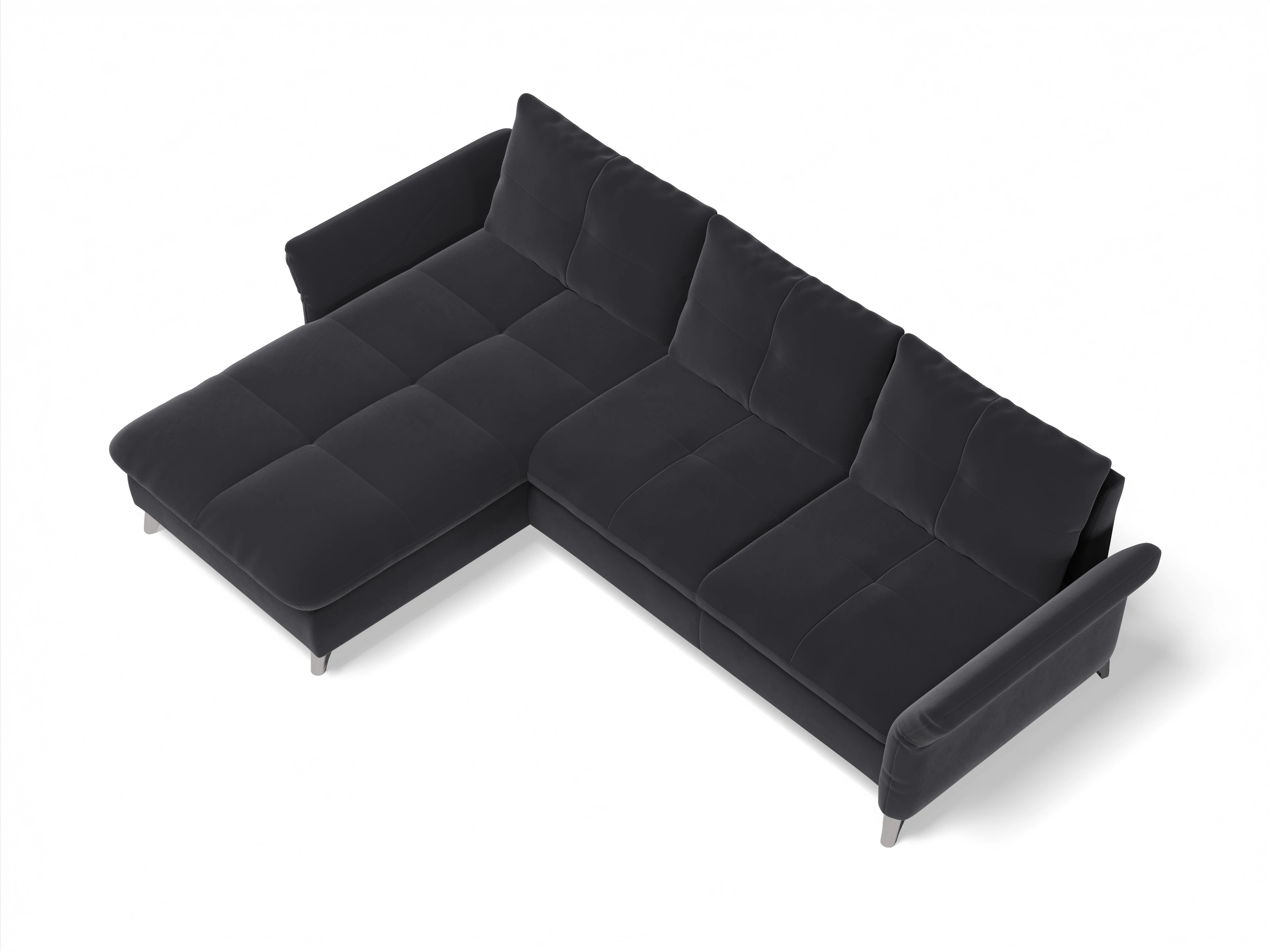 Das Ecksofa besteht aus einem Longchair mit Armlehne links und einem 2,5-Sitzer mit Armlehne rechts.