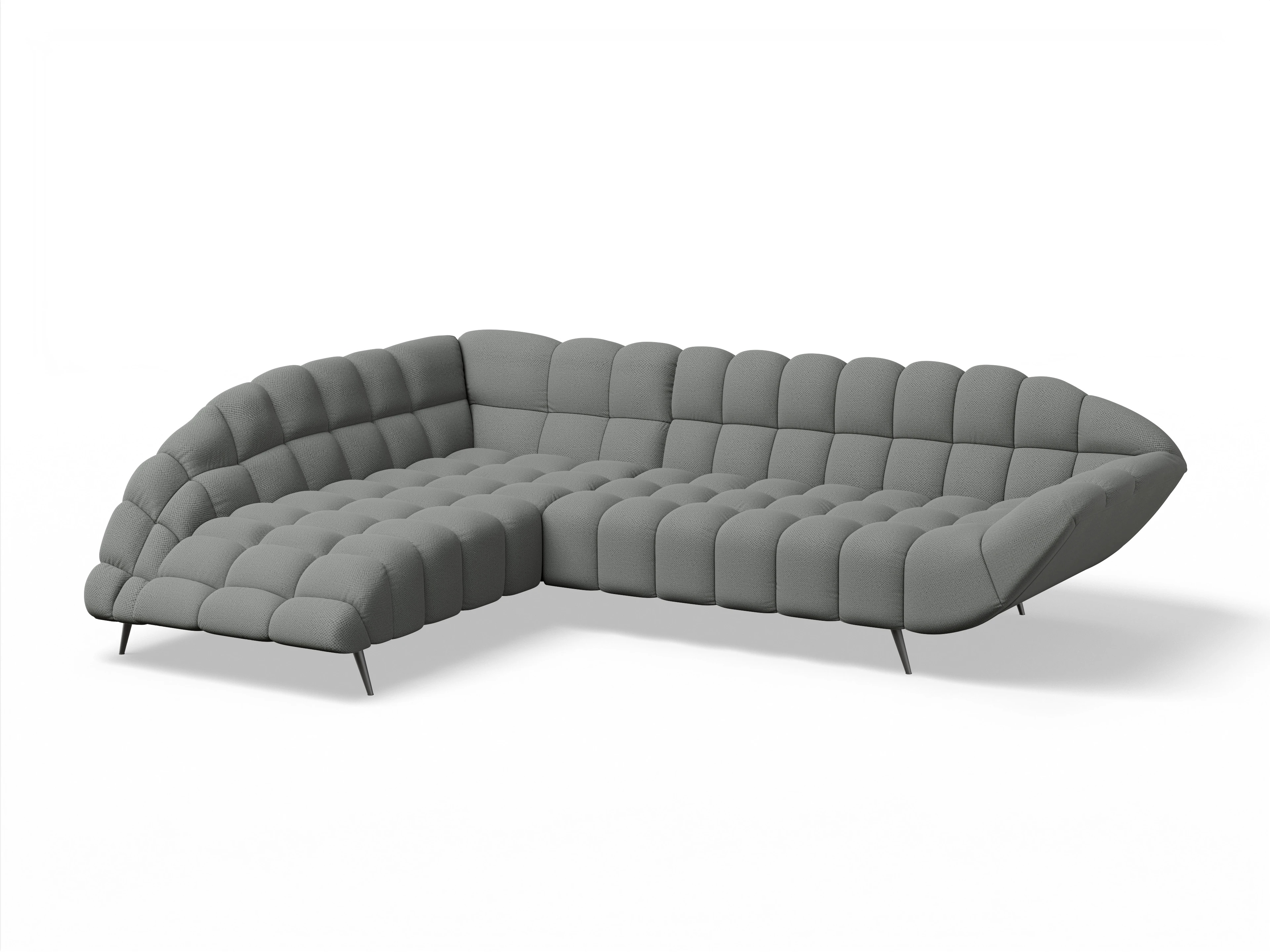 Das Ecksofa besteht aus einer Ottomane links und einem 2-Sitzer mit Armlehne rechts, ohne Funktion.