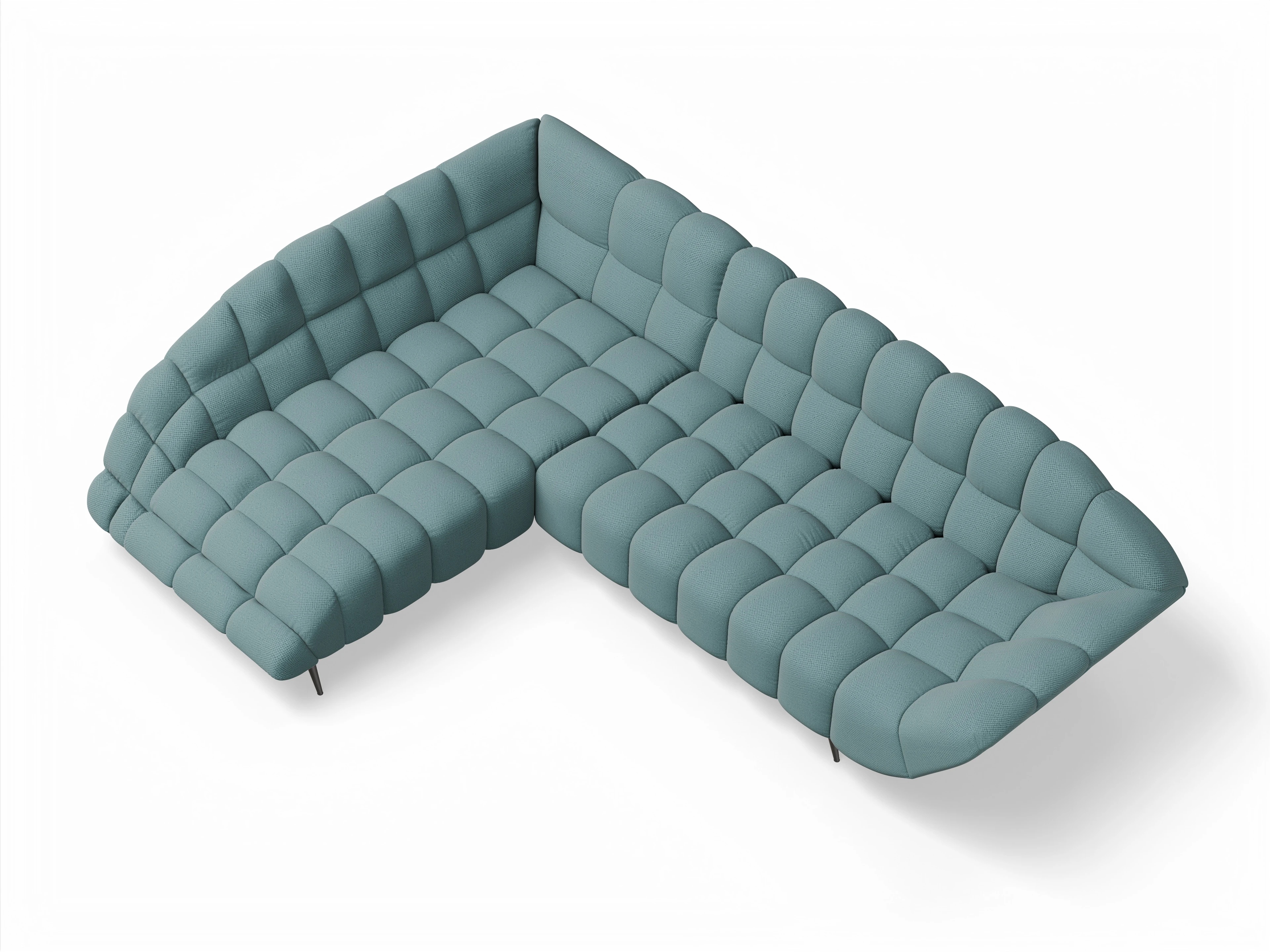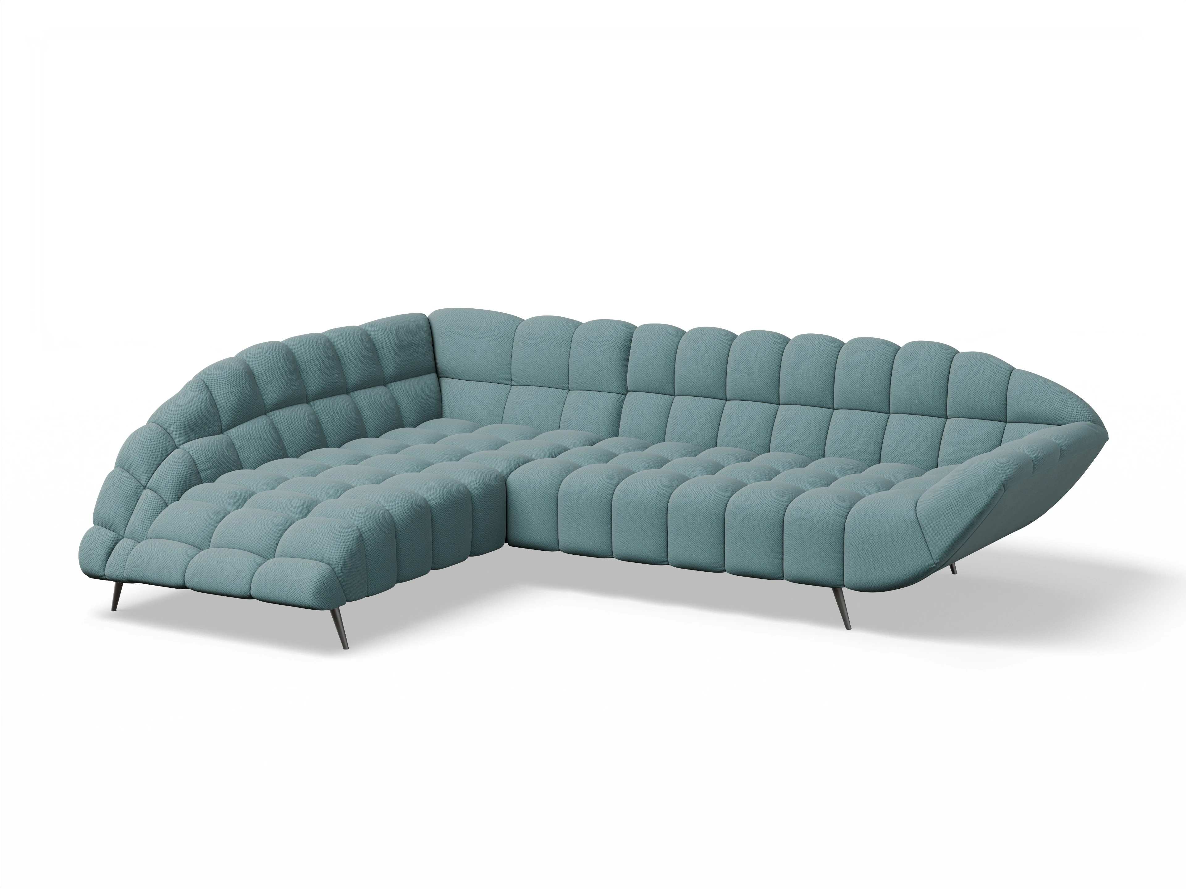 Das Ecksofa besteht aus einer Ottomane links und einem 2-Sitzer mit Armlehne rechts, ohne Funktion.