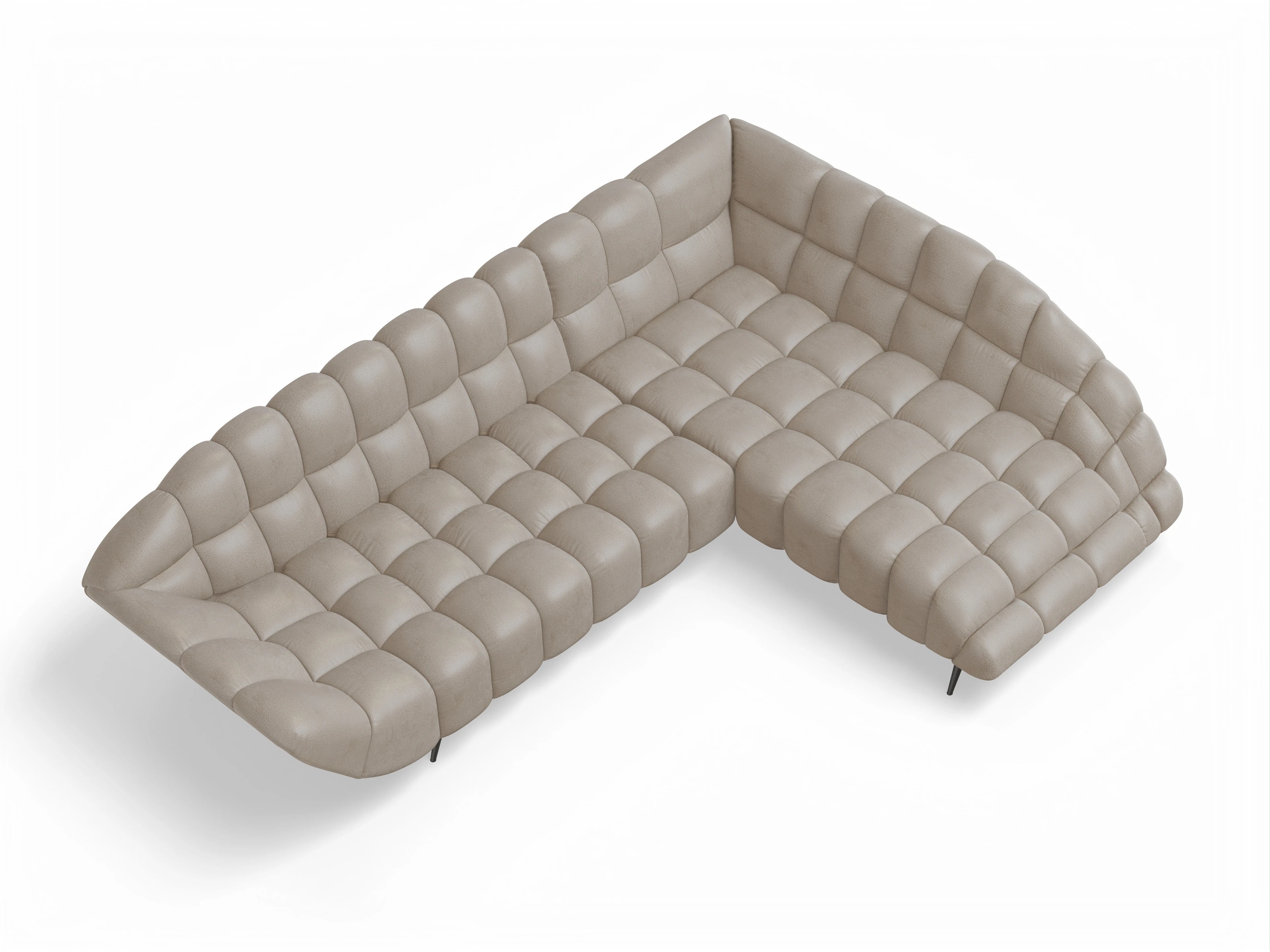 Das Ecksofa besteht aus einem 2-Sitzer mit Armlehne links und einer Ottomane rechts, ohne Funktion.