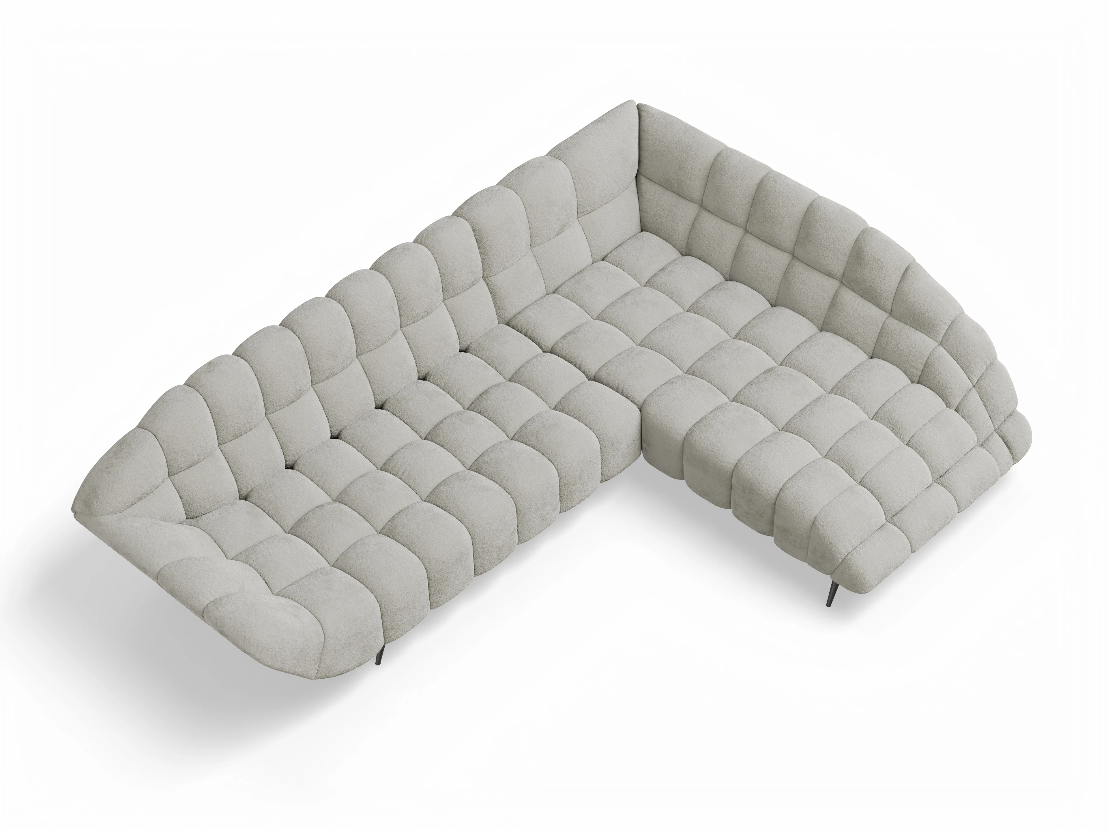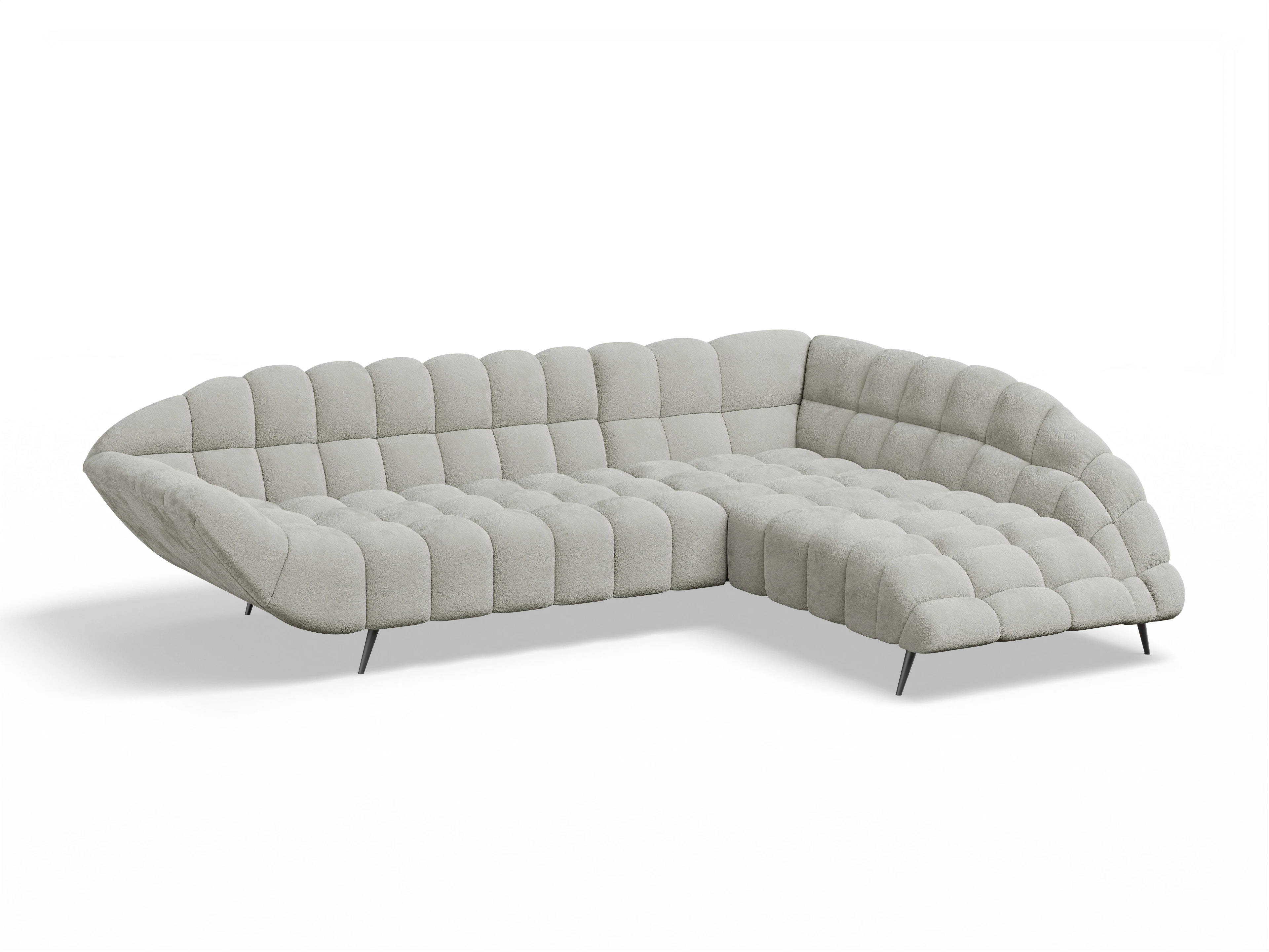Das Ecksofa besteht aus einem 2-Sitzer mit Armlehne links und einer Ottomane rechts, ohne Funktion.