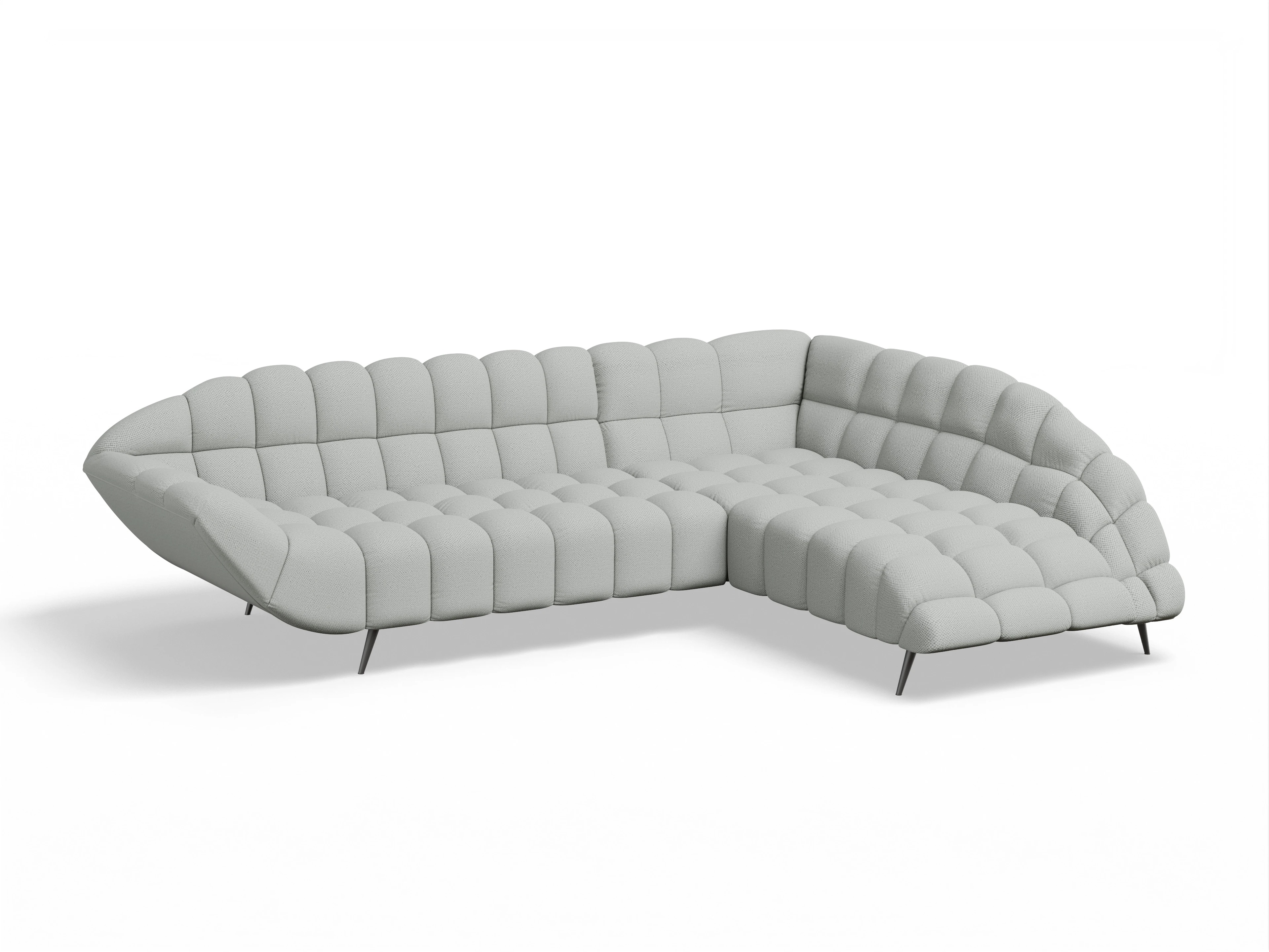 Das Ecksofa besteht aus einem 2-Sitzer mit Armlehne links und einer Ottomane rechts, ohne Funktion.
