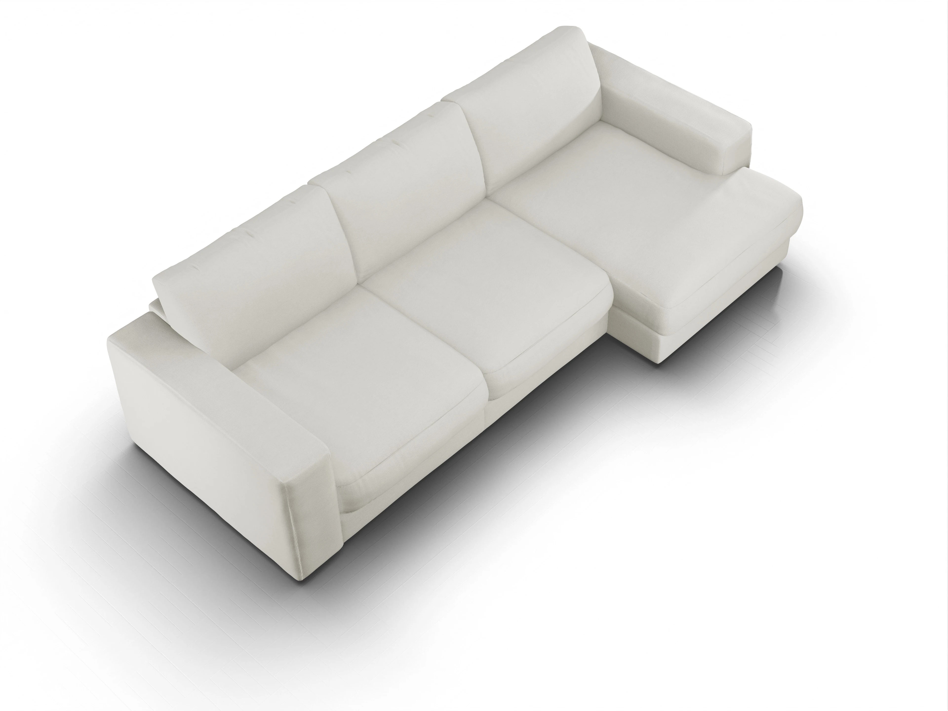 Das Mammut Ecksofa besteht aus einem 1-Sitzer mit Armlehne links, einem 1-Sitzer ohne Armlehnen und einem Longchair klein mit Armlehne rechts.
