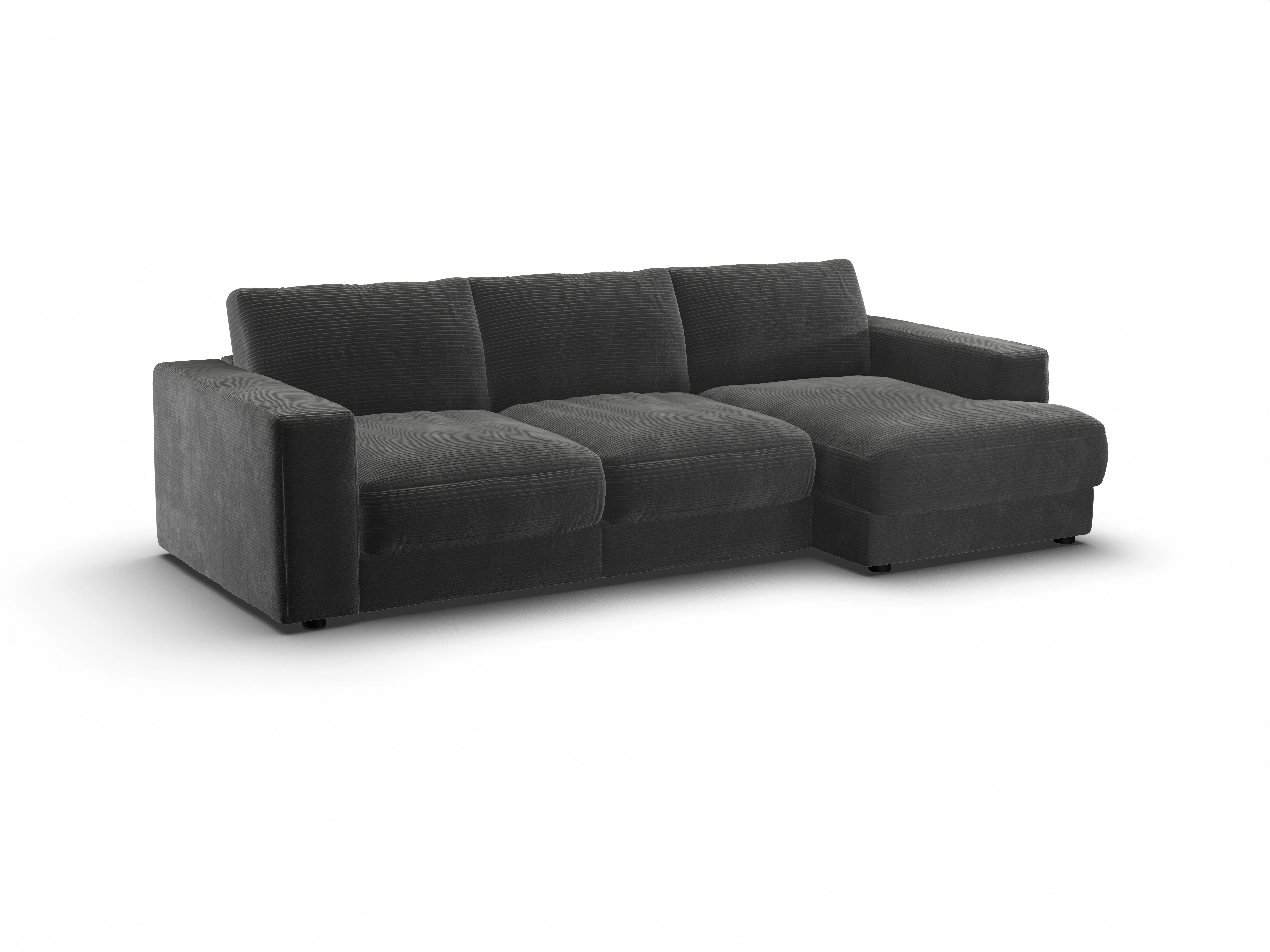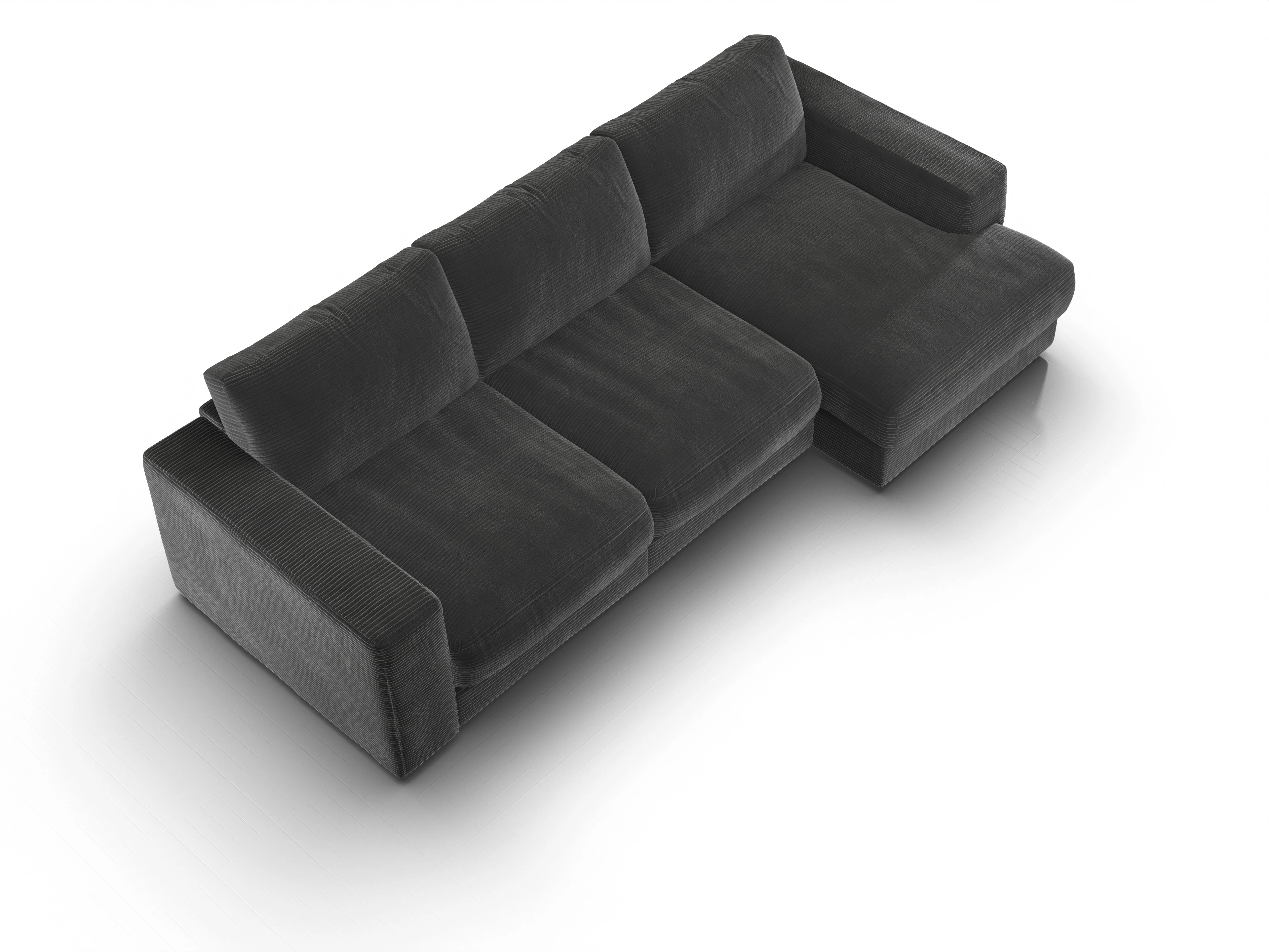 Das Mammut Ecksofa besteht aus einem 1-Sitzer mit Armlehne links, einem 1-Sitzer ohne Armlehnen und einem Longchair klein mit Armlehne rechts.