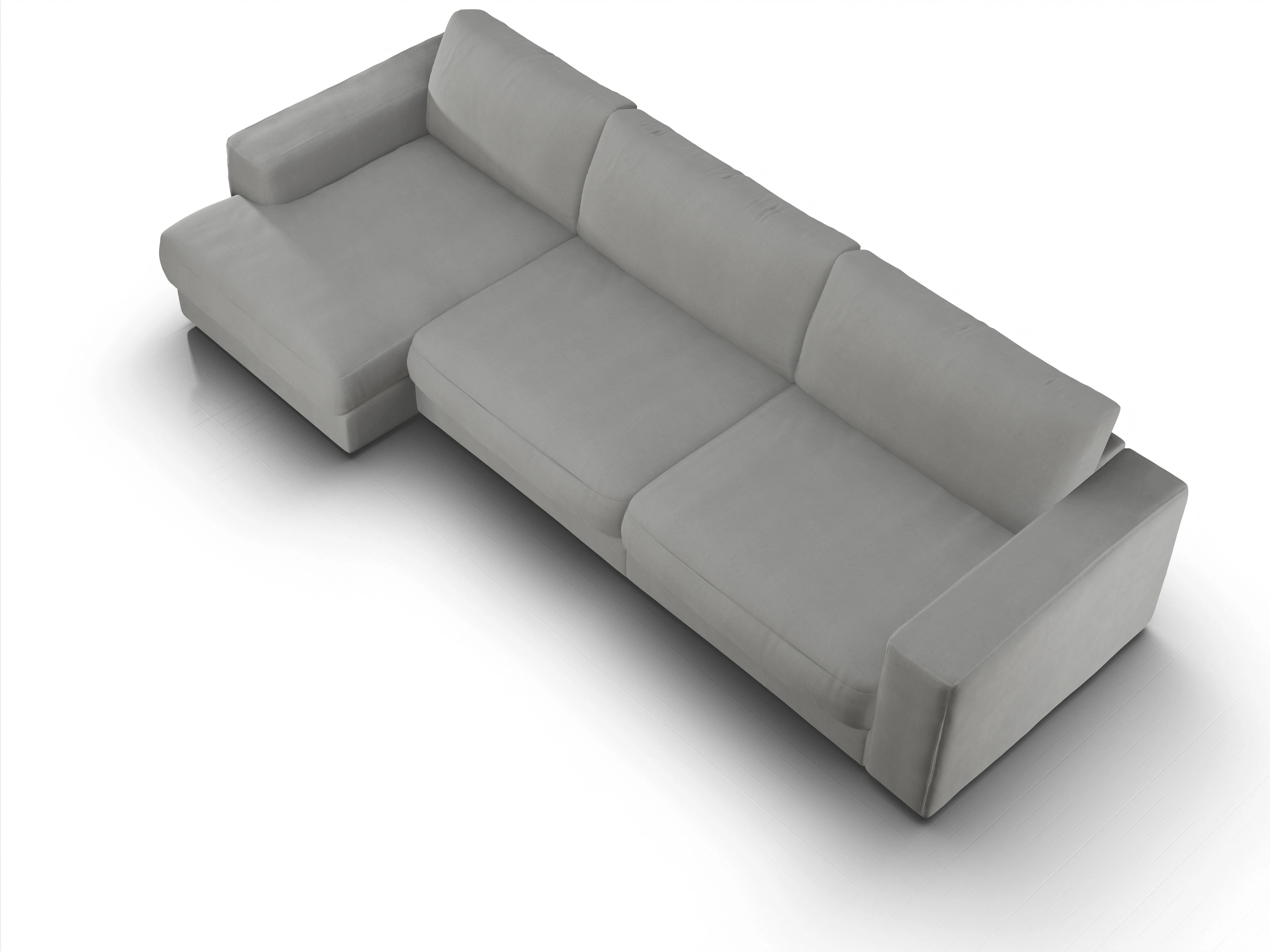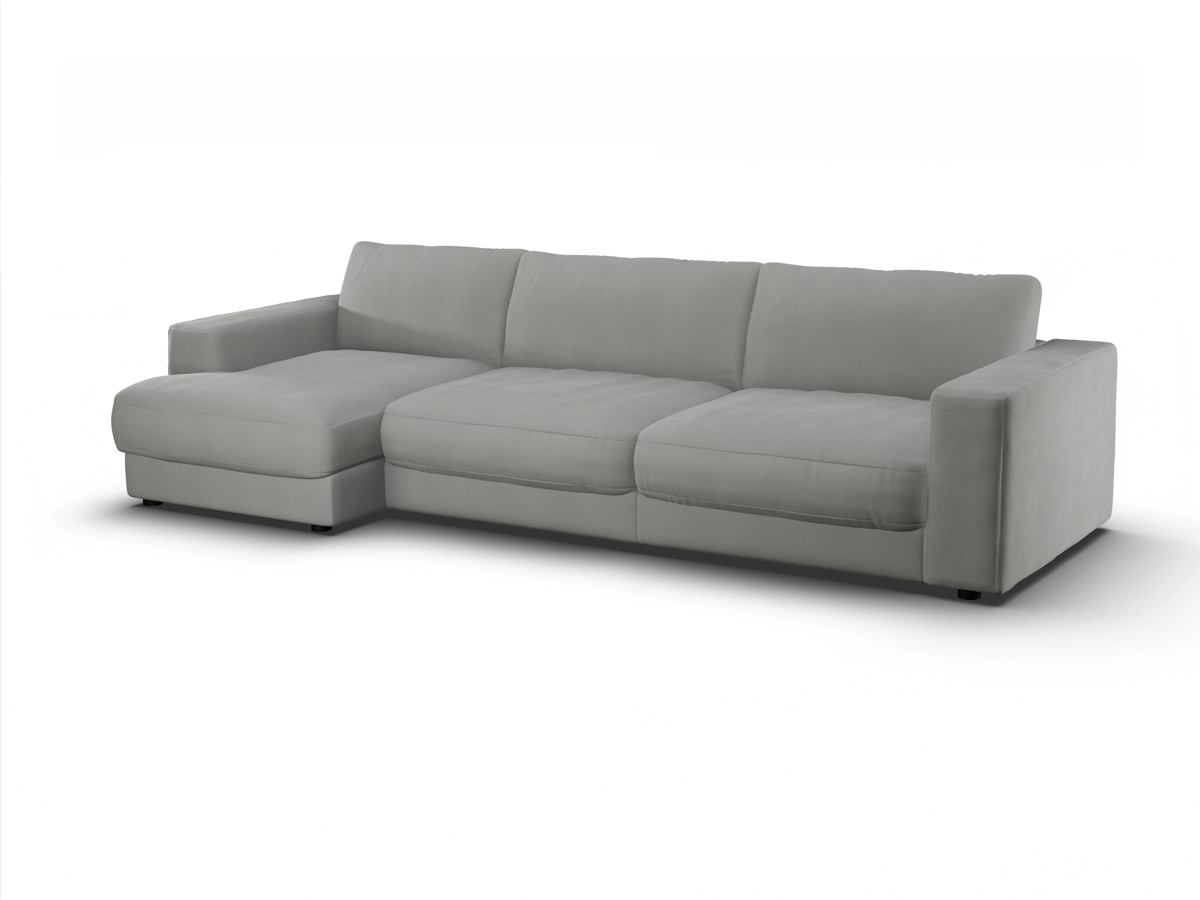 Das Mammut Ecksofa besteht aus einem Longchair klein mit Armlehne links, einem 1,5-Sitzer ohne Armlehnen und einem 1,5-Sitzer mit Armlehne rechts.