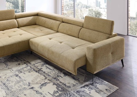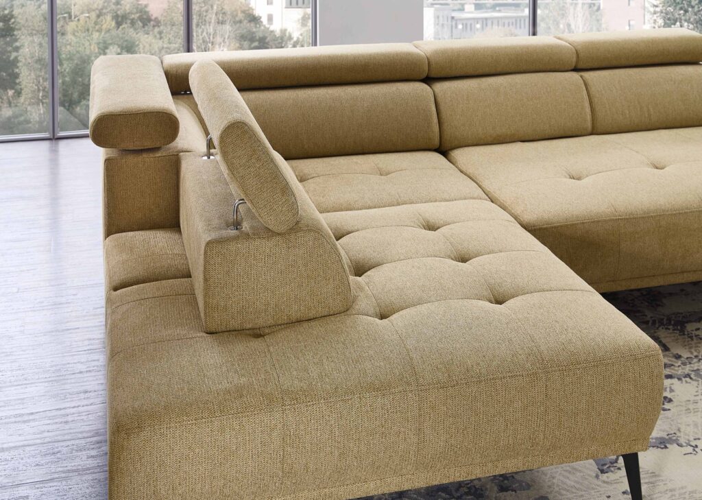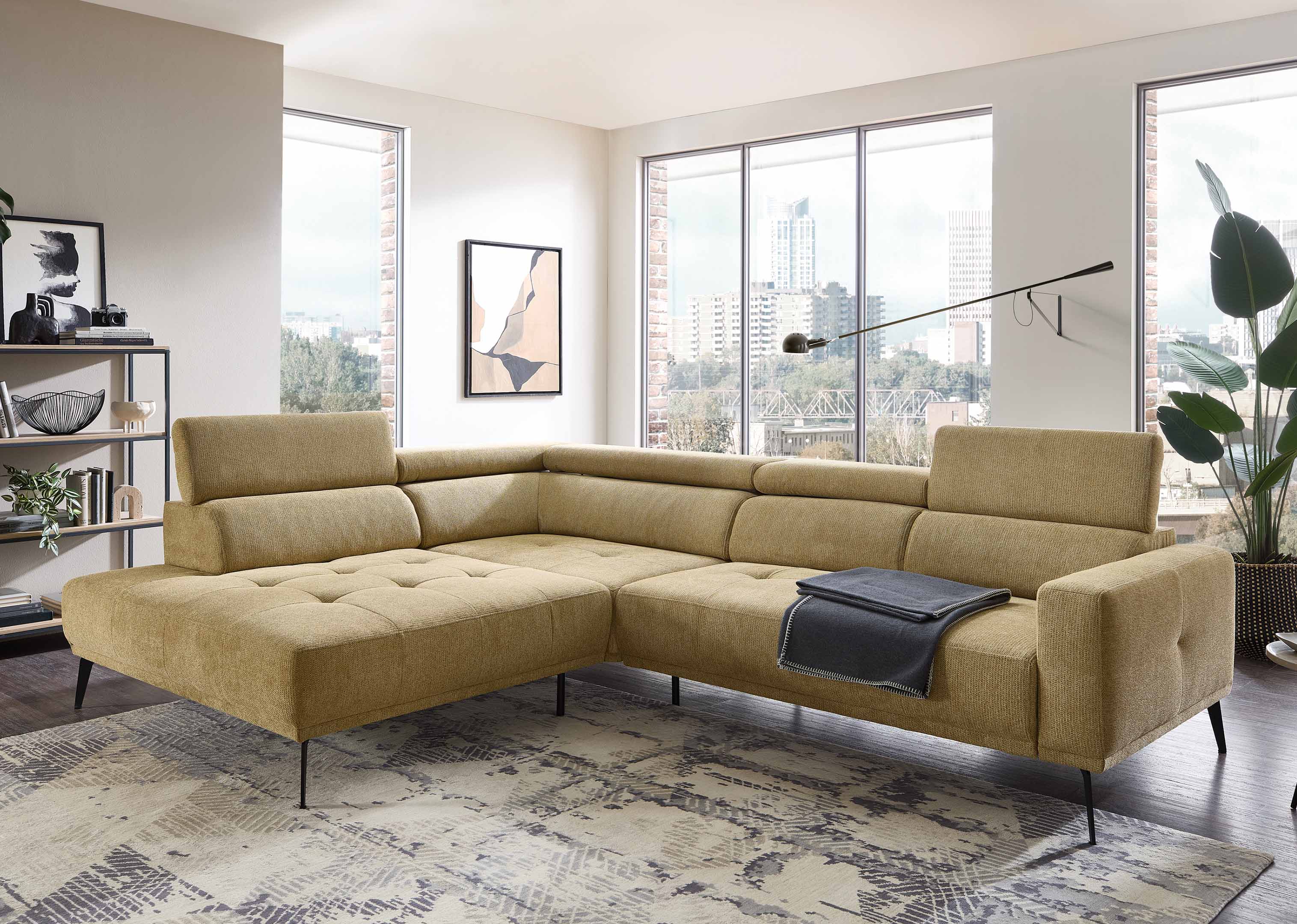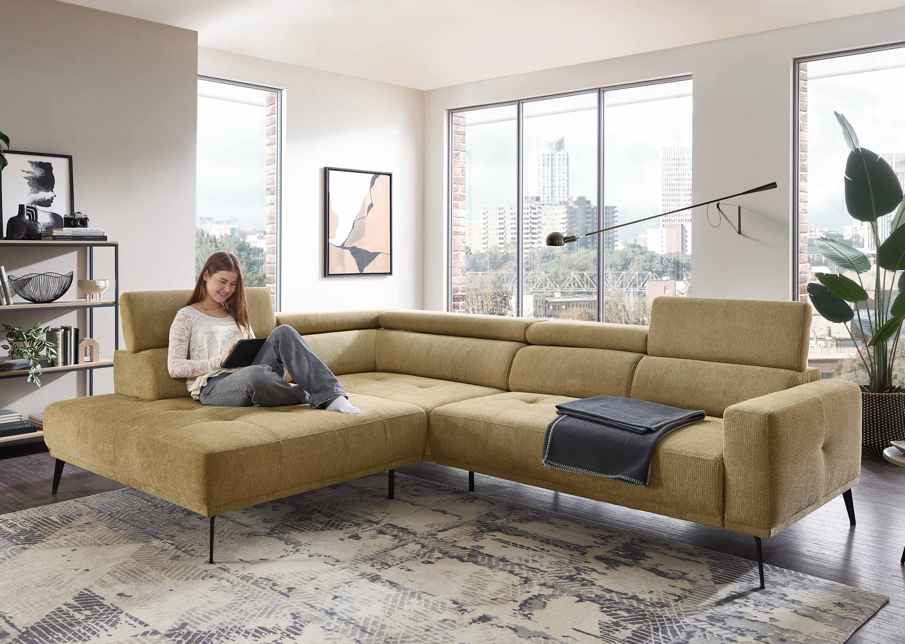 Das Ecksofa besteht aus einem 2-Sitzer mit Armlehne links und einem Longchair mit Armlehne rechts. Das Sofa kommt inklusive 3x Kopfteilverstellung.