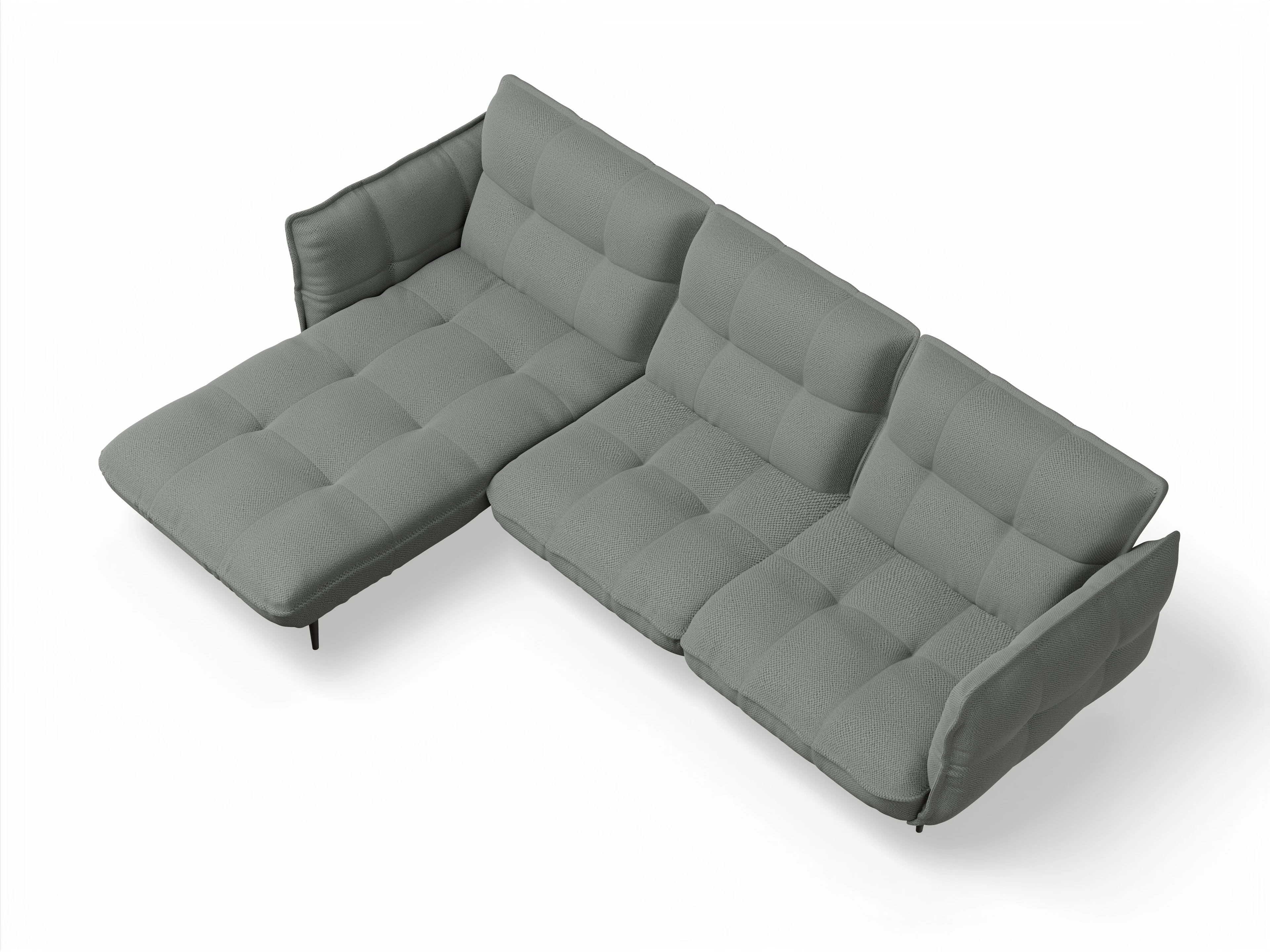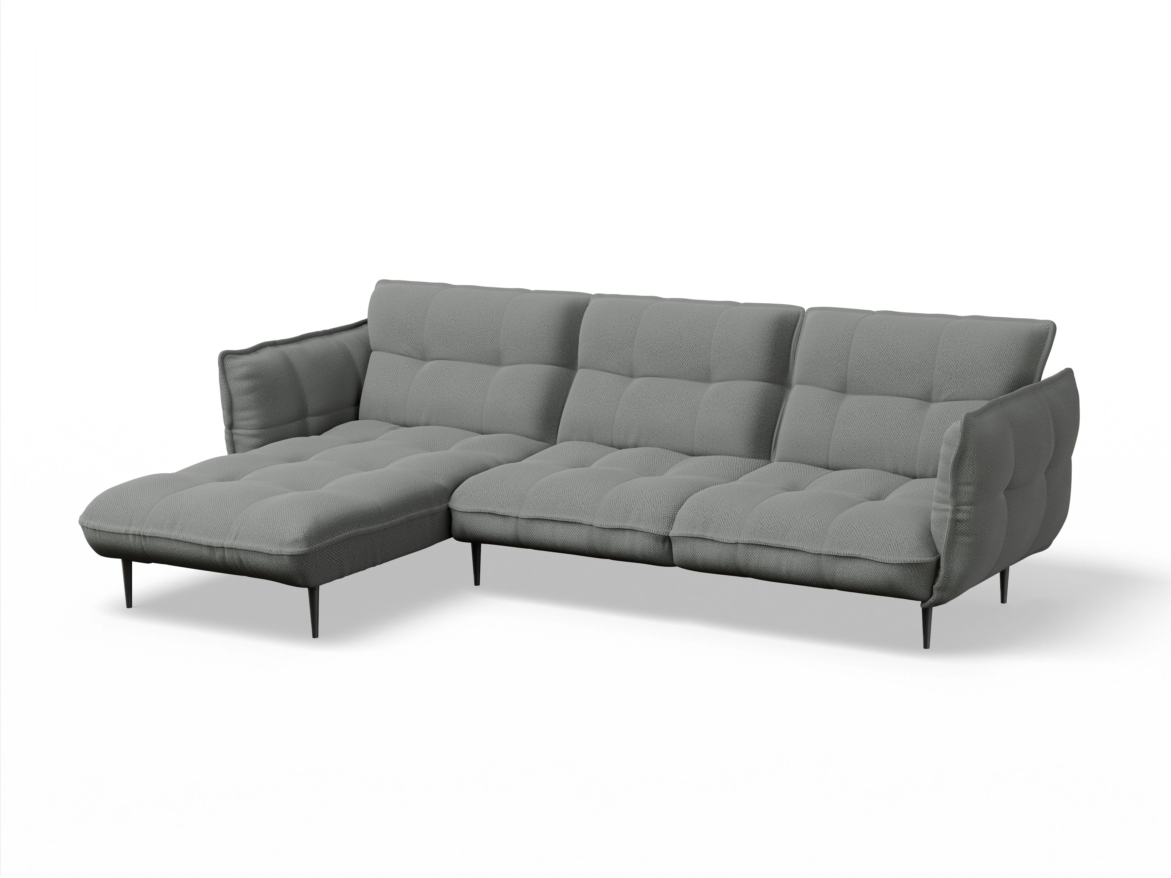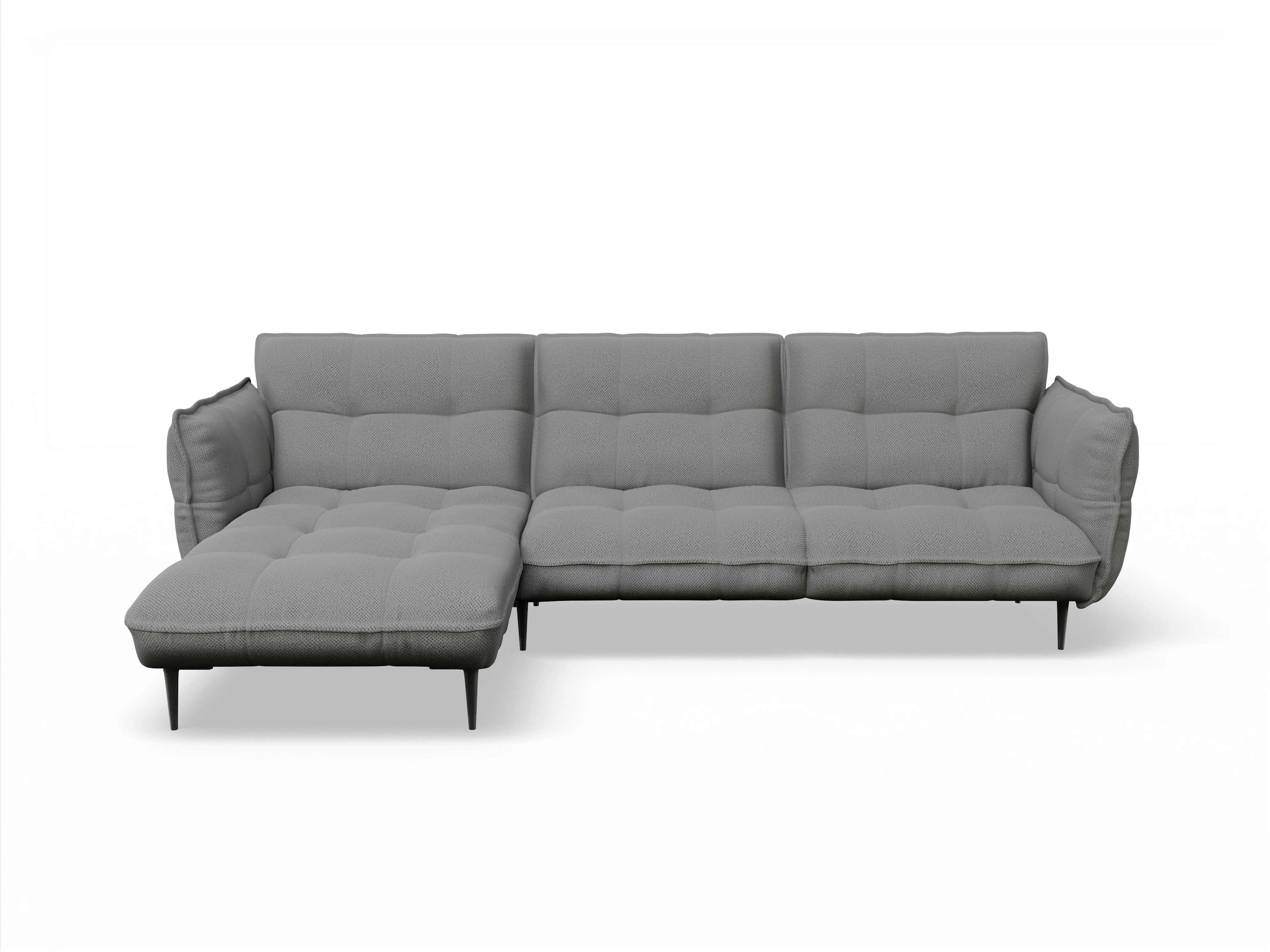 Das Ecksofa besteht aus einem Longchair mit Armlehne links und einem 2,5-Sitzer mit Armlehne rechts.