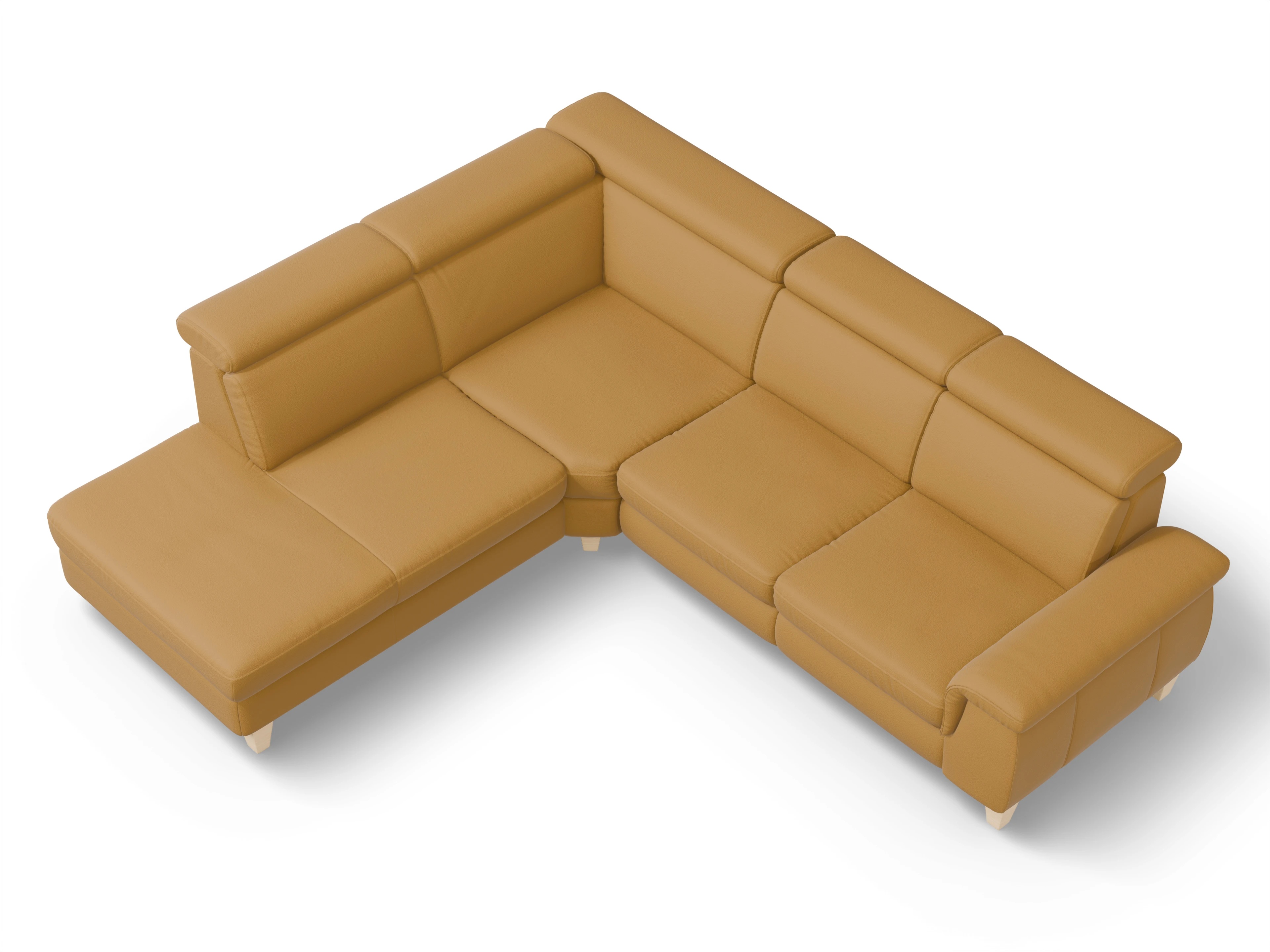 Das Ecksofa setzt sich aus einem 1-Sitzer mit Anschlusshocker links, einer Winkelecke und einem 2,5-Sitzer mit Armlehne rechts zusammen.