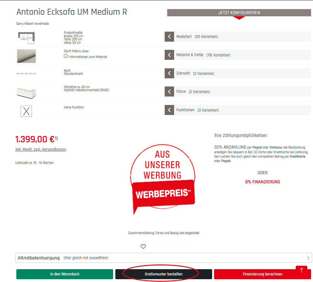 2. Auf der ausgewählten Produktseite finden Sie Button "Gratismuster bestellen"- so kommen Sie zu der Stoffkollektion des Sofaherstellers