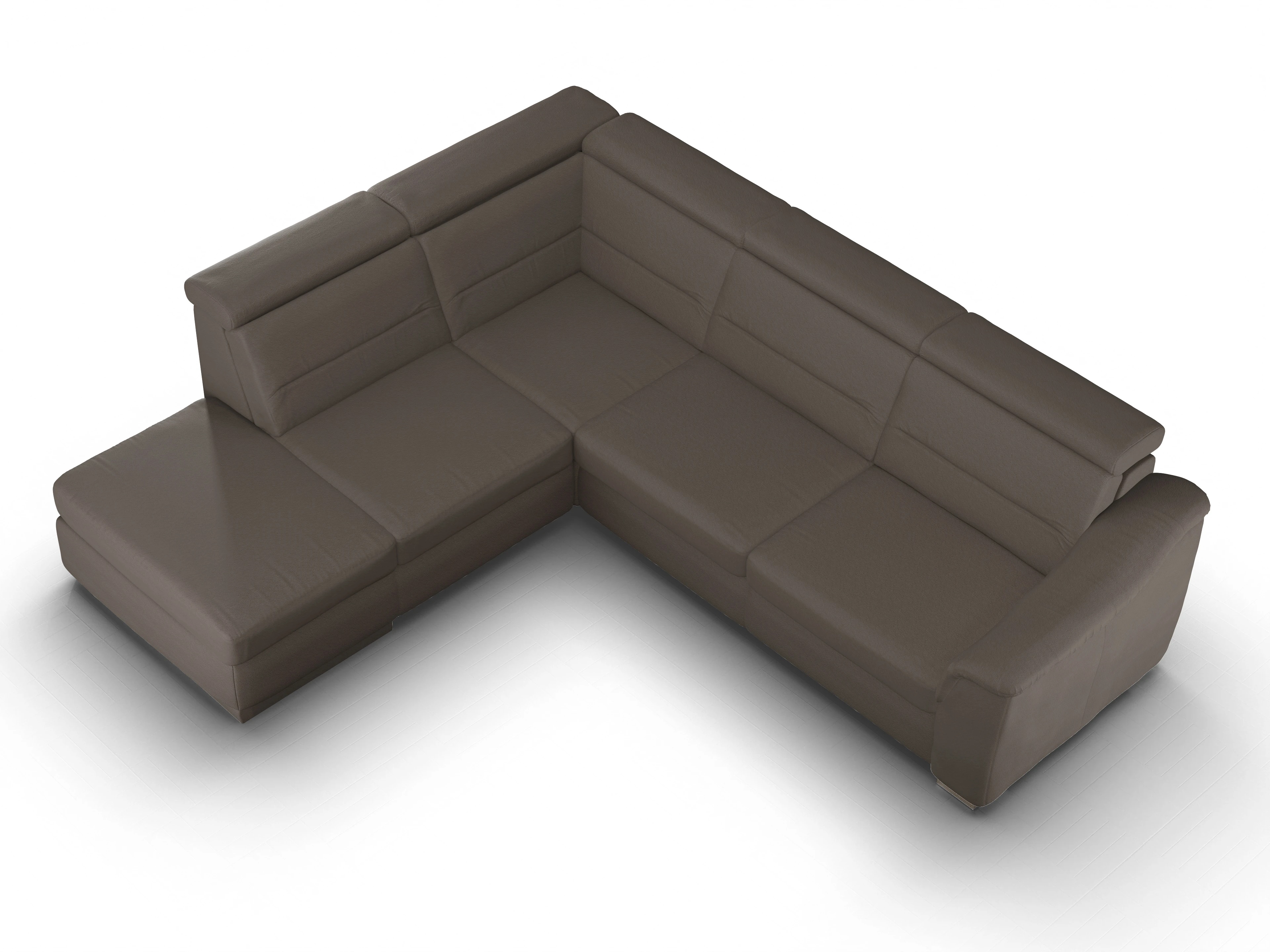 Die Ecksofa besteht aus einem 1,5-Sitzer Kombielement mit Anstellhocker links, wahlweise mit Stauraum und Schubkasten und einem 3-Sitzer mit Armlehne rechts, wahlweise mit Schlaffunktion oder Relaxfunktion.