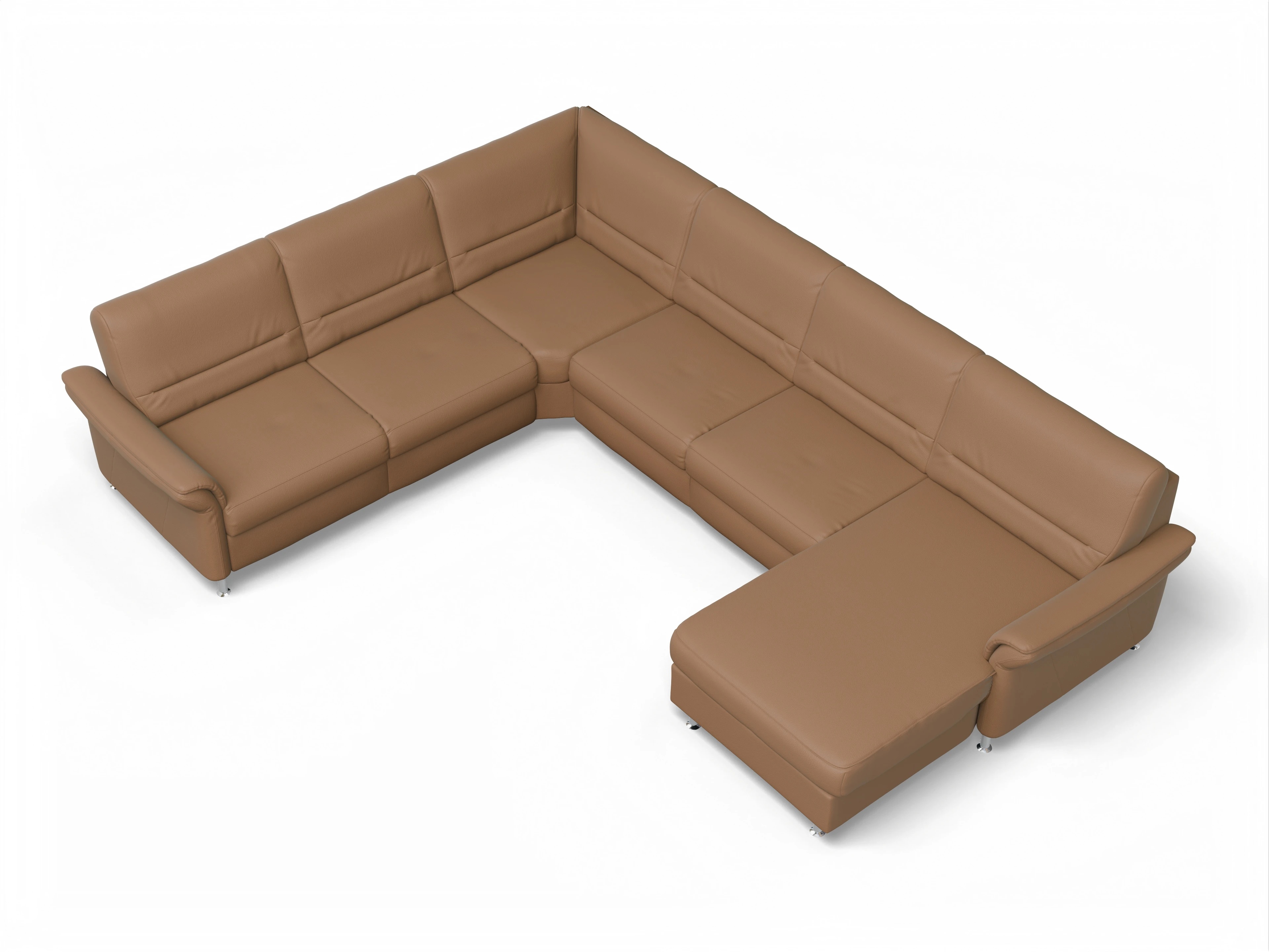 Die Wohnlandschaft besteht aus einem 2,5-Sitzer mit Armlehne links, wahlweise mit Relaxfunktion, einer Rundecke, einem 2,5-Sitzer mittig, wahlweise mit Schlaffunktion sowie einem Canape mit Armlehne rechts, wahlweise mit Stauraum.