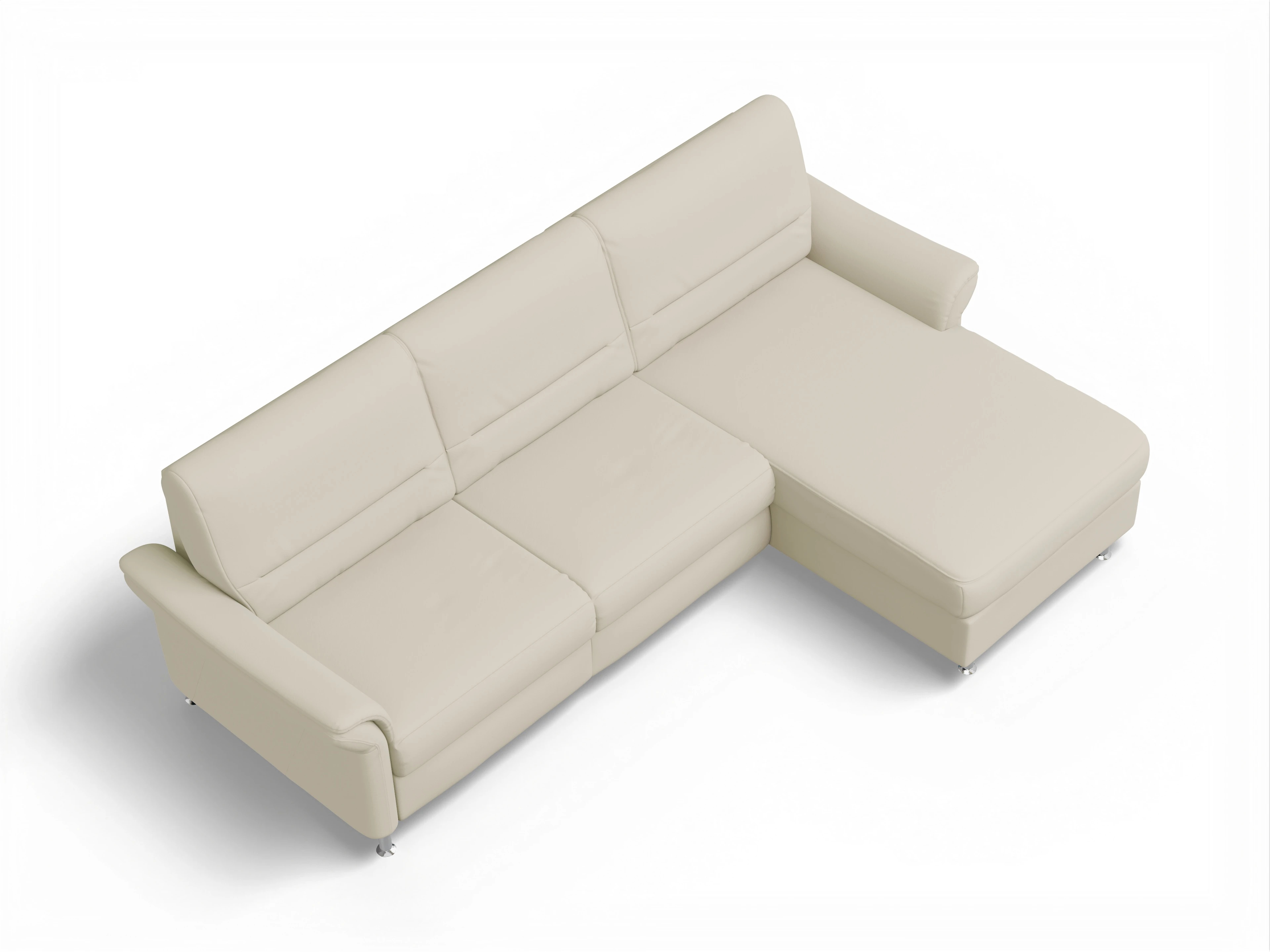 Das Ecksofa besteht aus einem 2,5-Sitzer mit Armlehne links, wahlweise mit Relaxfunktion oder Schlaffunktion sowie einem Canape mit Armlehne rechts, wahlweise mit Stauraum oder Relaxfunktion.