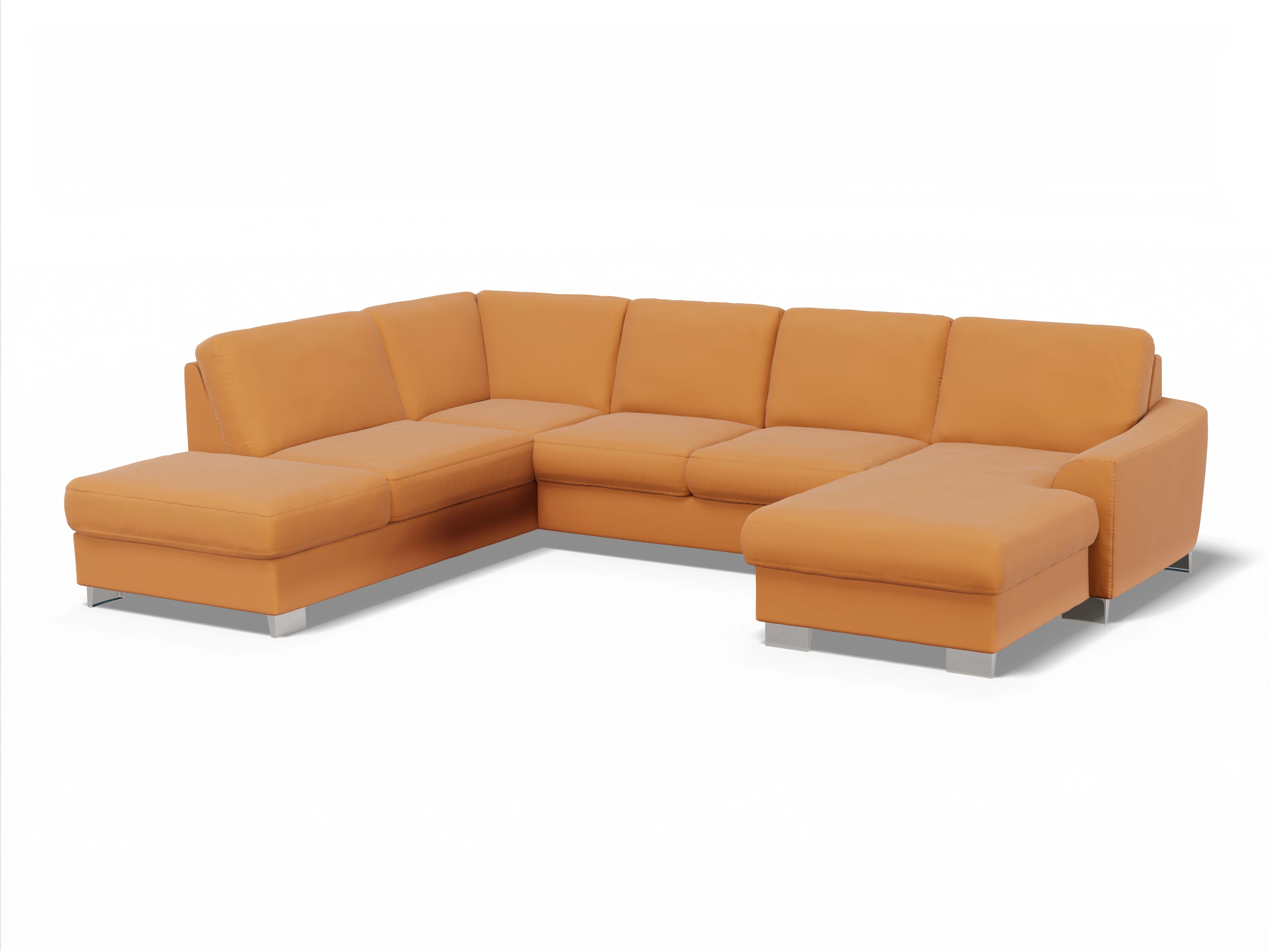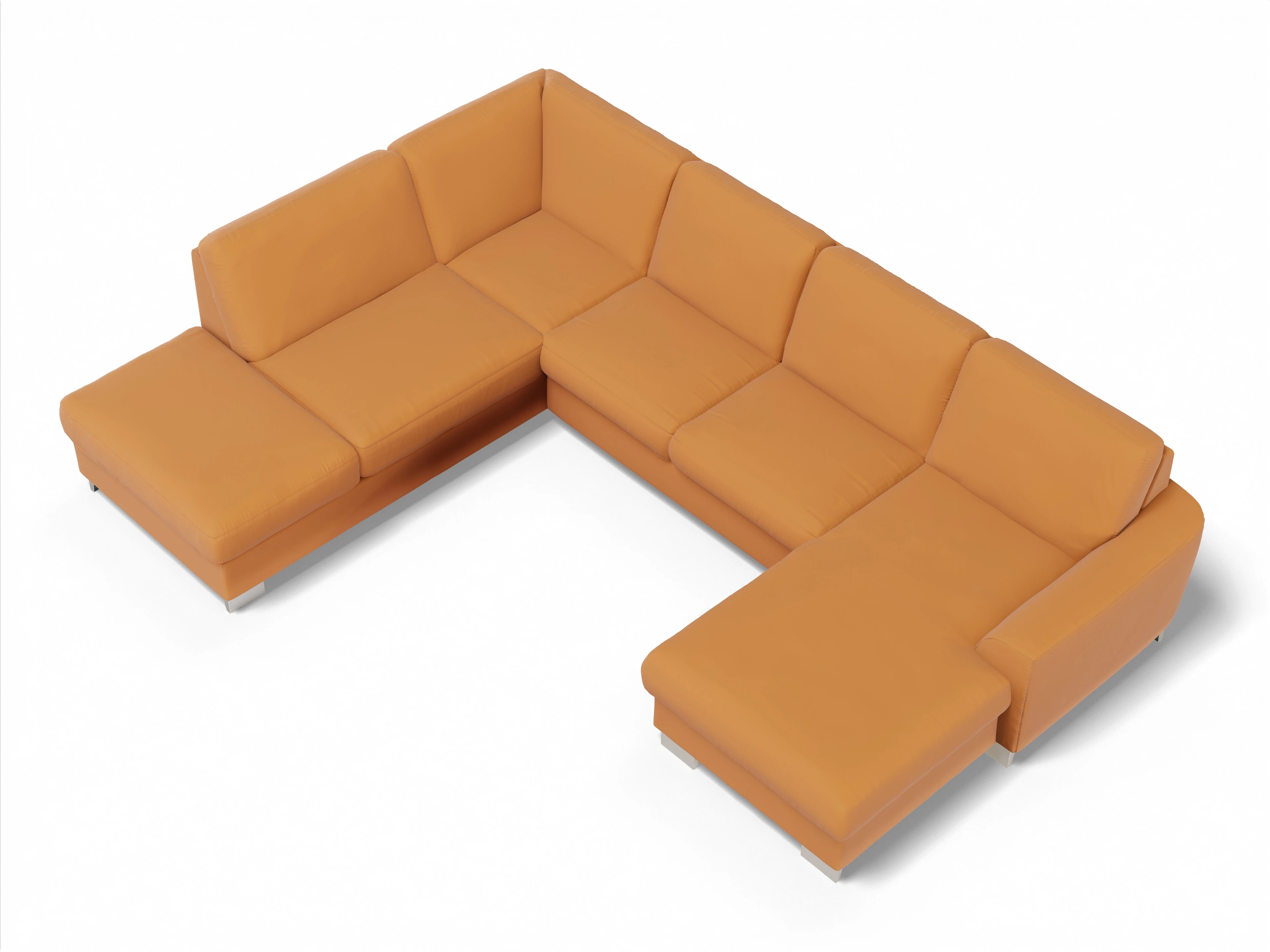 Die Wohnlandschaft besteht aus einem 1,5-Sitzer Kombielement mit Anstellhocker links, wahlweise mit Schubkasten und Stauraum, einem 2,5-Sitzer mittig, wahlweise mit Schlaffunktion und einem Canape rechts, wahlweise mit Bettkasten.