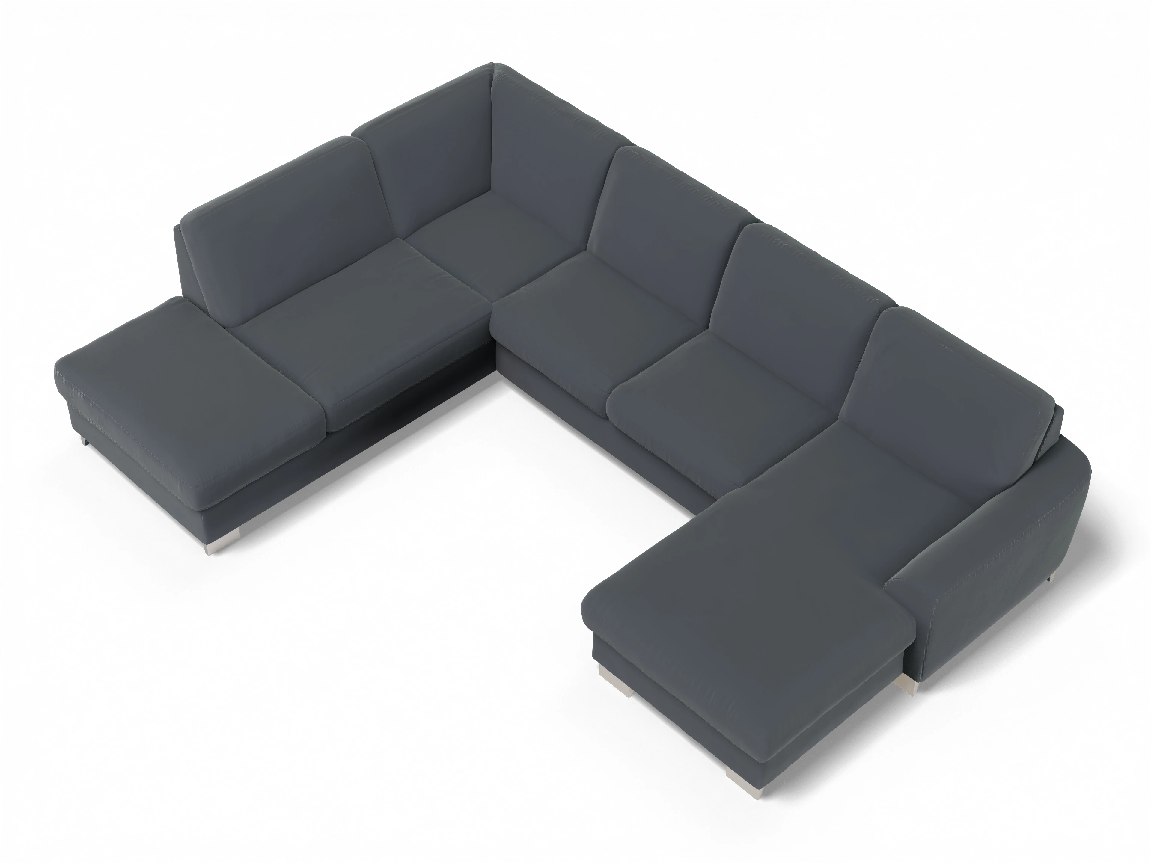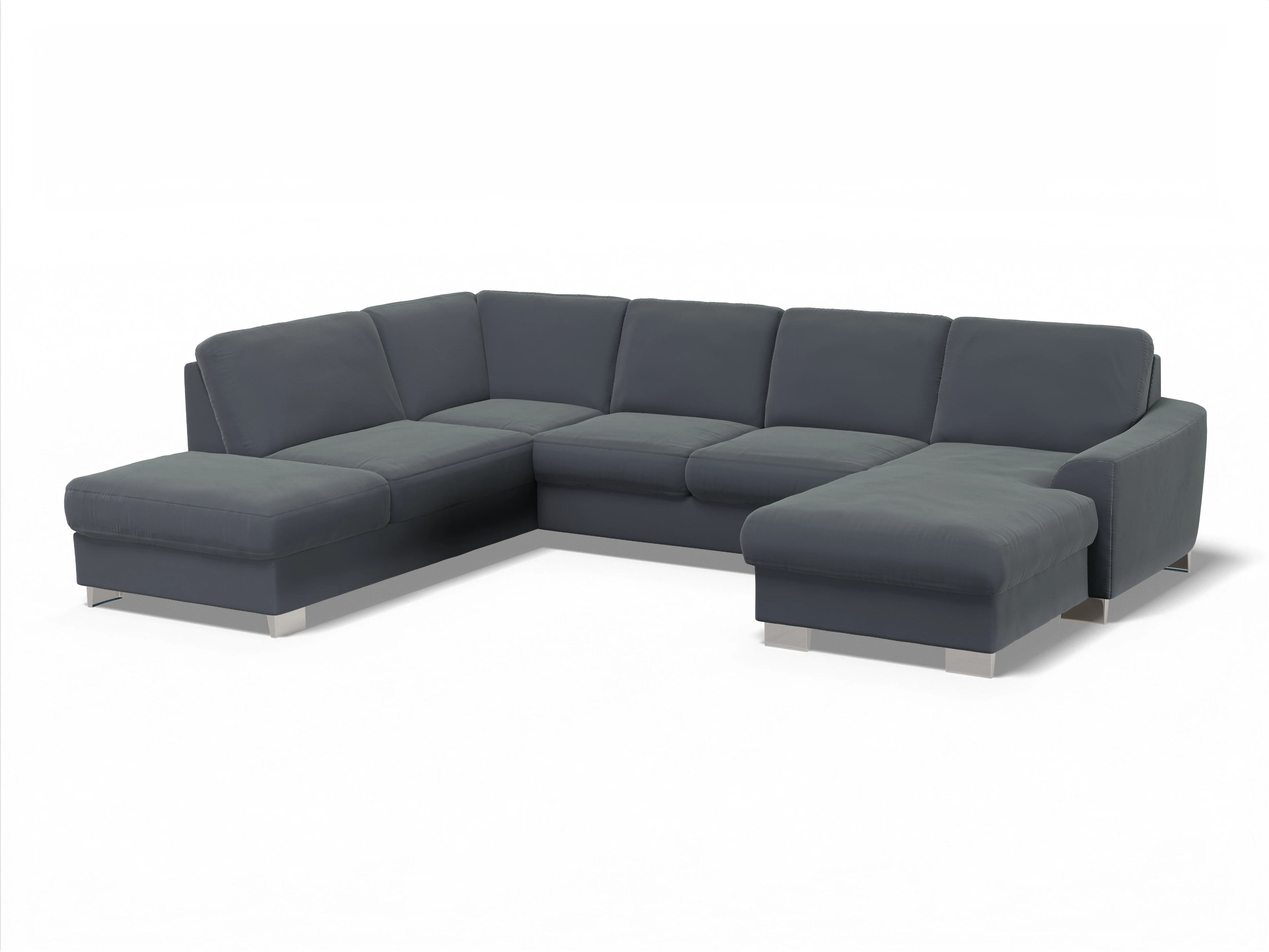 Die Wohnlandschaft besteht aus einem 1,5-Sitzer Kombielement mit Anstellhocker links, wahlweise mit Schubkasten und Stauraum, einem 2,5-Sitzer mittig, wahlweise mit Schlaffunktion und einem Canape rechts, wahlweise mit Bettkasten.