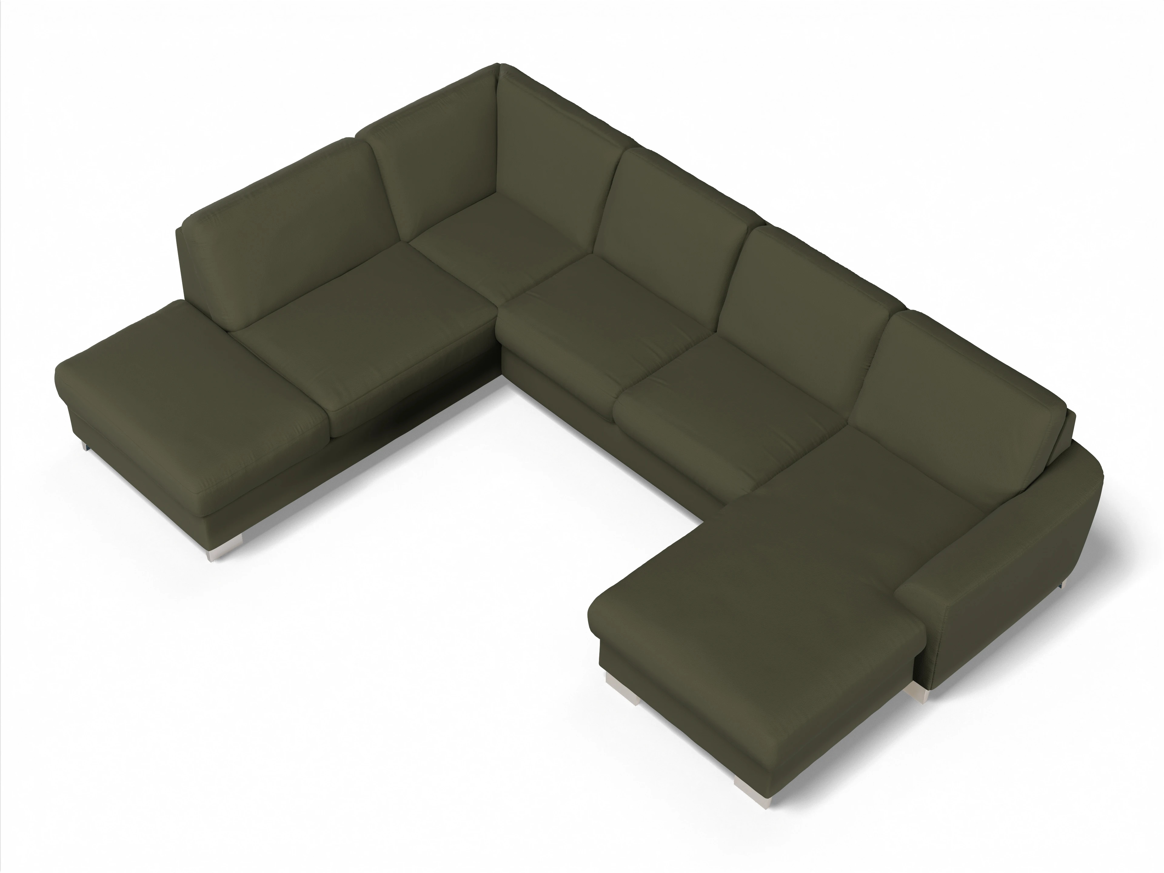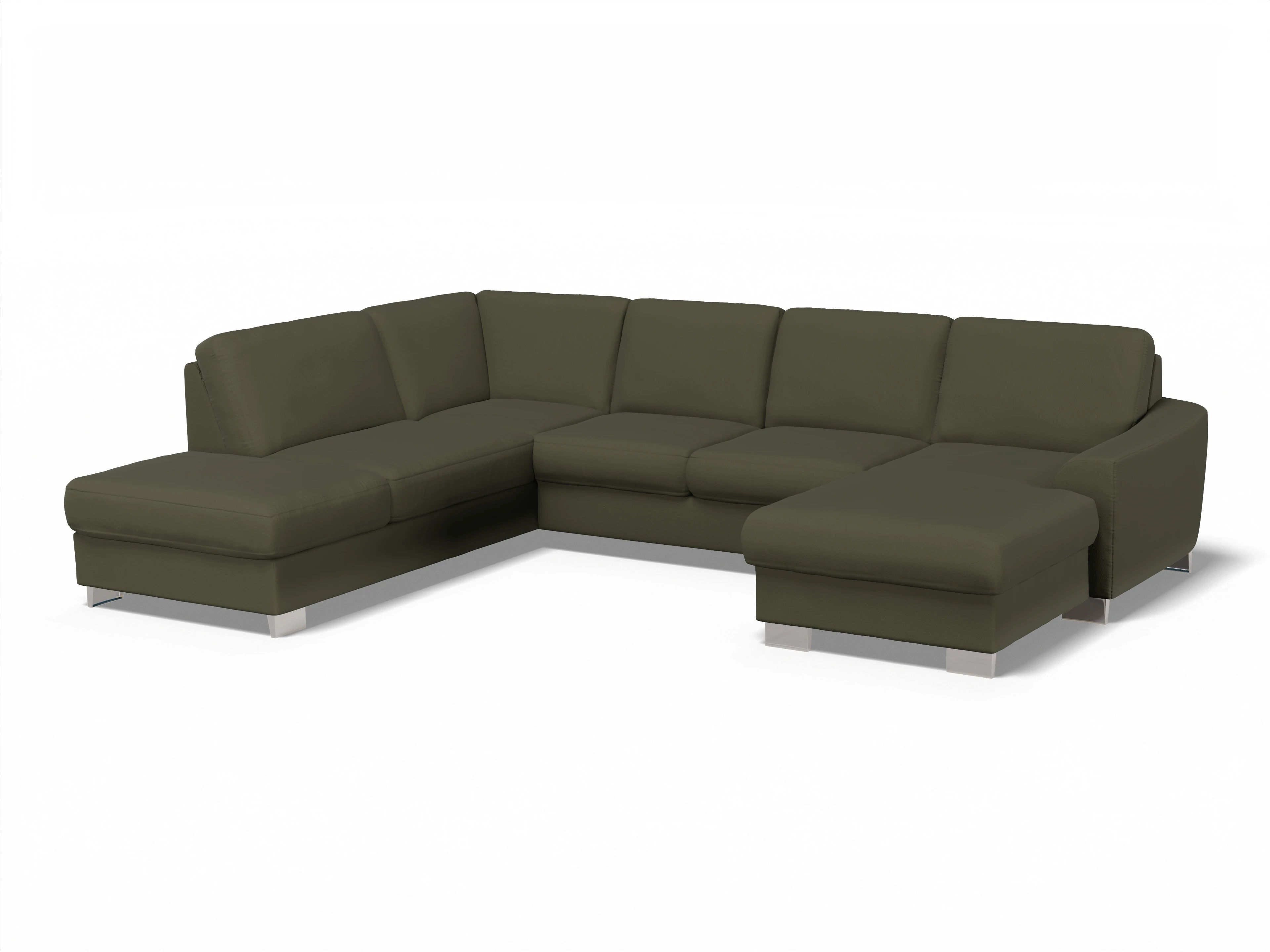 Die Wohnlandschaft besteht aus einem 1,5-Sitzer Kombielement mit Anstellhocker links, wahlweise mit Schubkasten und Stauraum, einem 2,5-Sitzer mittig, wahlweise mit Schlaffunktion und einem Canape rechts, wahlweise mit Bettkasten.