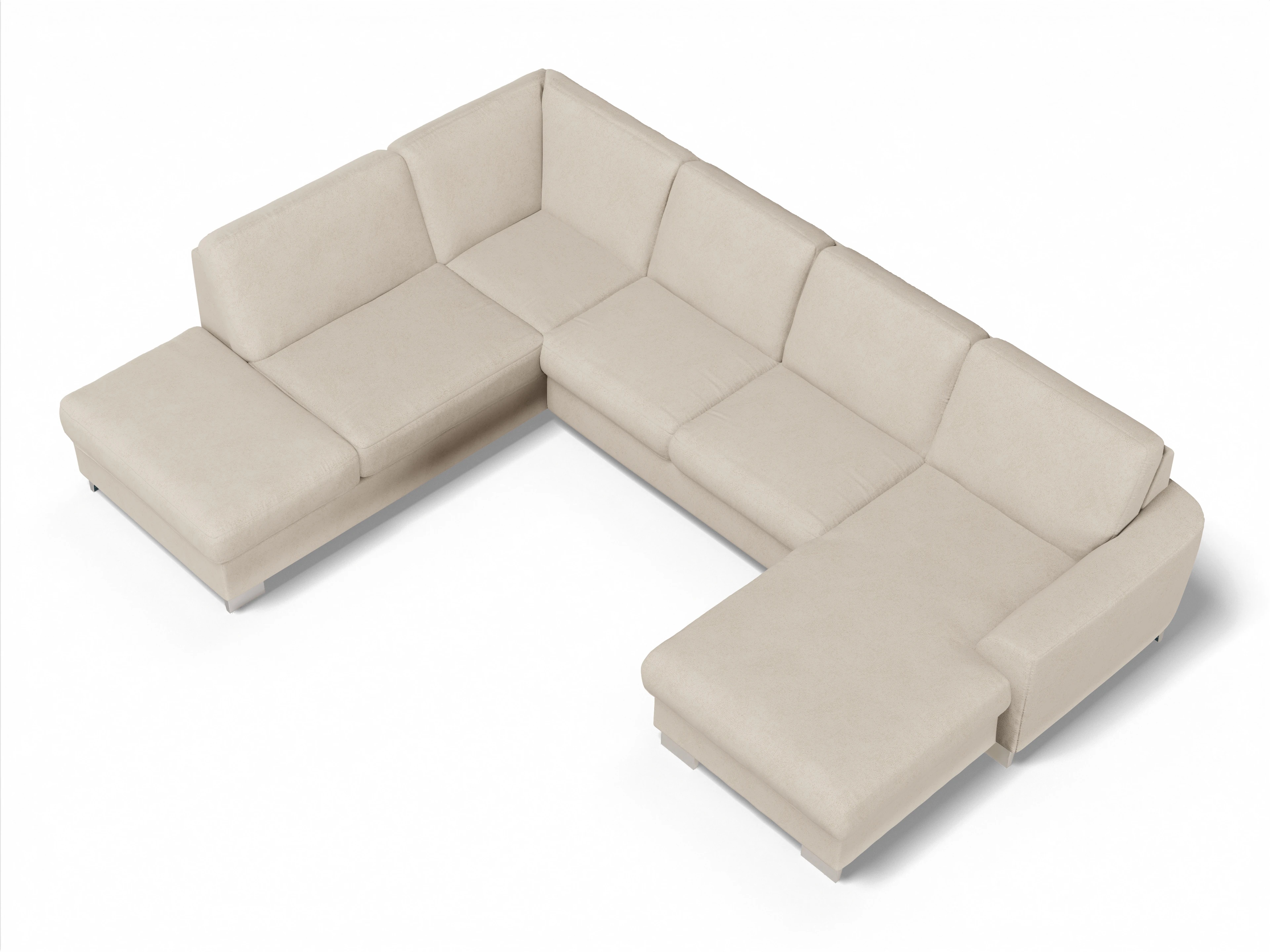 Die Wohnlandschaft besteht aus einem 1,5-Sitzer Kombielement mit Anstellhocker links, wahlweise mit Schubkasten und Stauraum, einem 2,5-Sitzer mittig, wahlweise mit Schlaffunktion und einem Canape rechts, wahlweise mit Bettkasten.