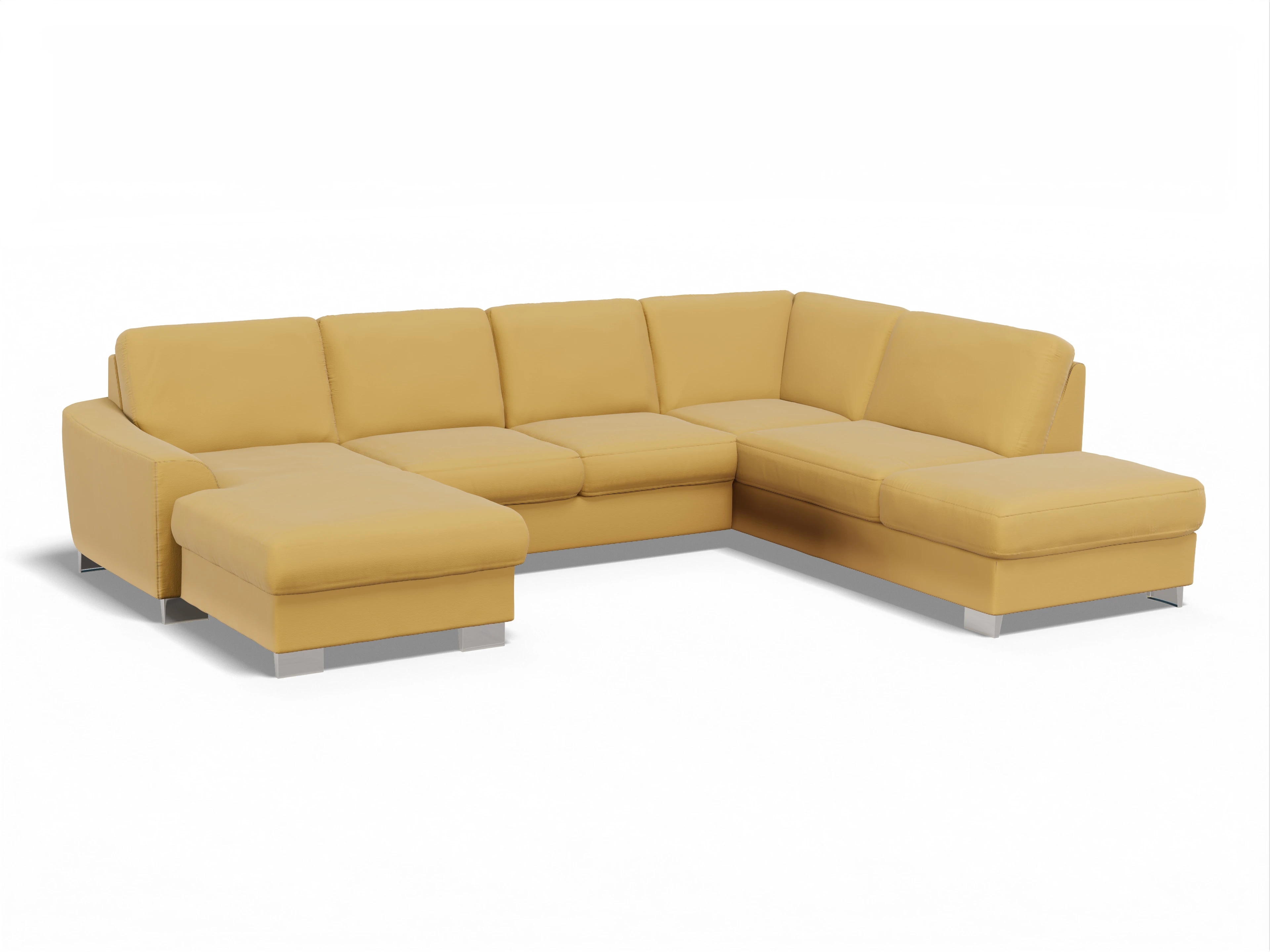 Die Wohnlandschaft besteht aus einem Canape, wahlweise mit Bettkasten, einem 2,5-Sitzer mittig, wahlweise mit Schlaffunktion und einem 1,5-Sitzer Kombielement mit Anstellhocker rechts, wahlweise mit Schubkasten und Stauraum.
