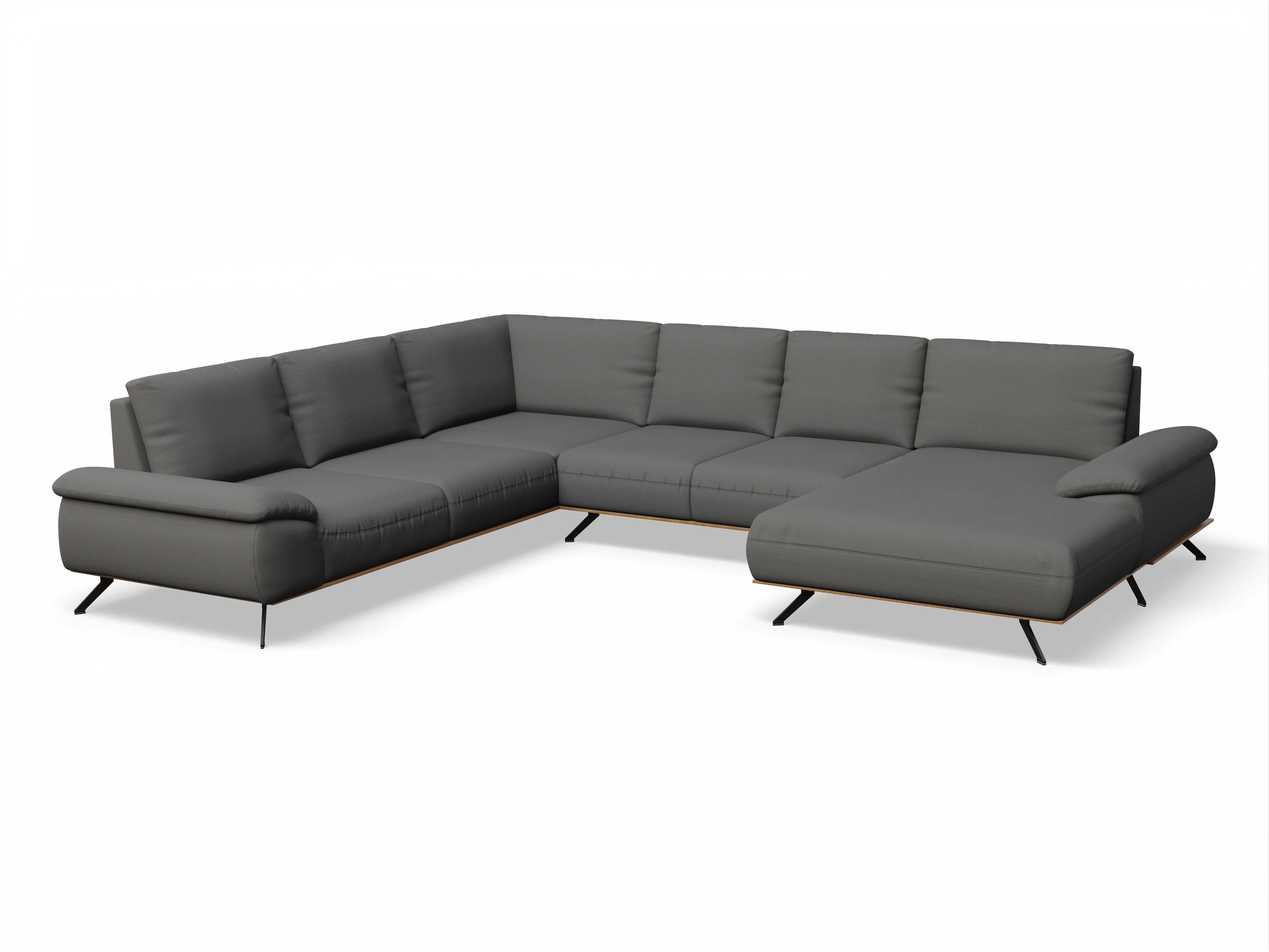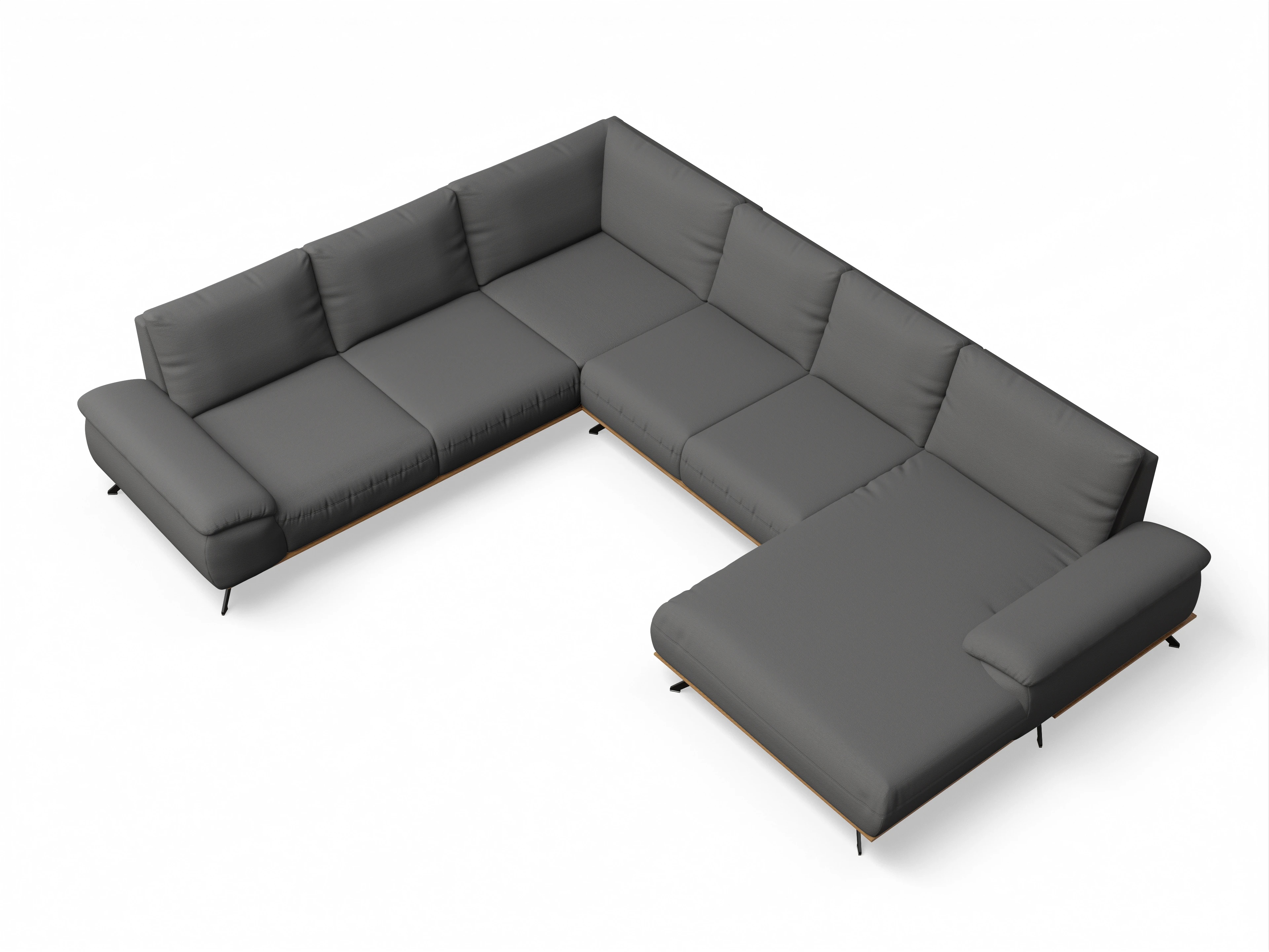 Das Ecksofa besteht aus einem 3-Sitzer mit Armlehne links, einer Spitzecke, einem 2,5-Sitzer ohne Armlehne und einem Canapé mit Armlehne rechts.
