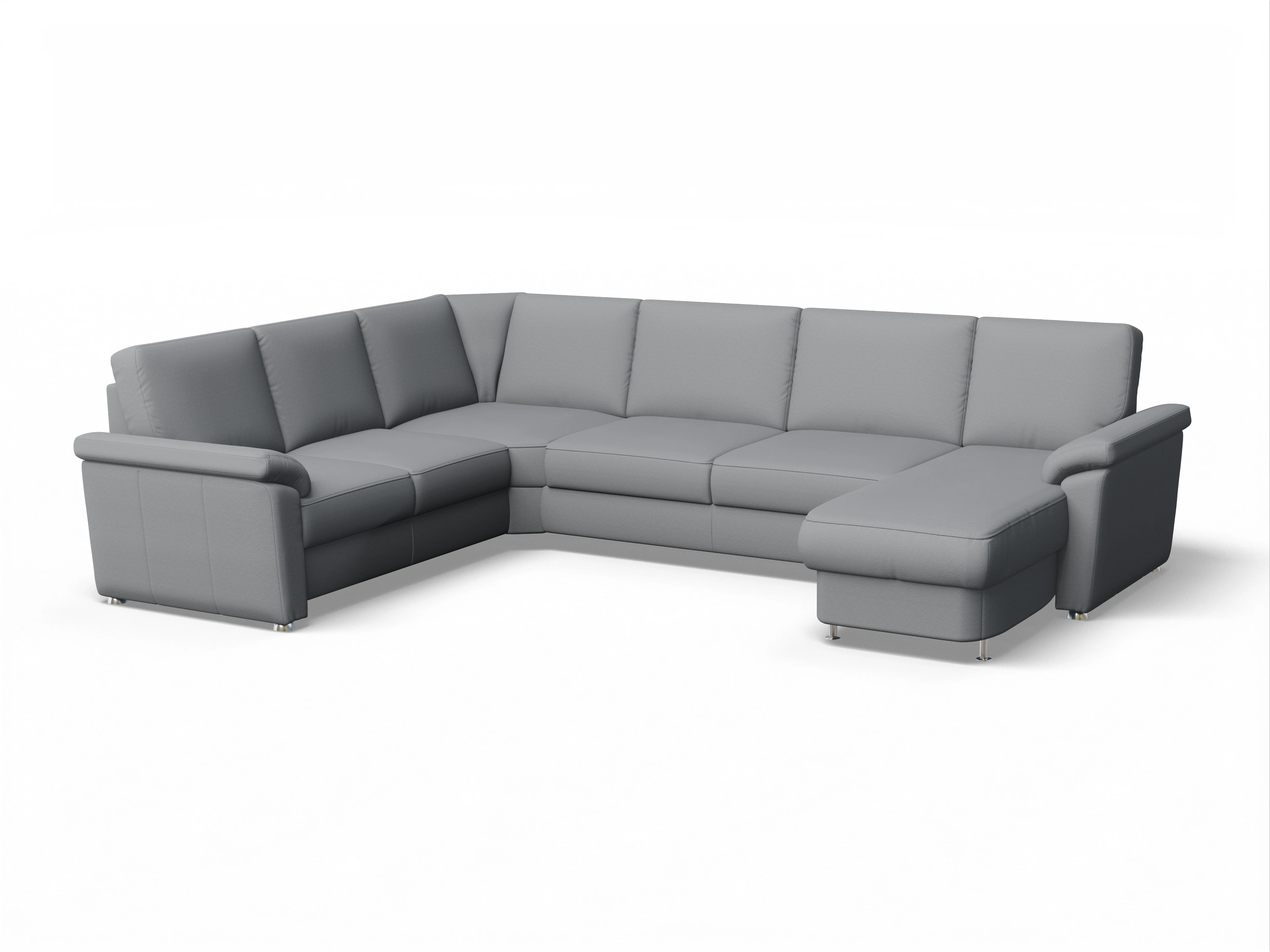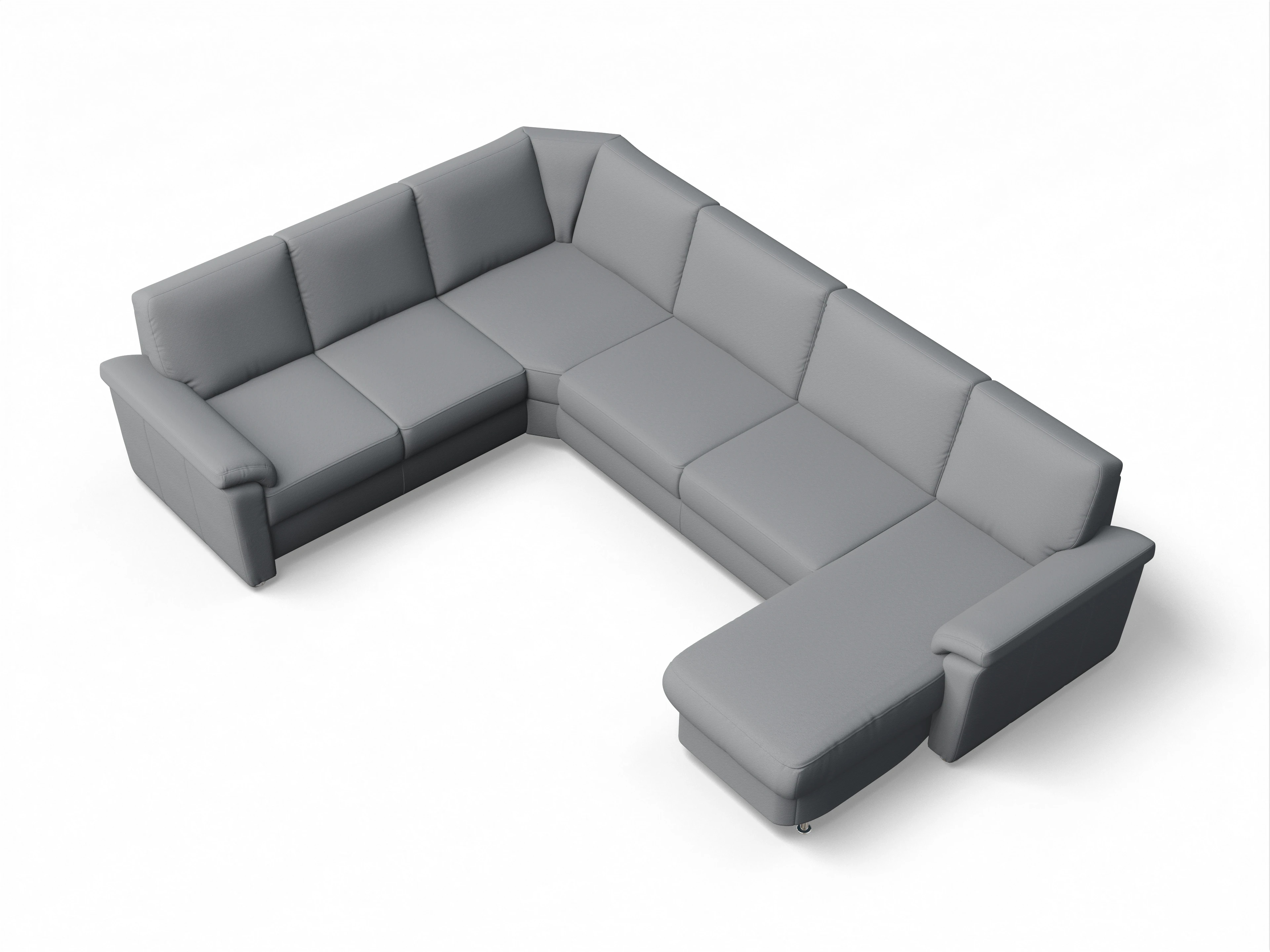 Die Wohnlandschaft besteht aus einem 2-Sitzer mit Armlehne links, einer Rundecke, einem 2,5-Sitzer mittig sowie einem Canape mit Armlehne rechts, wahlweise mit Stauraum.