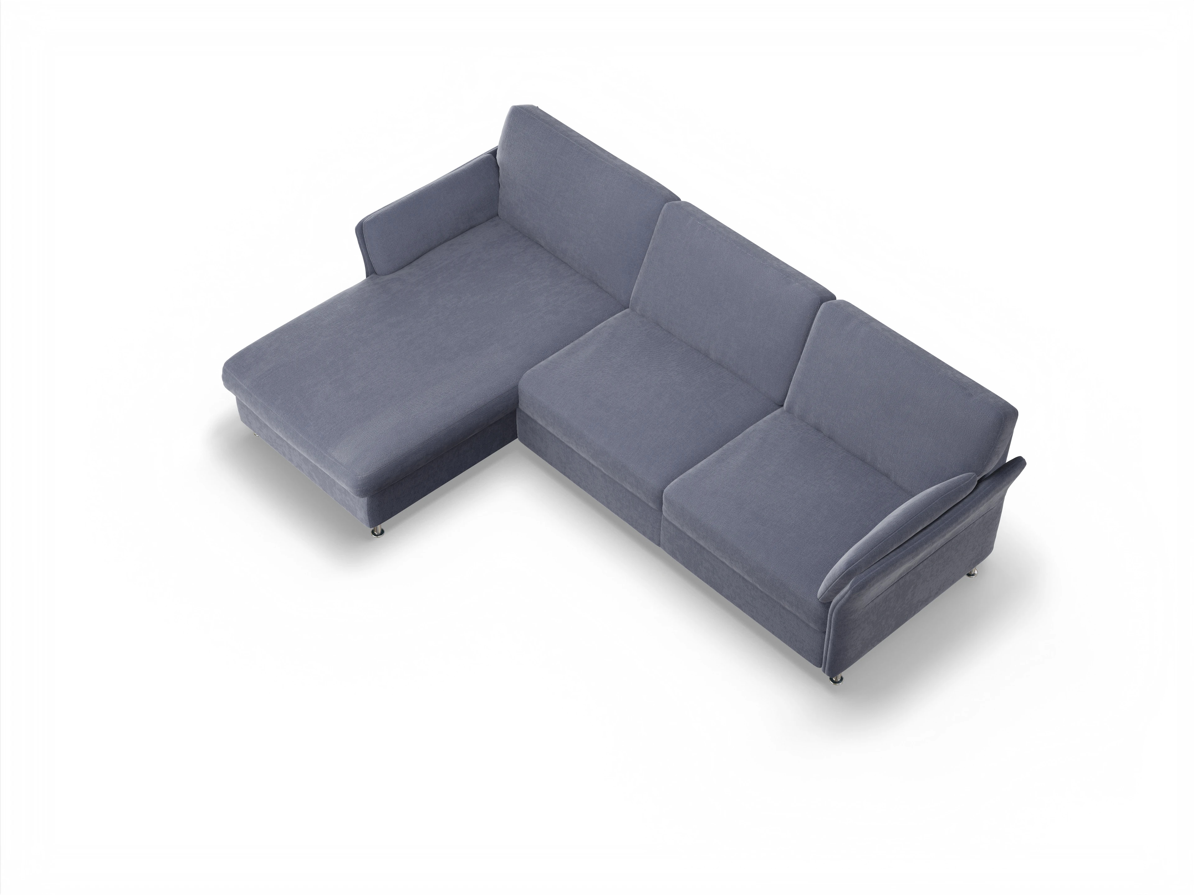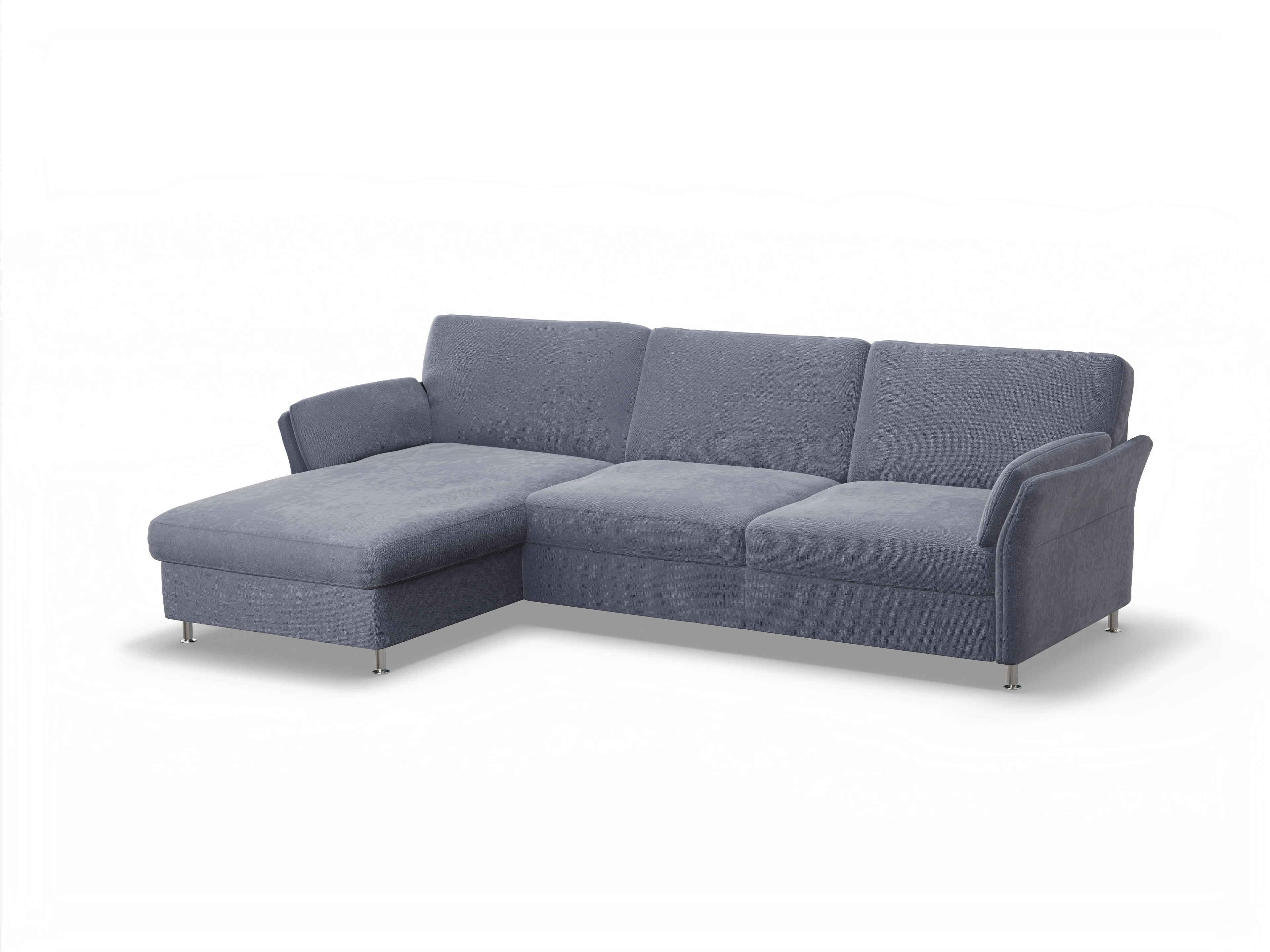 Das Ecksofa besteht aus einem Canape mit einer Armlehne links, wahlweise mit Stauraum und einem 3-Sitzer mit einer Armlehne rechts, wahlweise mit Schlaffunktion oder Relaxfunktion.