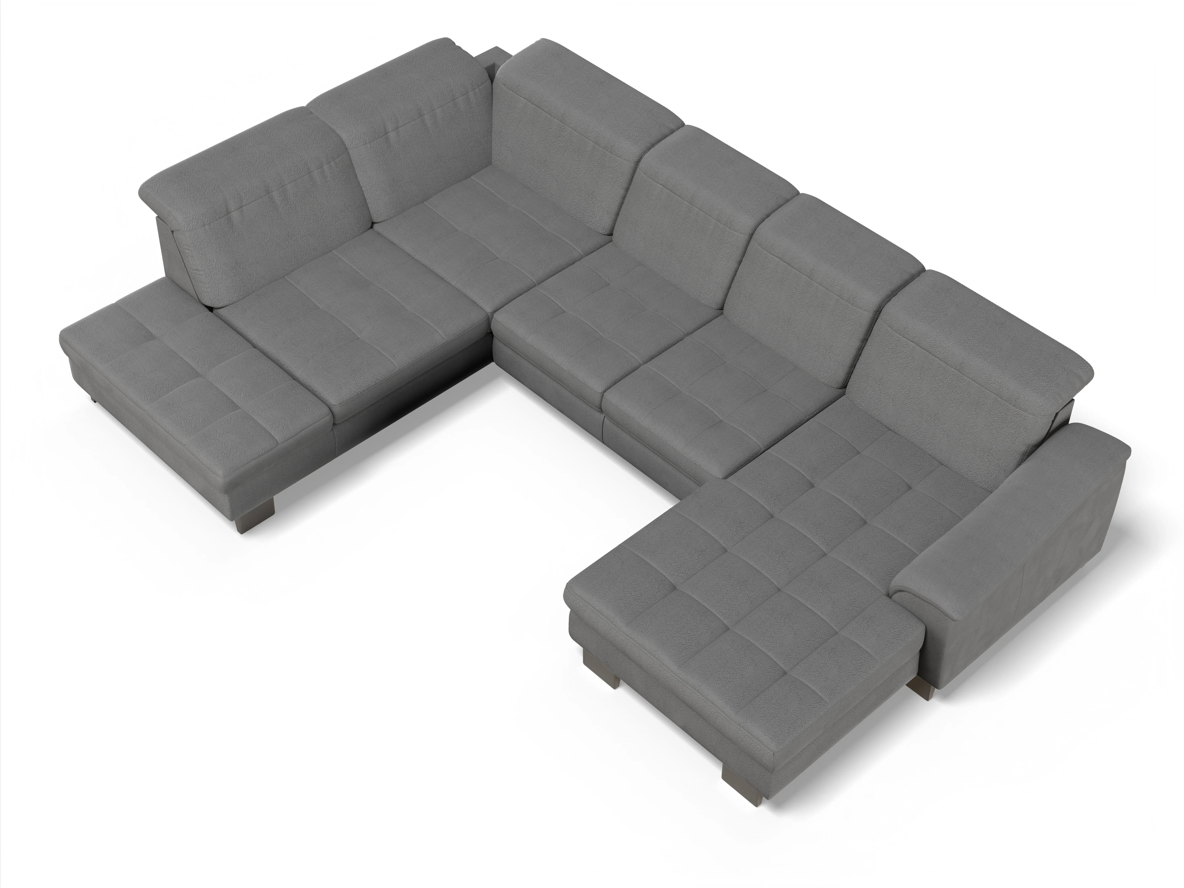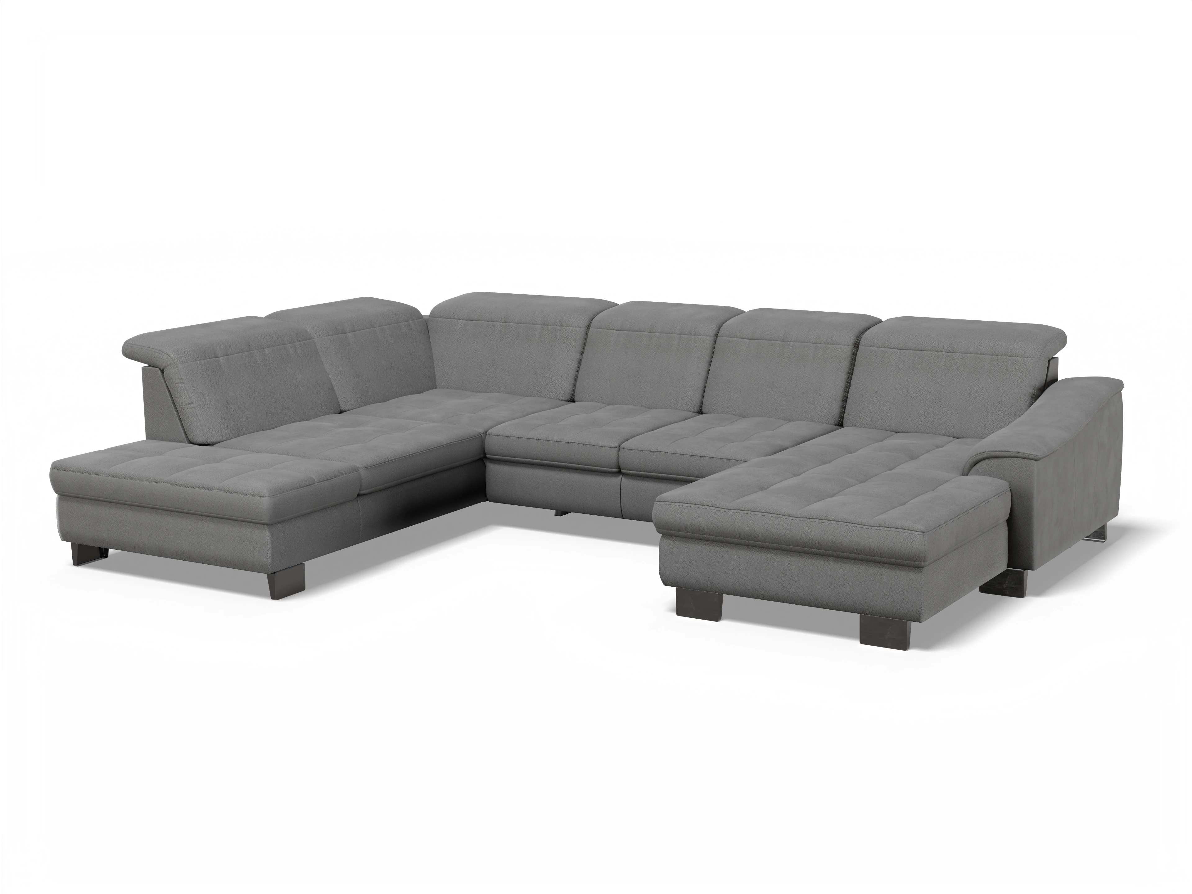 Die Wohnlandschaft besteht aus einem 1,5-Sitzer Kombielement mit Anstellhocker links, einem 2,5-Sitzer mittig und einem Canape rechts. Die Kopfpolsterverstellung kommt inklusive dazu.