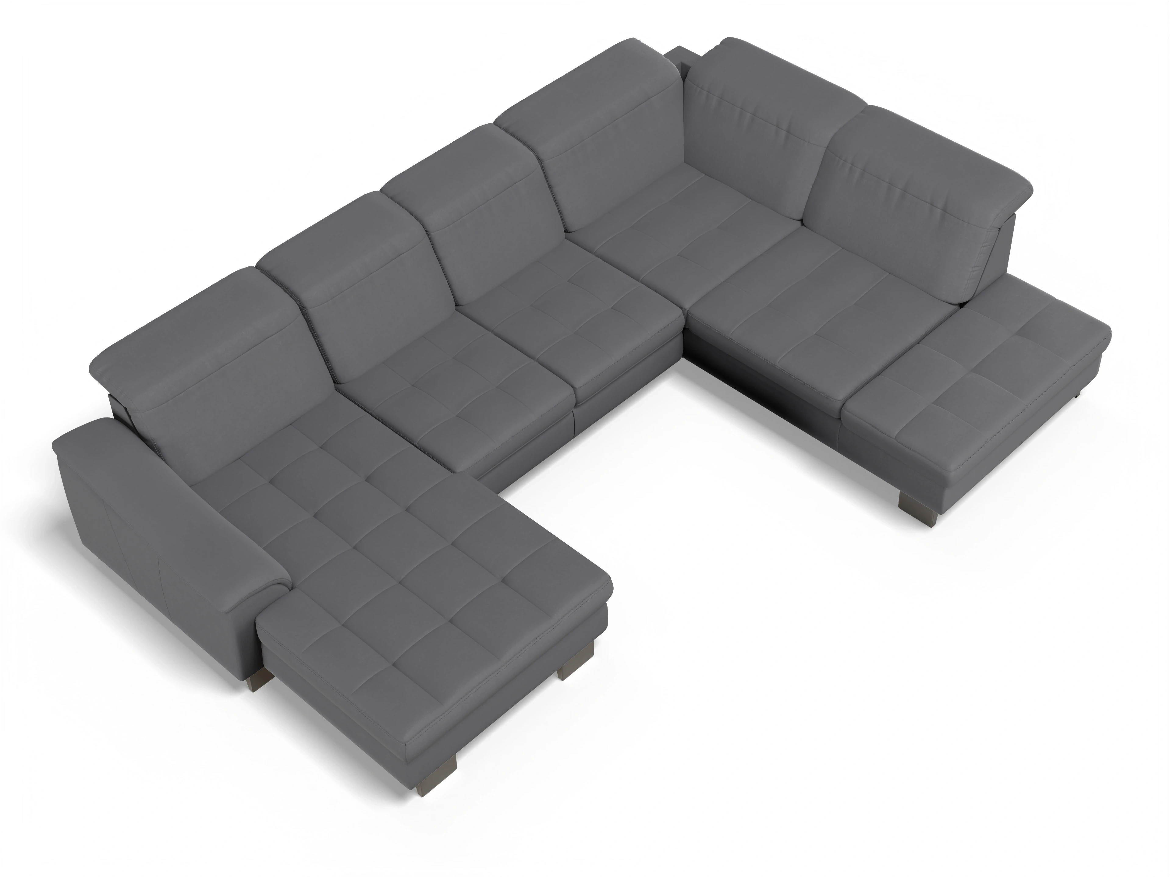 Die Wohnlandschaft besteht aus einem Canape, einem 2,5-Sitzer mittig und einem 1,5-Sitzer Kombielement mit Anstellhocker rechts. Die Kopfpolsterverstellung kommt inklusive dazu.